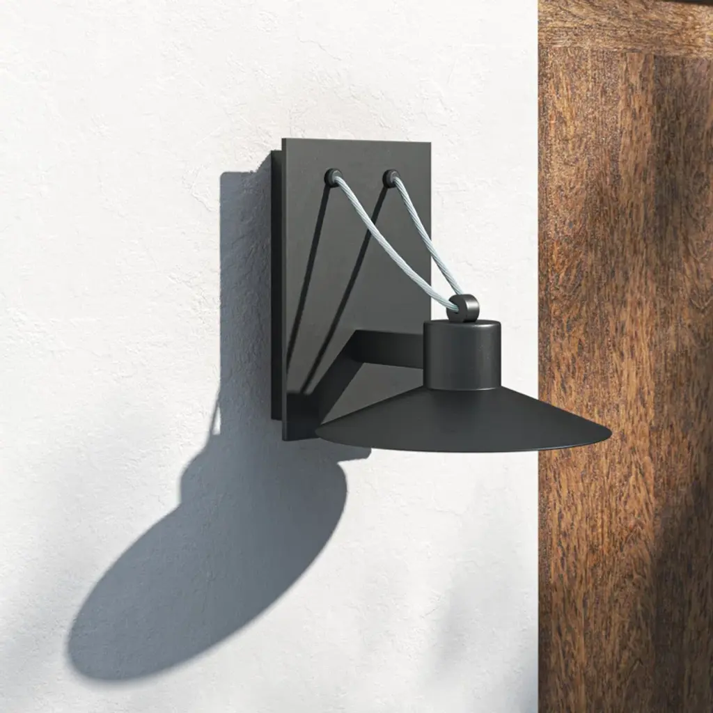 Elevate the classics This outdoor wall light keeps your space bright with an updated take on a lantern. Crafted from resilient metal, it features a square backplate and a flat cone shade, both in a dark bronze tone. The shade is supported by a slim arm, with a loop of rope running between the backplate and the top for a retro look with material contrast. An integrated LED bulb shines from the bottom of the shade, complementing the streamlined look. This fixture is rated for wet spaces, so it stands up to direct moisture.