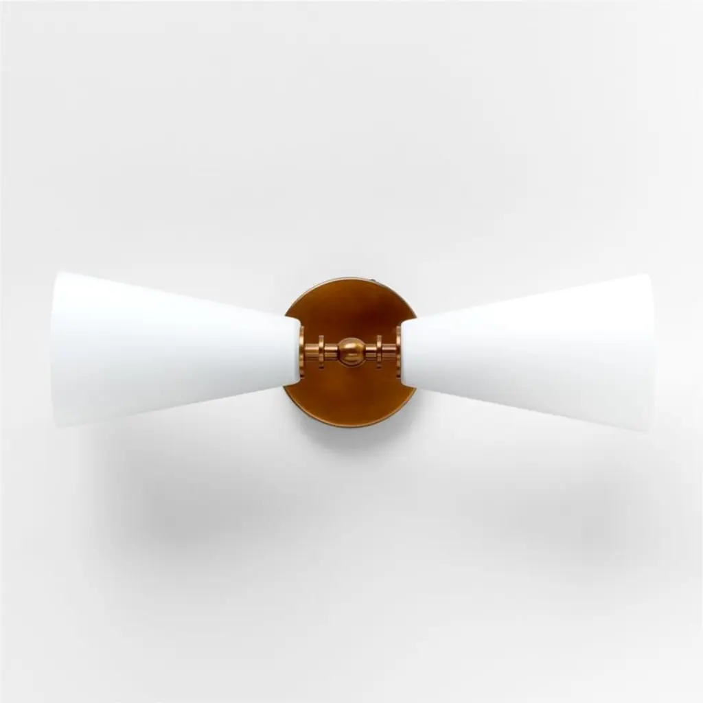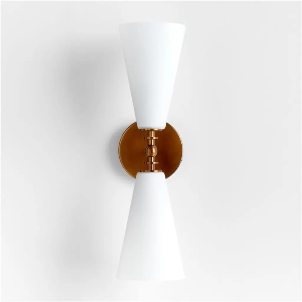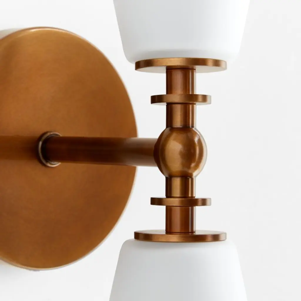 Inspired by both vintage and mid-century modern designs, our Saintes sconce pairs a burnished brass base with retro tapered shades in fresh white. A sculptural turned arm supports two slender cones of frosted glass that filter light softly. Designed to be oriented vertically or horizontally, this versatile sconce is a perfect fit above a sink, flanking a bathroom mirror or lining a hallway.