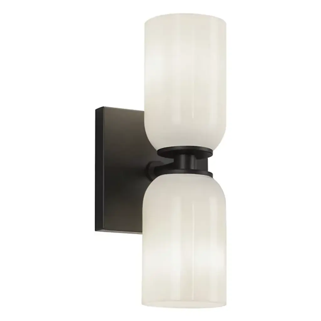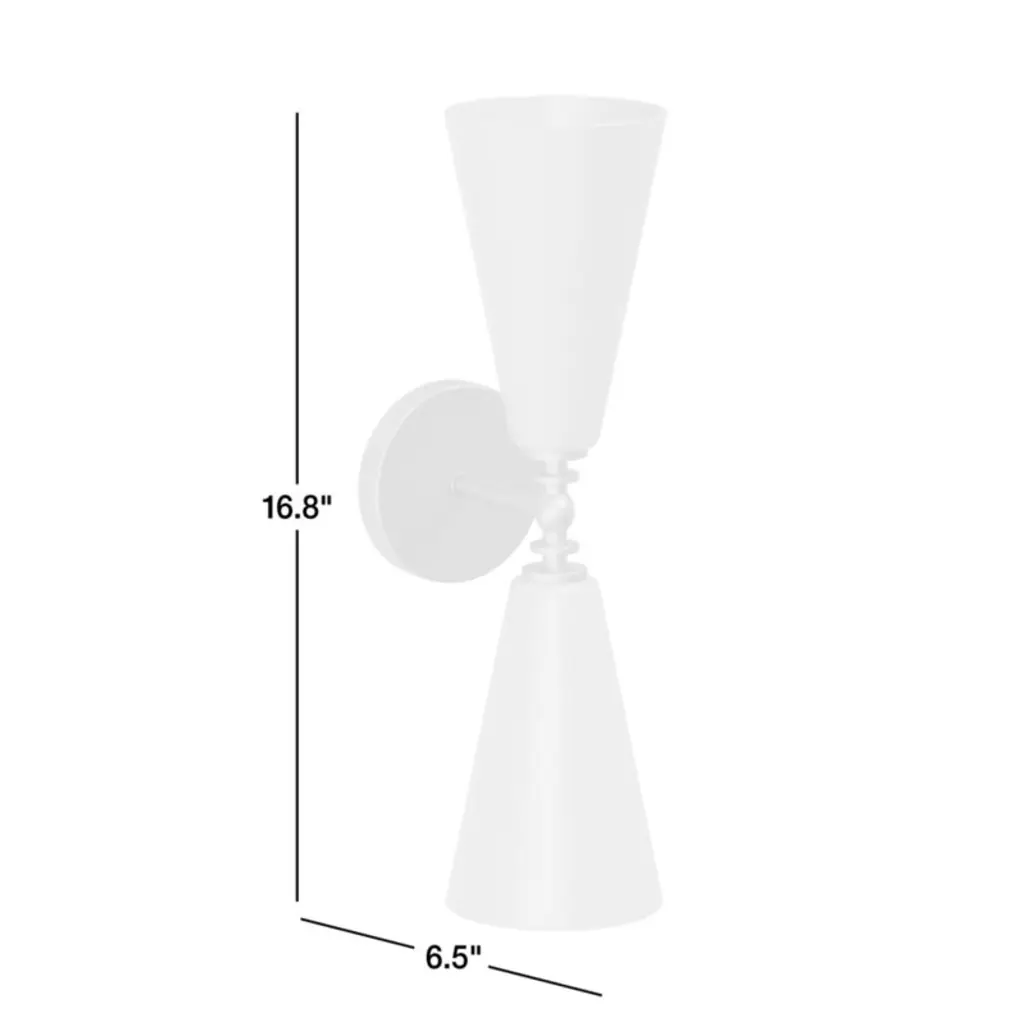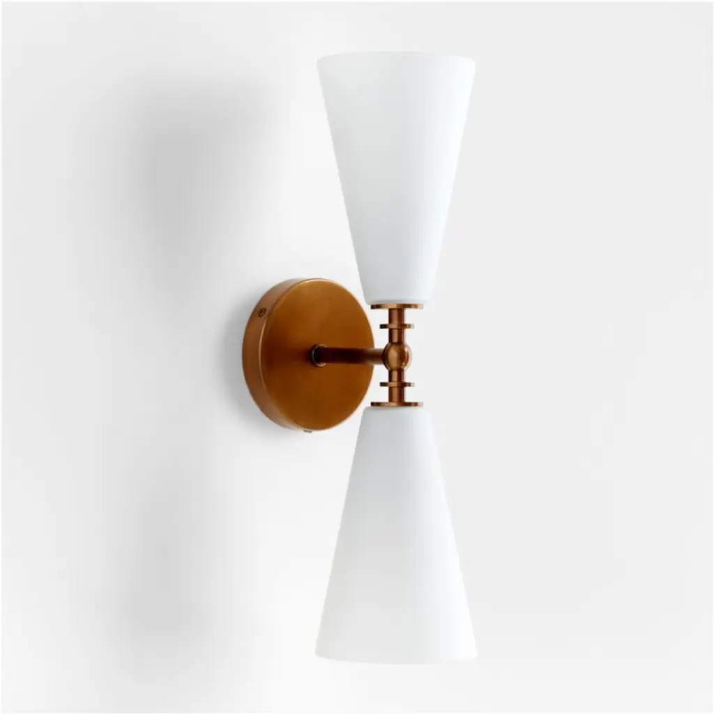 Inspired by both vintage and mid-century modern designs, our Saintes sconce pairs a burnished brass base with retro tapered shades in fresh white. A sculptural turned arm supports two slender cones of frosted glass that filter light softly. Designed to be oriented vertically or horizontally, this versatile sconce is a perfect fit above a sink, flanking a bathroom mirror or lining a hallway.