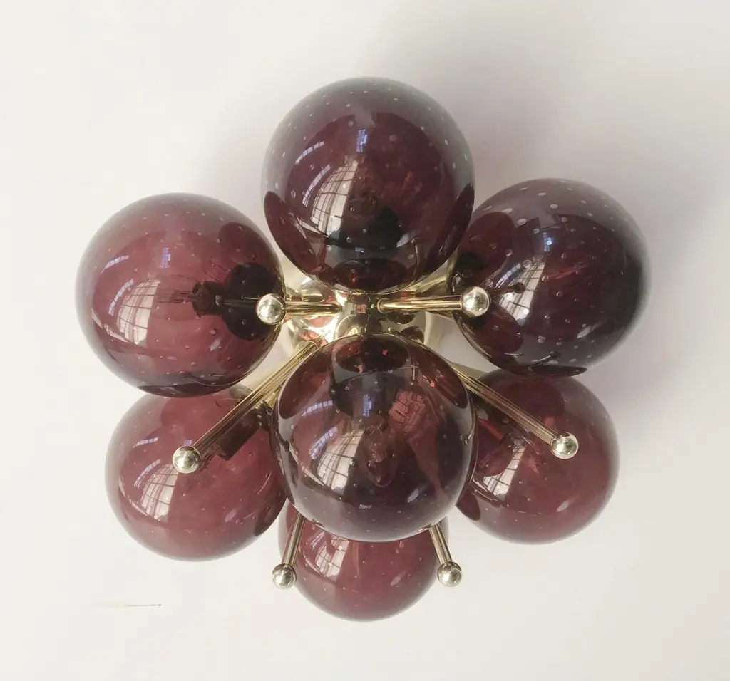 Italian flush mount with Murano glass globes mounted on solid brass frameDesigned by Fabio Bergomi / Made in Italy7 lights / E12 or E14 type / max 40W eachDiameter: 22 inches / Height: 11 inchesOrder only / This item ships from ItalyOrder Reference #: FABIOLTD SAKURAThe listed price applies to all Brass finishes : Unlacquered Natural Brass, Unlacquered Polished Brass, Lacquered Polished Brass, Lacquered Satin BrassOther finishes available with upcharge of $200 : Bronzed, Polished Chrome, Satin Chrome, Polished Nickel, Satin Nickel, Polished Black Nickel, Satin Black Nickel, Polished Copper, Satin Copper