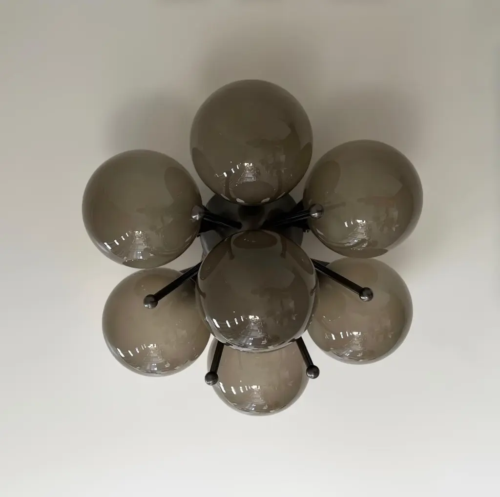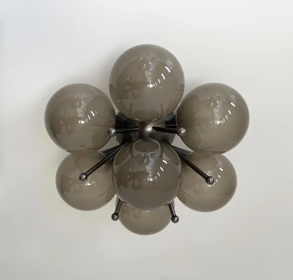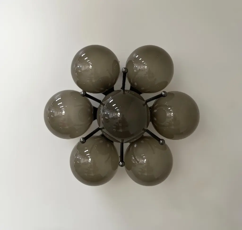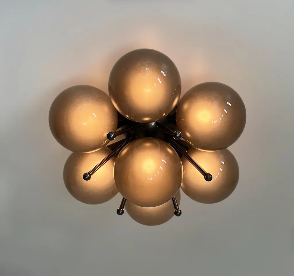 Italian flush mount with Murano glass globes mounted on solid brass frameDesigned by Fabio Bergomi / Made in Italy7 lights / E12 or E14 type / max 40W eachDiameter: 22 inches / Height: 11 inchesOrder only / This item ships from ItalyOrder Reference #: FABIOLTD SAKURAThe listed price applies to the following finishes : Bronzed, Polished Chrome, Satin Chrome, Polished Nickel, Satin Nickel, Polished Black Nickel, Satin Black Nickel, Polished Copper, Satin CopperOther finishes available : Unlacquered Natural Brass, Unlacquered Polished Brass, Lacquered Polished Brass, Lacquered Satin Brass