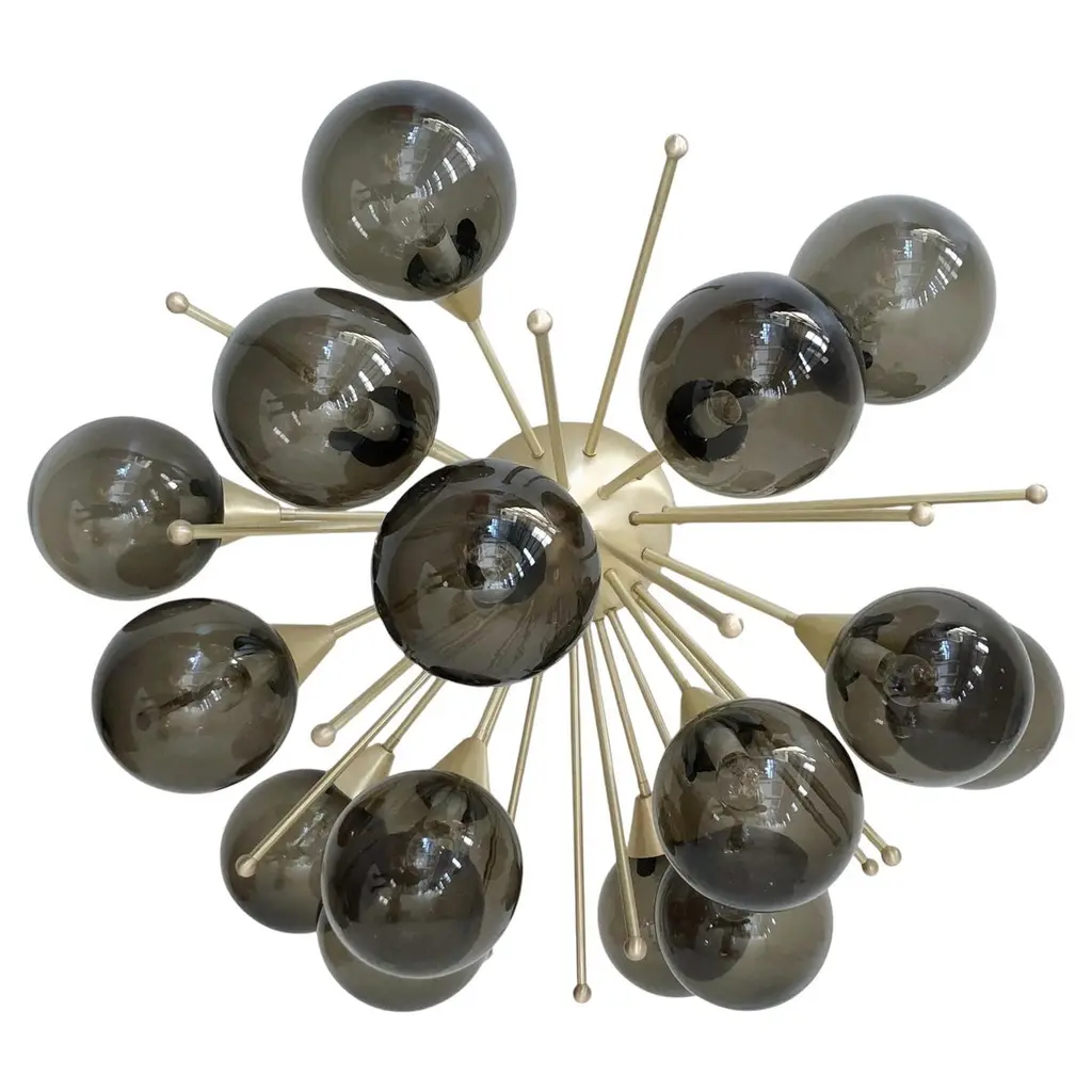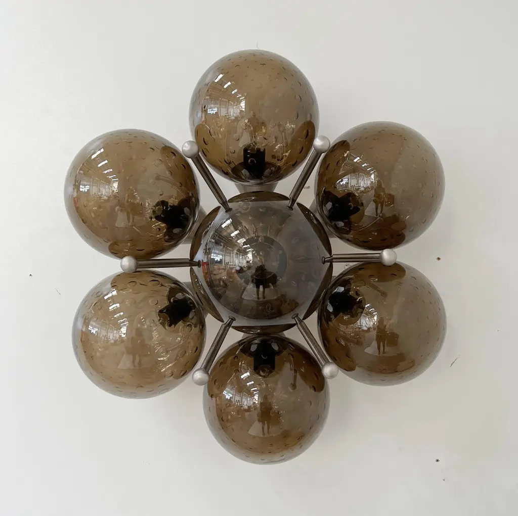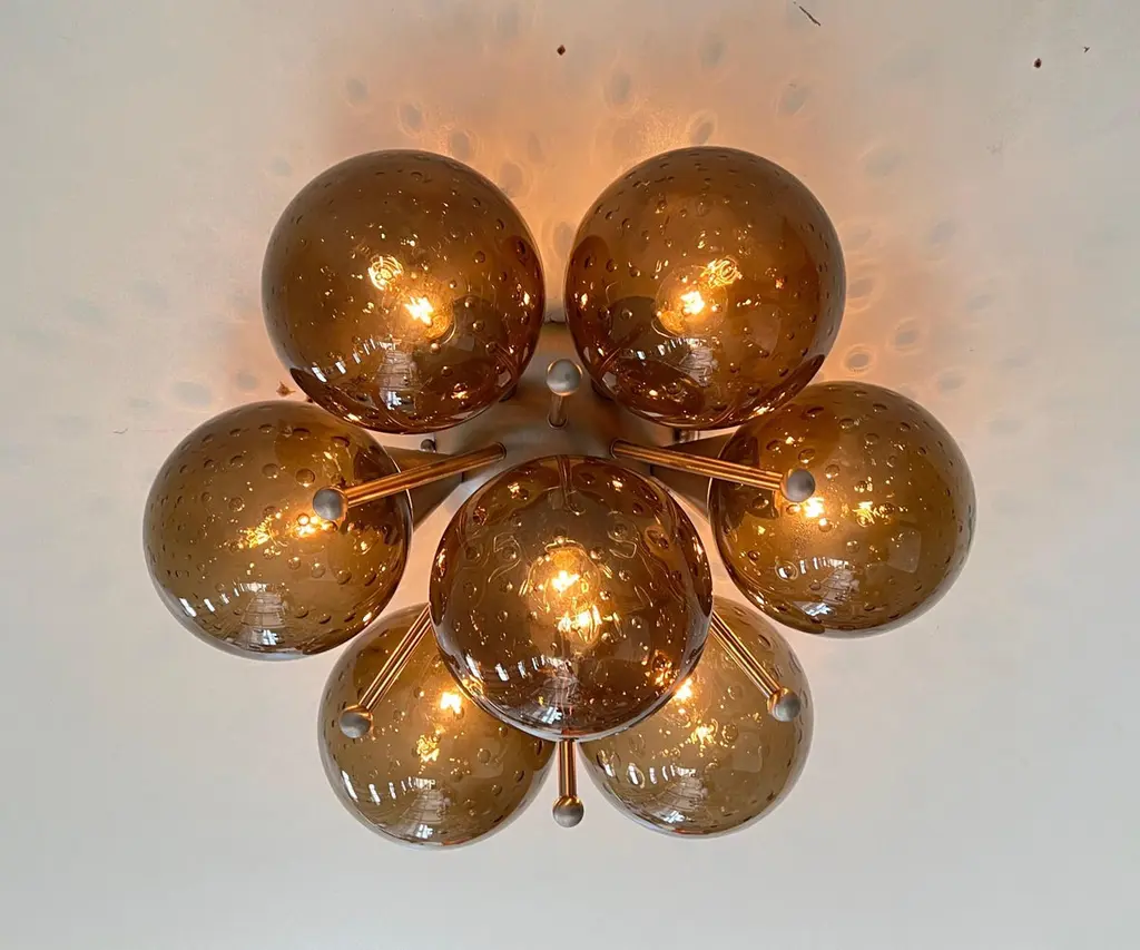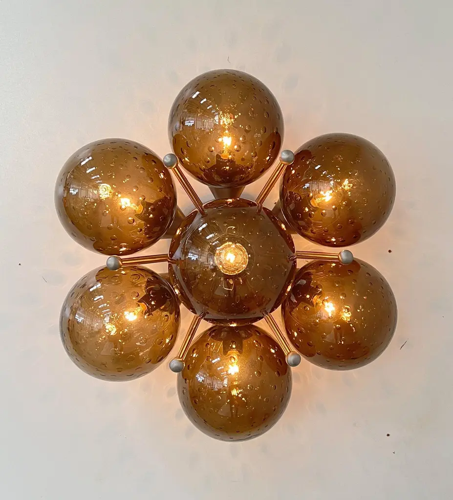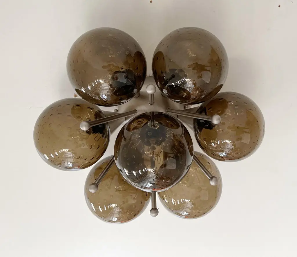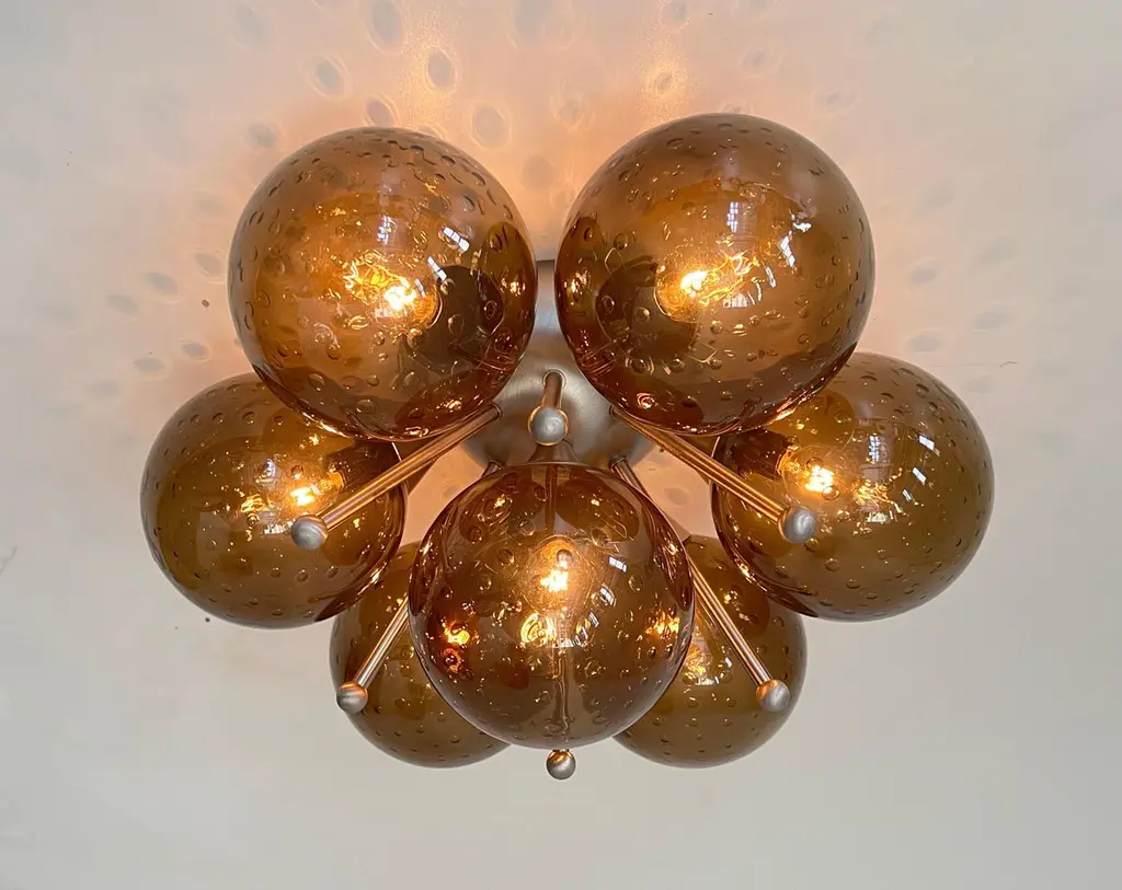 Italian flush mount with Murano glass globes mounted on solid brass frameDesigned by Fabio Bergomi / Made in Italy7 lights / E12 or E14 type / max 40W eachDiameter: 22 inches / Height: 11 inchesOrder only / This item ships from ItalyOrder Reference #: FABIOLTD SAKURAThe listed price applies to the following finishes : Bronzed, Polished Chrome, Satin Chrome, Polished Nickel, Satin Nickel, Polished Black Nickel, Satin Black Nickel, Polished Copper, Satin CopperOther finishes are available : Unlacquered Natural Brass, Unlacquered Polished Brass, Lacquered Polished Brass, Lacquered Satin Brass