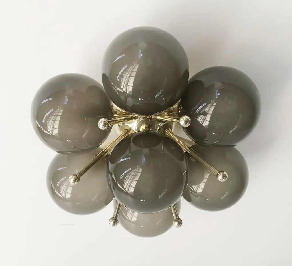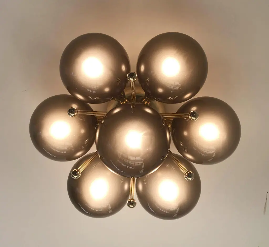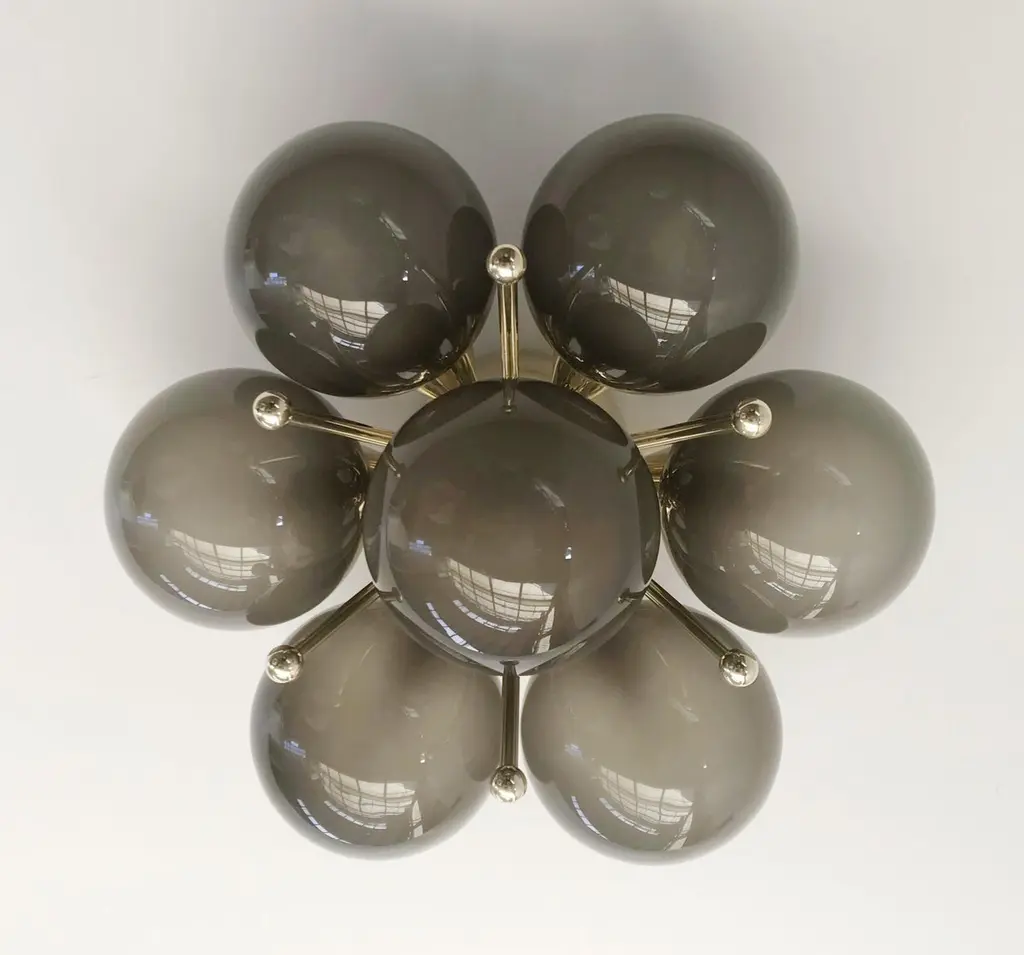 Italian flush mount with Murano glass globes mounted on solid brass frameDesigned by Fabio Bergomi / Made in Italy7 lights / E12 or E14 type / max 40W eachDiameter: 22 inches / Height: 11 inchesOrder only / This item ships from ItalyOrder Reference #: FABIOLTD SAKURAThe listed price applies to all Brass finishes : Unlacquered Natural Brass, Unlacquered Polished Brass, Lacquered Polished Brass, Lacquered Satin BrassOther finishes available with upcharge of $200: Bronzed, Polished Chrome, Satin Chrome, Polished Nickel, Satin Nickel, Polished Black Nickel, Satin Black Nickel, Polished Copper, Satin Copper