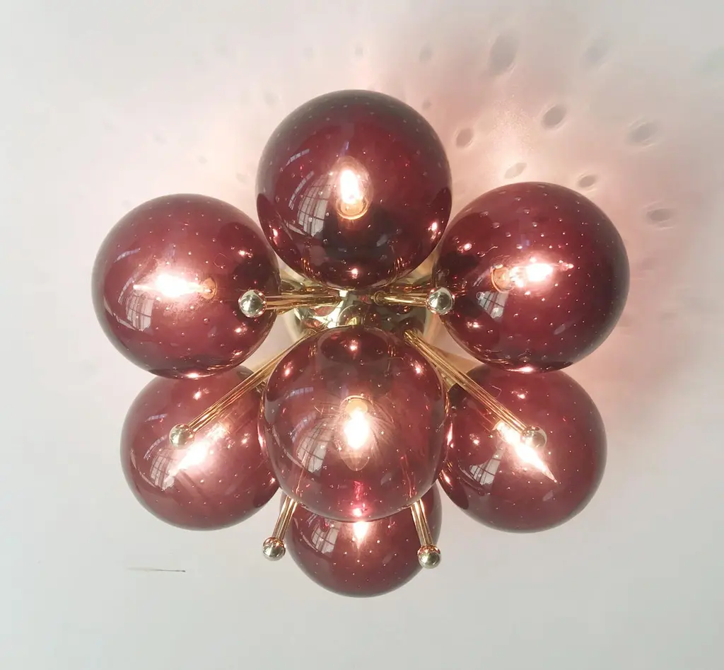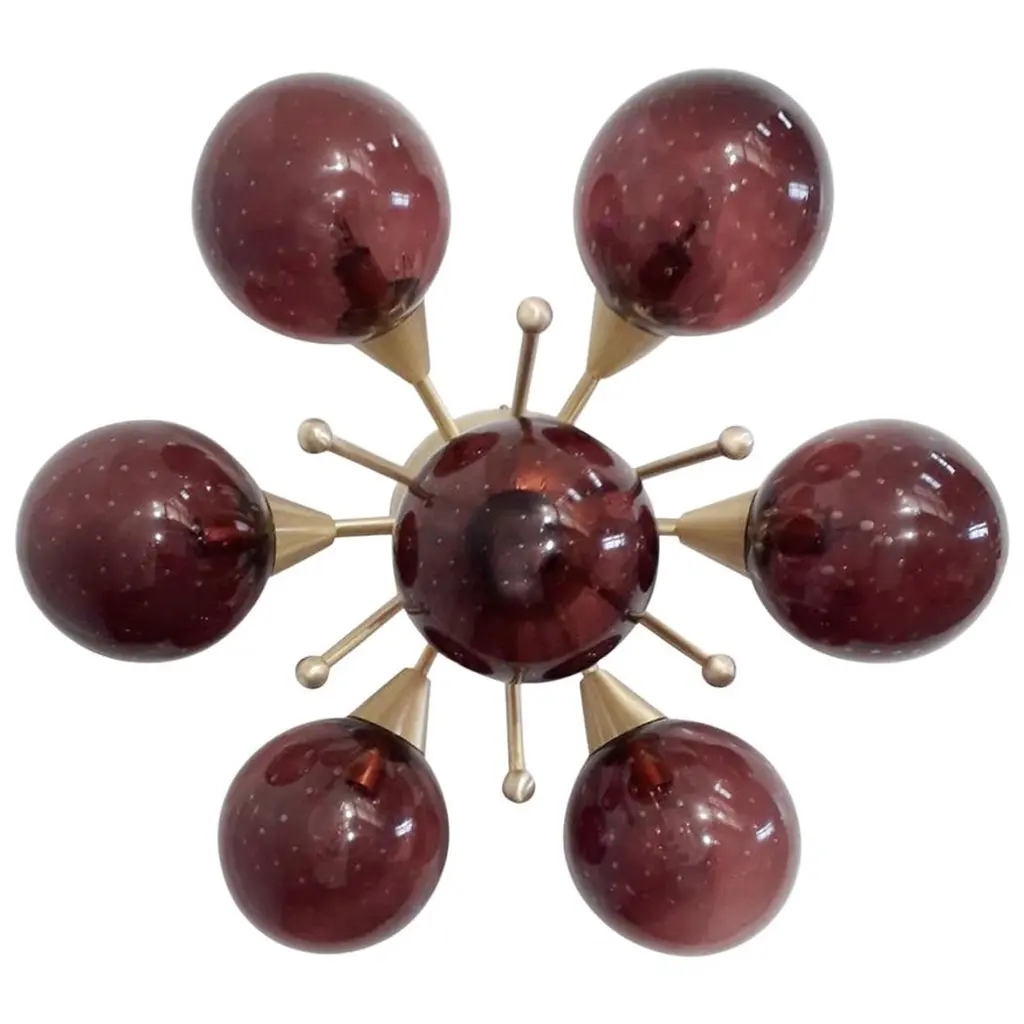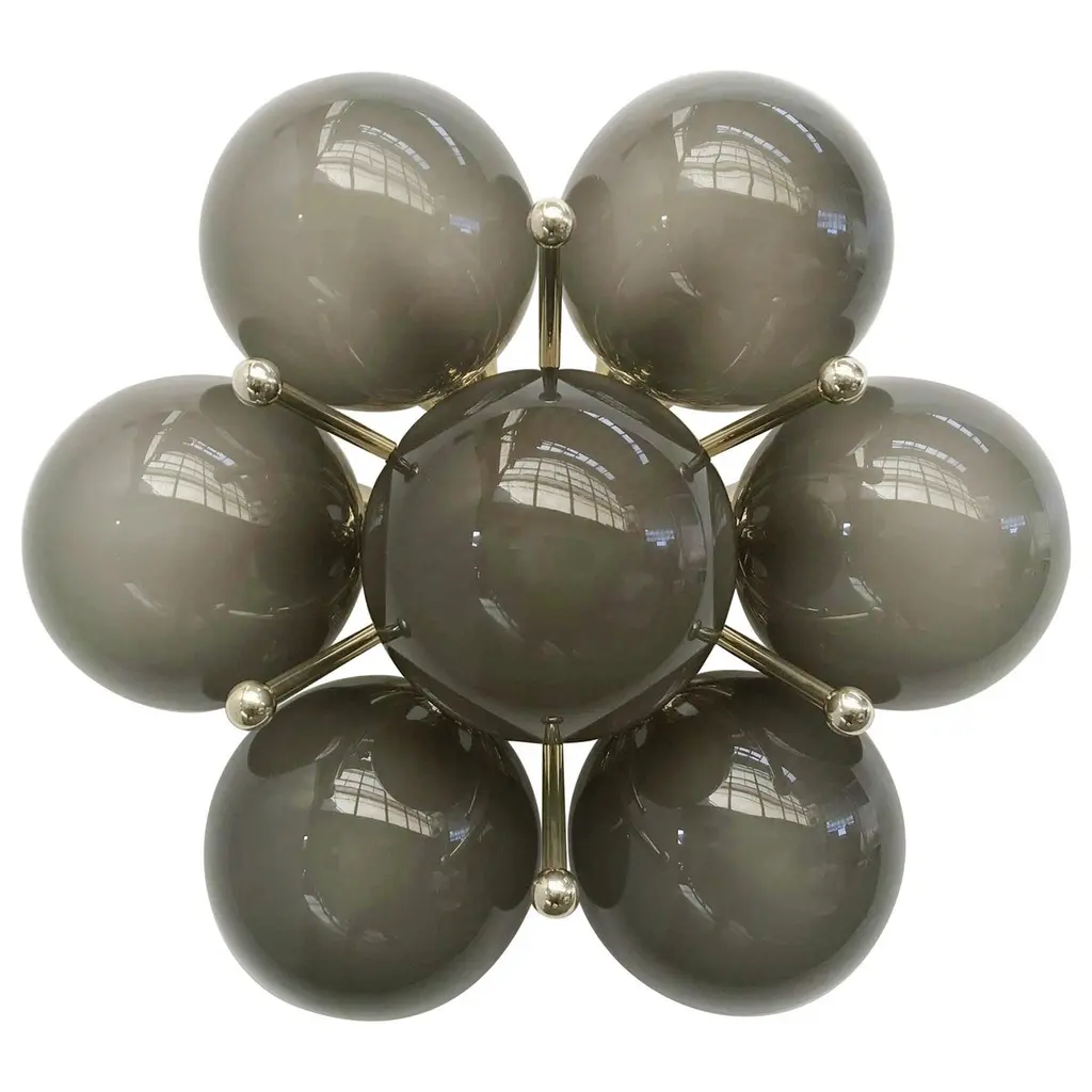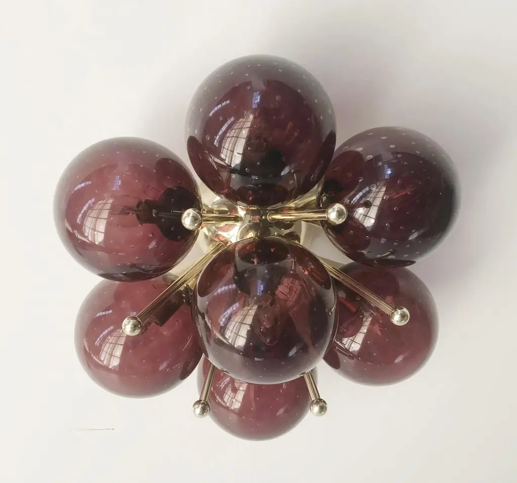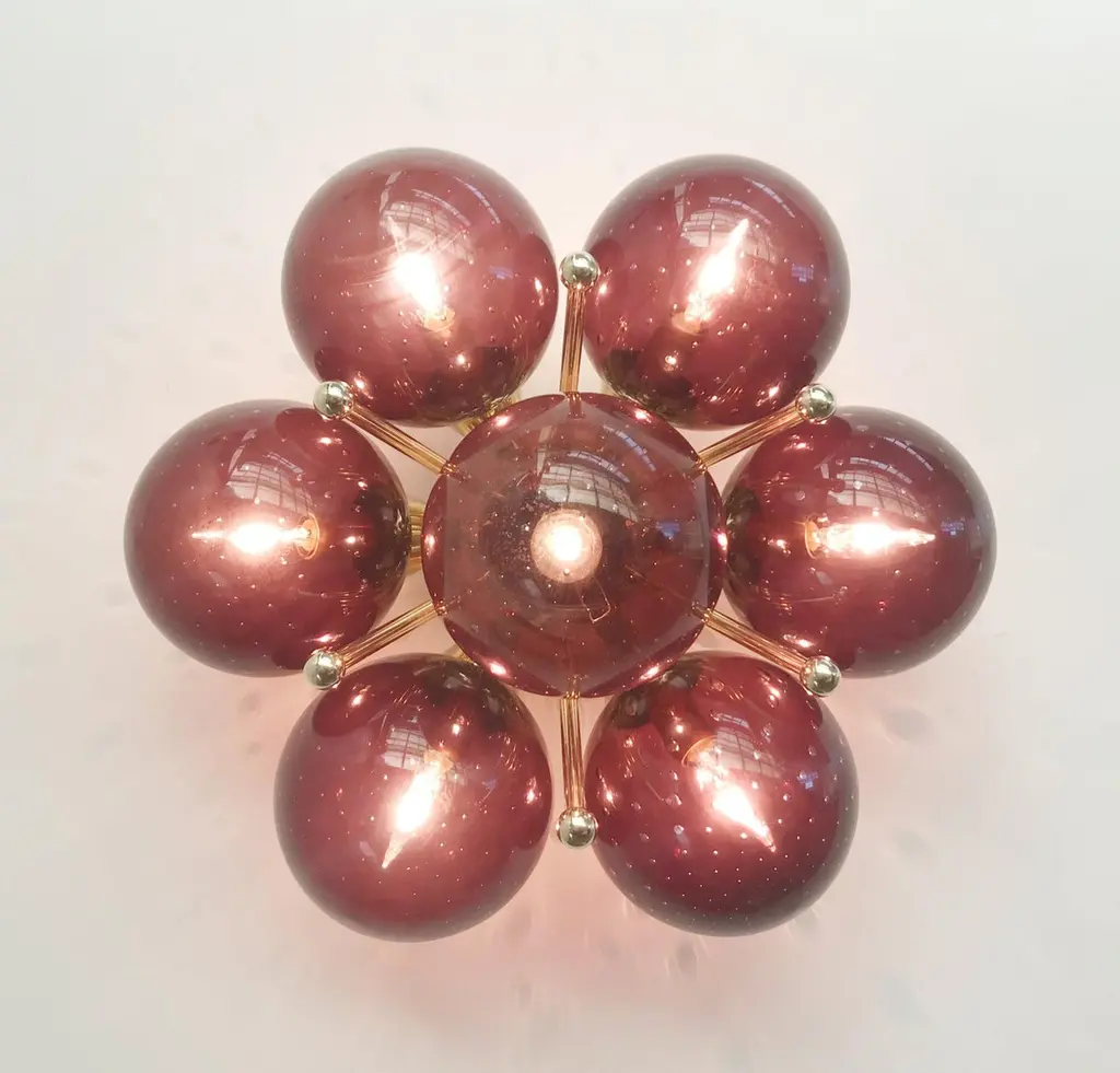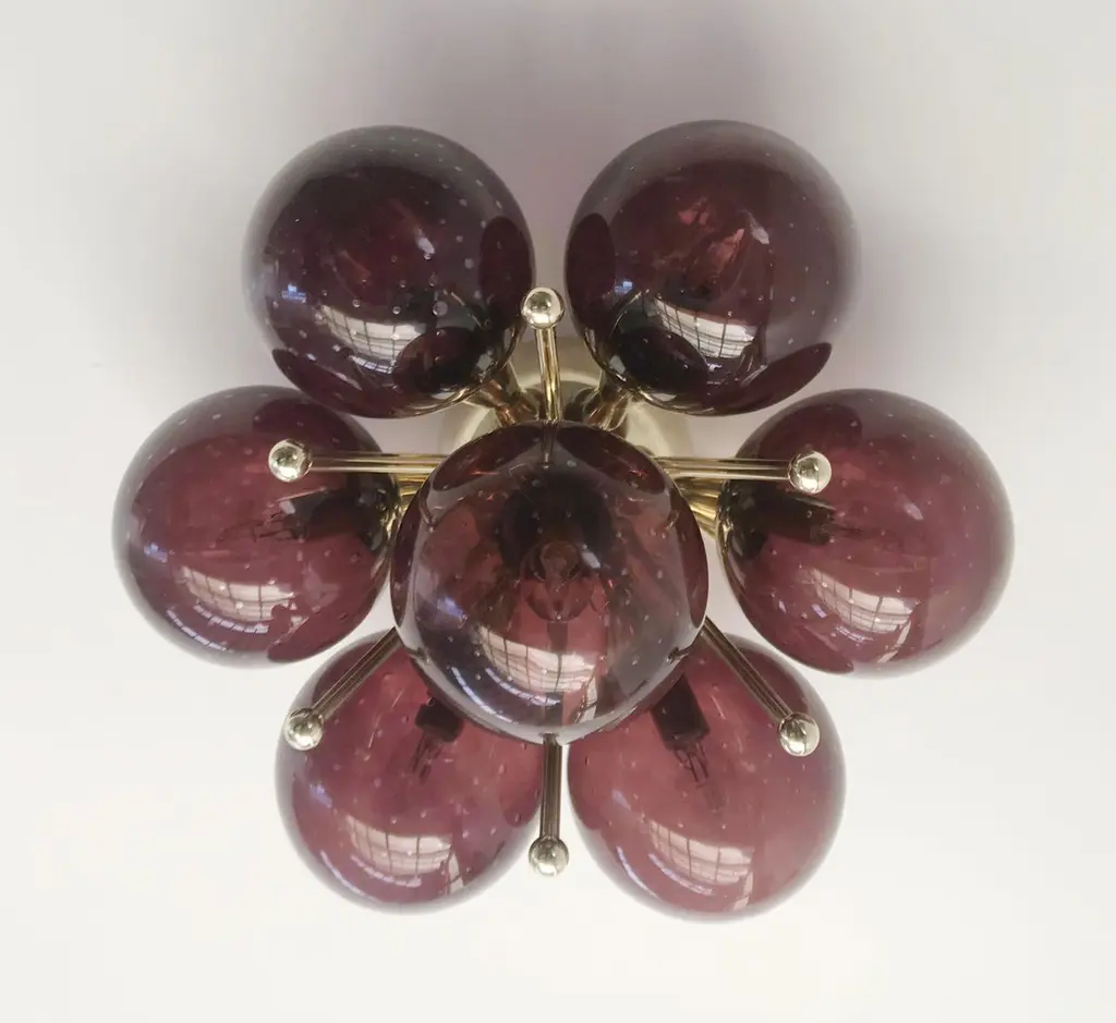 Italian flush mount with Murano glass globes mounted on solid brass frameDesigned by Fabio Bergomi / Made in Italy7 lights / E12 or E14 type / max 40W eachDiameter: 22 inches / Height: 11 inchesOrder only / This item ships from ItalyOrder Reference #: FABIOLTD SAKURAThe listed price applies to all Brass finishes : Unlacquered Natural Brass, Unlacquered Polished Brass, Lacquered Polished Brass, Lacquered Satin BrassOther finishes available with upcharge of $200: Bronzed, Polished Chrome, Satin Chrome, Polished Nickel, Satin Nickel, Polished Black Nickel, Satin Black Nickel, Polished Copper, Satin Copper