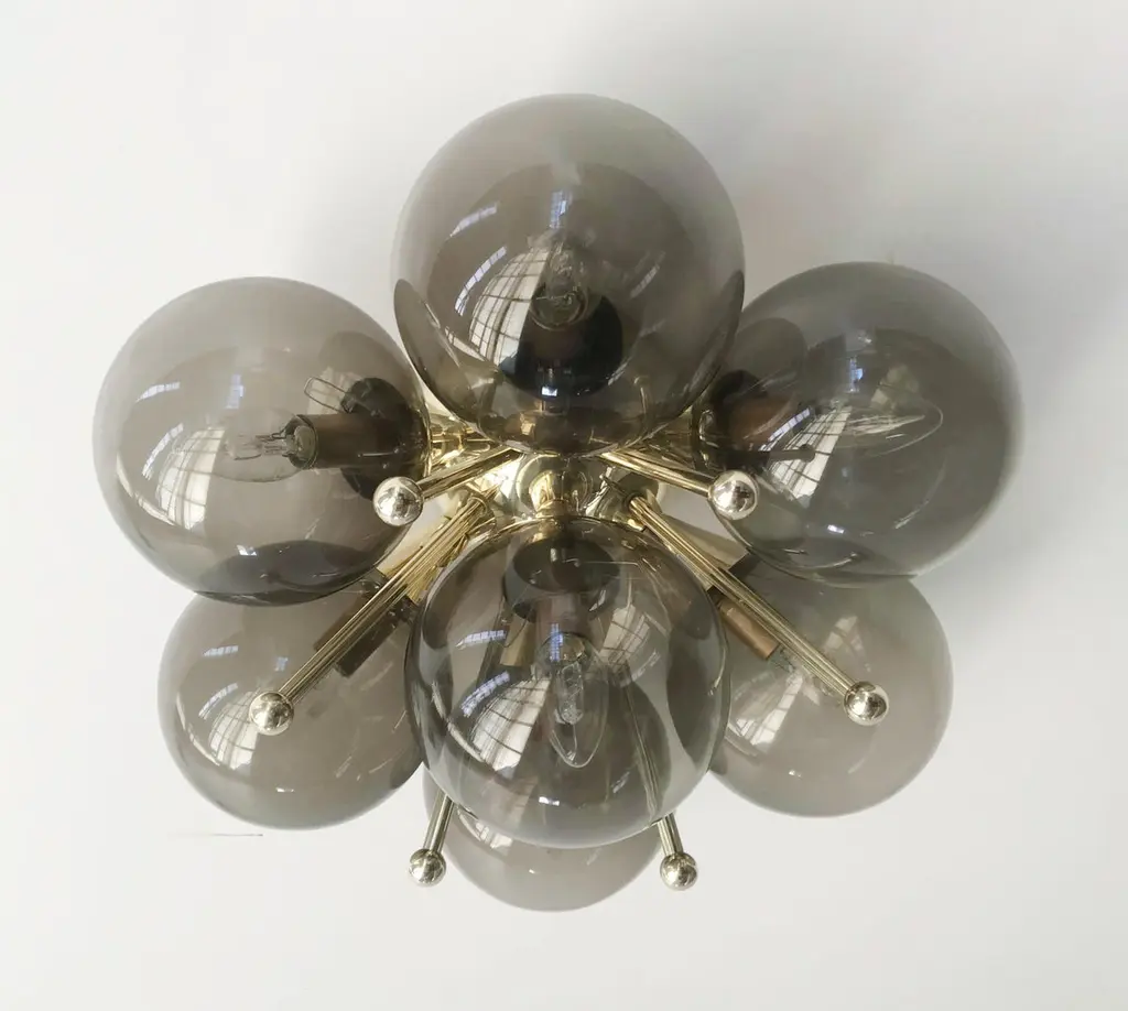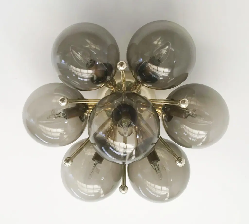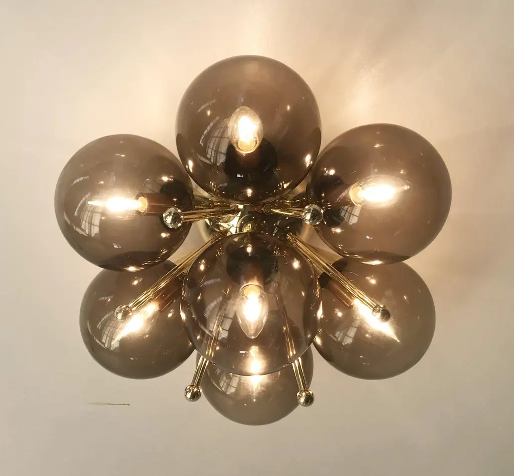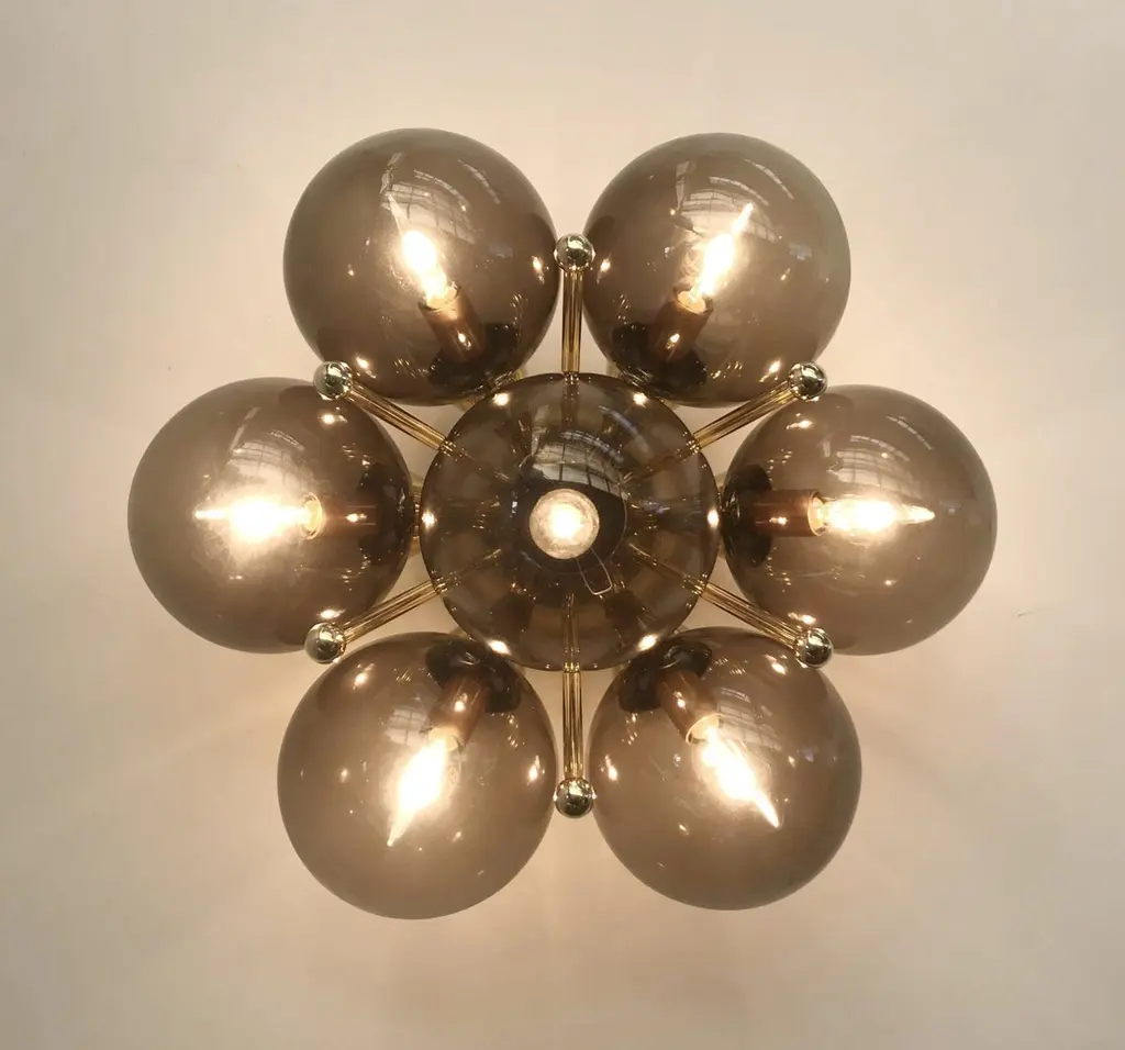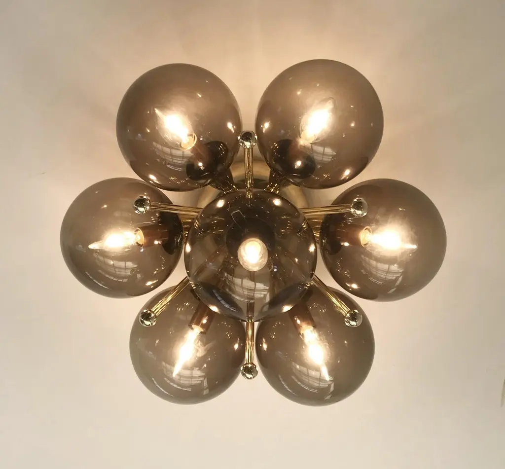 Italian flush mount with Murano glass globes mounted on solid brass frameDesigned by Fabio Bergomi / Made in Italy7 lights / E12 or E14 type / max 40W eachDiameter: 22 inches / Height: 11 inchesOrder only / This item ships from ItalyOrder Reference #: FABIOLTD SAKURAThe listed price applies to all Brass finishes : Unlacquered Natural Brass, Unlacquered Polished Brass, Lacquered Polished Brass, Lacquered Satin BrassOther finishes available with upcharge of $200: Bronzed, Polished Chrome, Satin Chrome, Polished Nickel, Satin Nickel, Polished Black Nickel, Satin Black Nickel, Polished Copper, Satin Copper