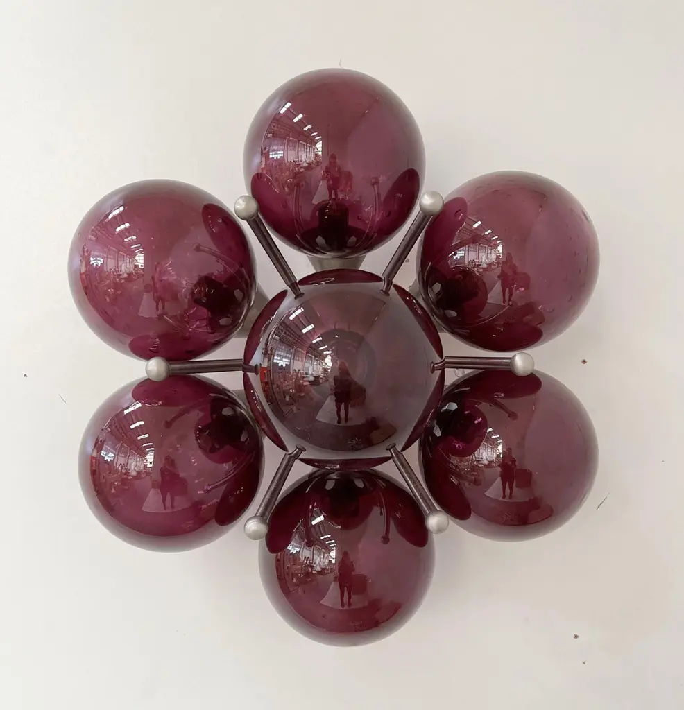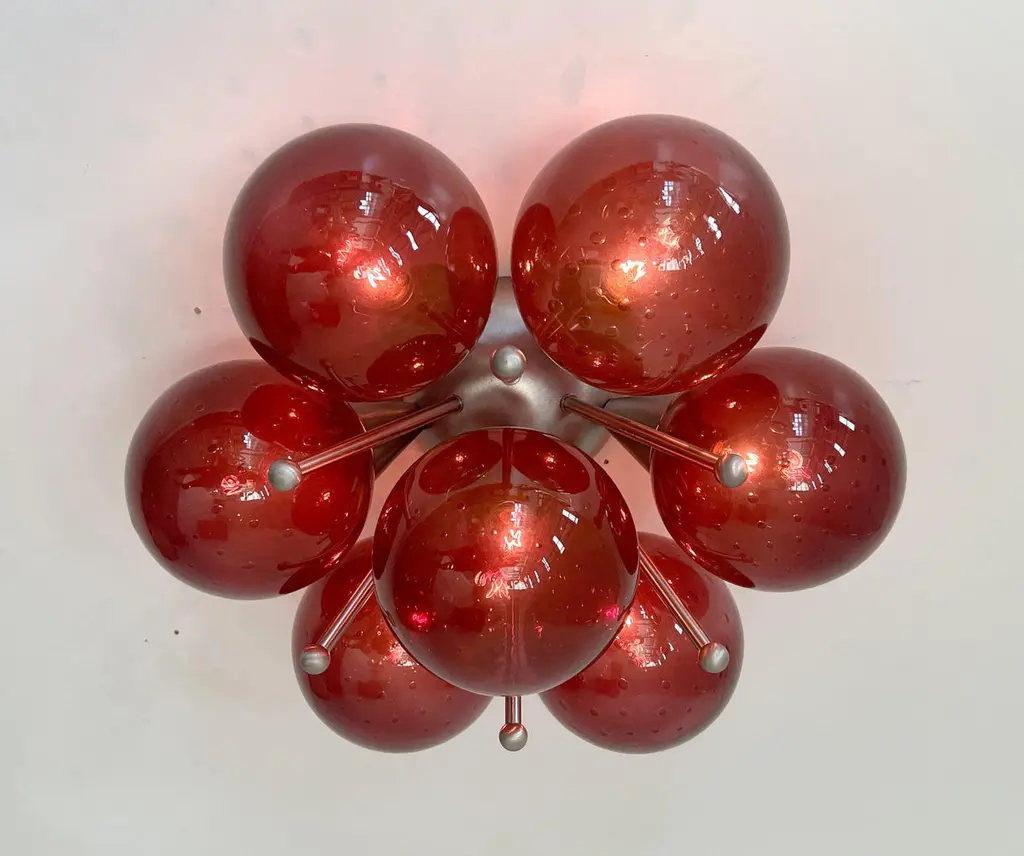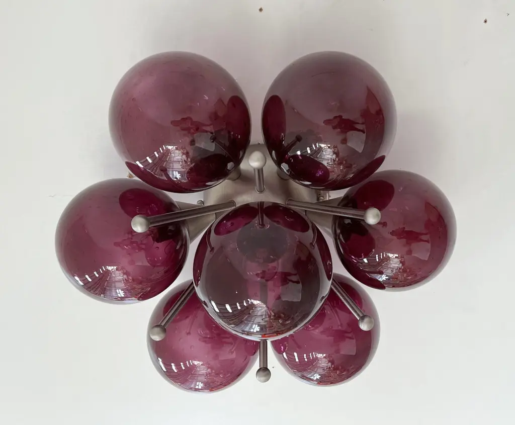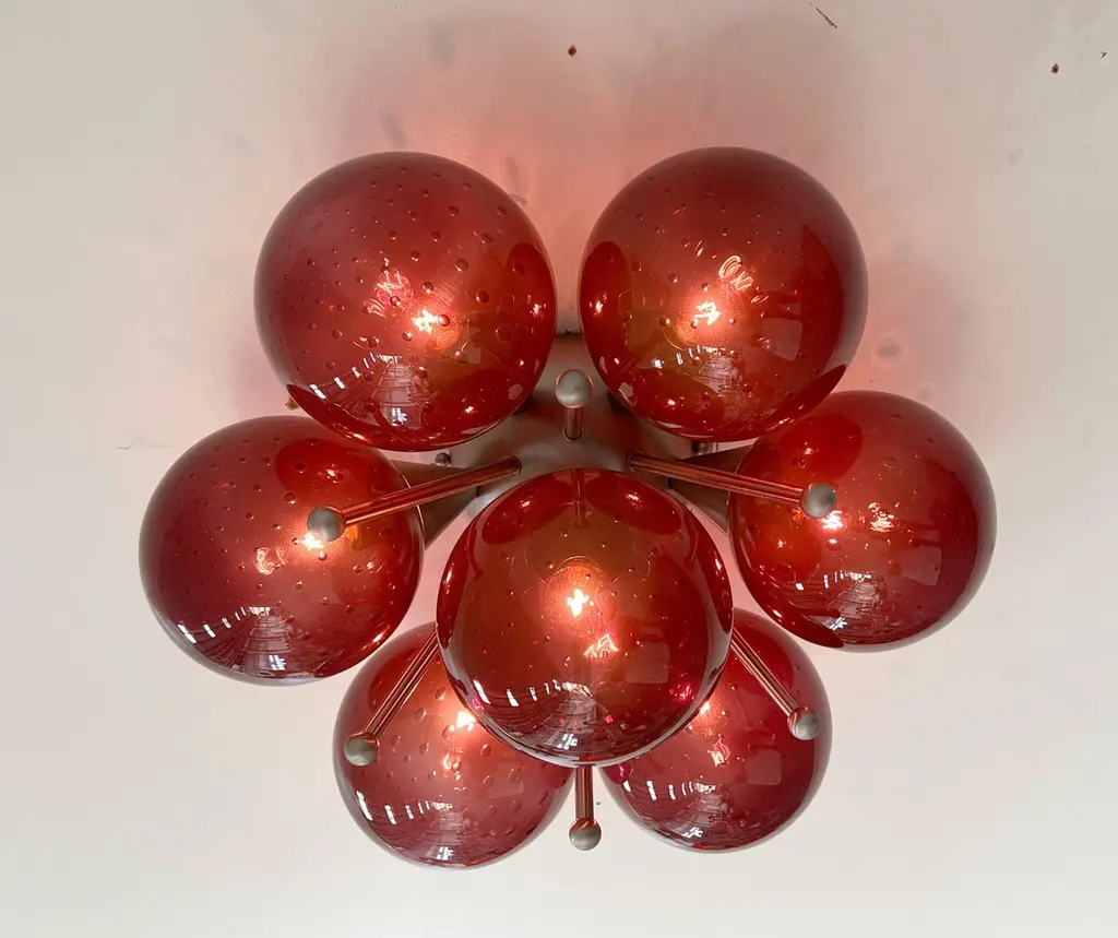 Italian flush mount with Murano glass globes mounted on solid brass frameDesigned by Fabio Bergomi / Made in Italy7 lights / E12 or E14 type / max 40W eachDiameter: 22 inches / Height: 11 inchesOrder only / This item ships from ItalyOrder Reference #: FABIOLTD SAKURAThe listed price applies to the following finishes : Bronzed, Polished Chrome, Satin Chrome, Polished Nickel, Satin Nickel, Polished Black Nickel, Satin Black Nickel, Polished Copper, Satin CopperOther finishes are available : Unlacquered Natural Brass, Unlacquered Polished Brass, Lacquered Polished Brass, Lacquered Satin Brass