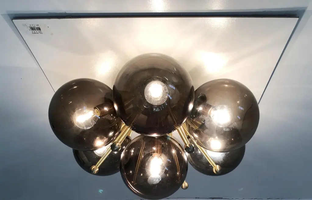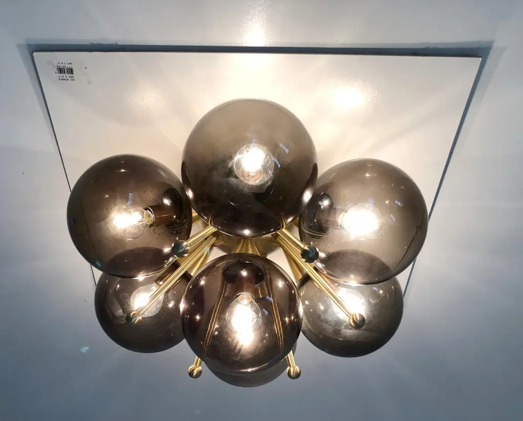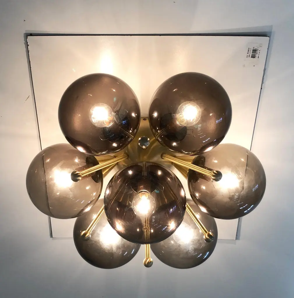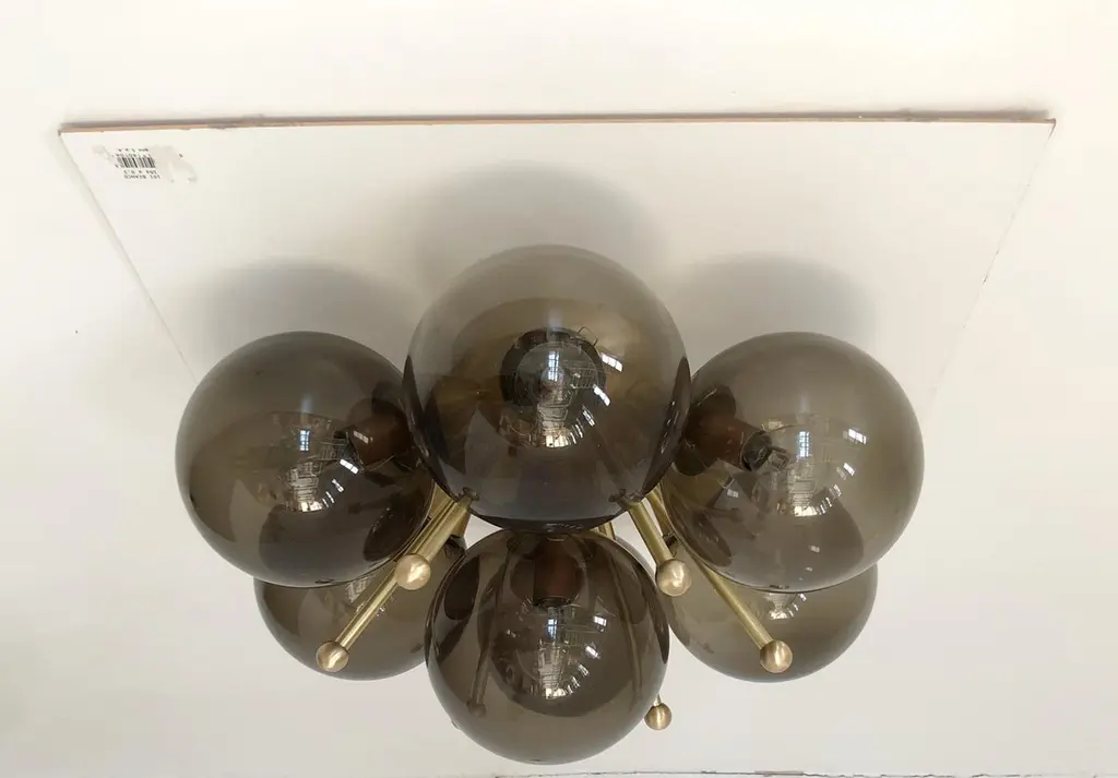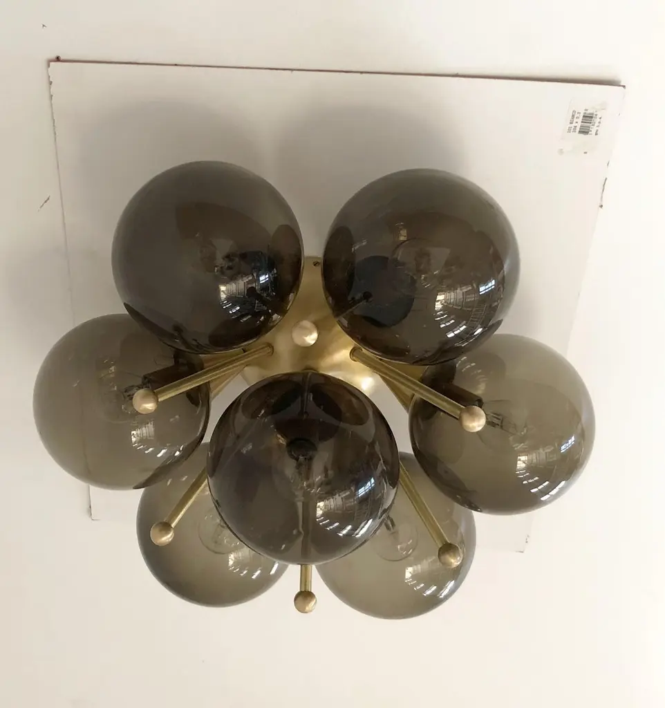 Italian flush mount with Murano glass globes mounted on solid brass frame Designed by Fabio Bergomi / Made in Italy 7 lights / E12 or E14 type / max 40W each Diameter: 22 inches / Height: 11 inches Order only / This item ships from Italy Order Reference #: FABIOLTD SAKURA The listed price applies to all Brass finishes : Unlacquered Natural Brass, Unlacquered Polished Brass, Lacquered Polished Brass, Lacquered Satin Brass Other finishes available with upcharge of $200: Bronzed, Polished Chrome, Satin Chrome, Polished Nickel, Satin Nickel, Polished Black Nickel, Satin Black Nickel, Polished Copper, Satin Copper