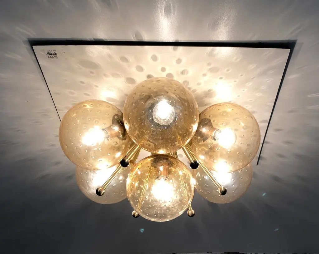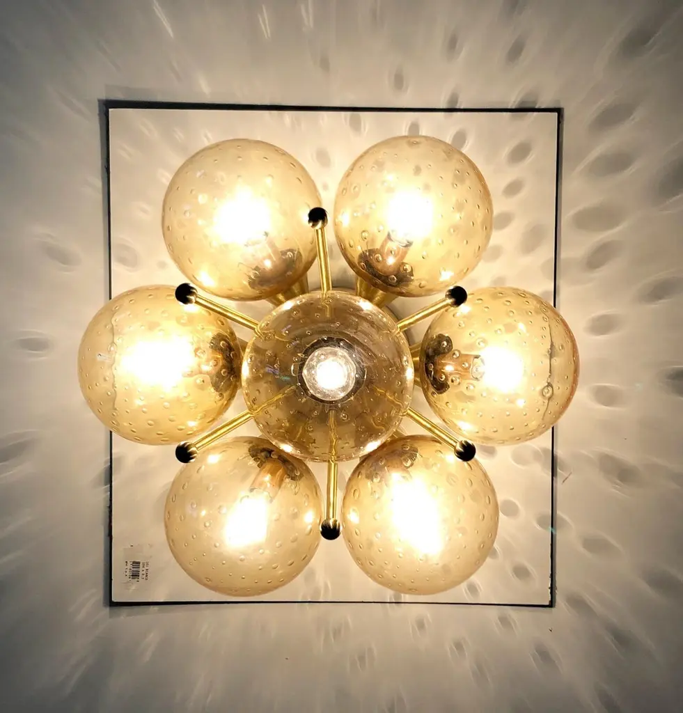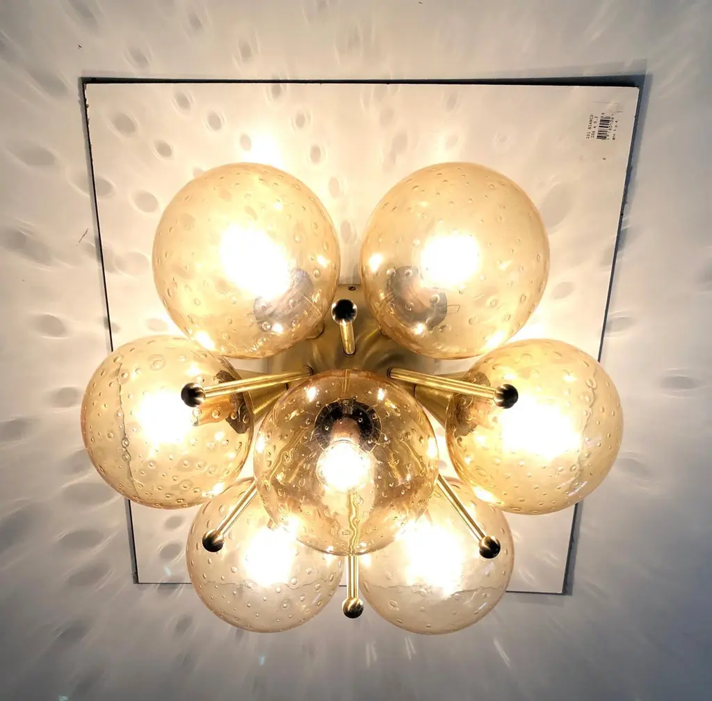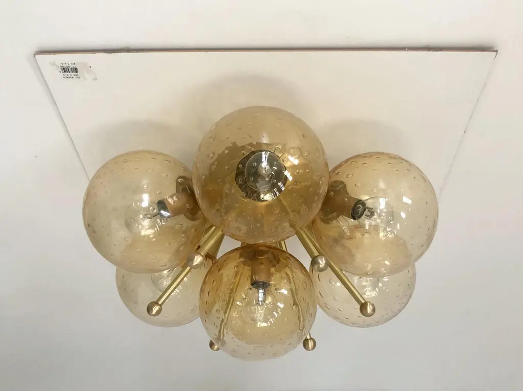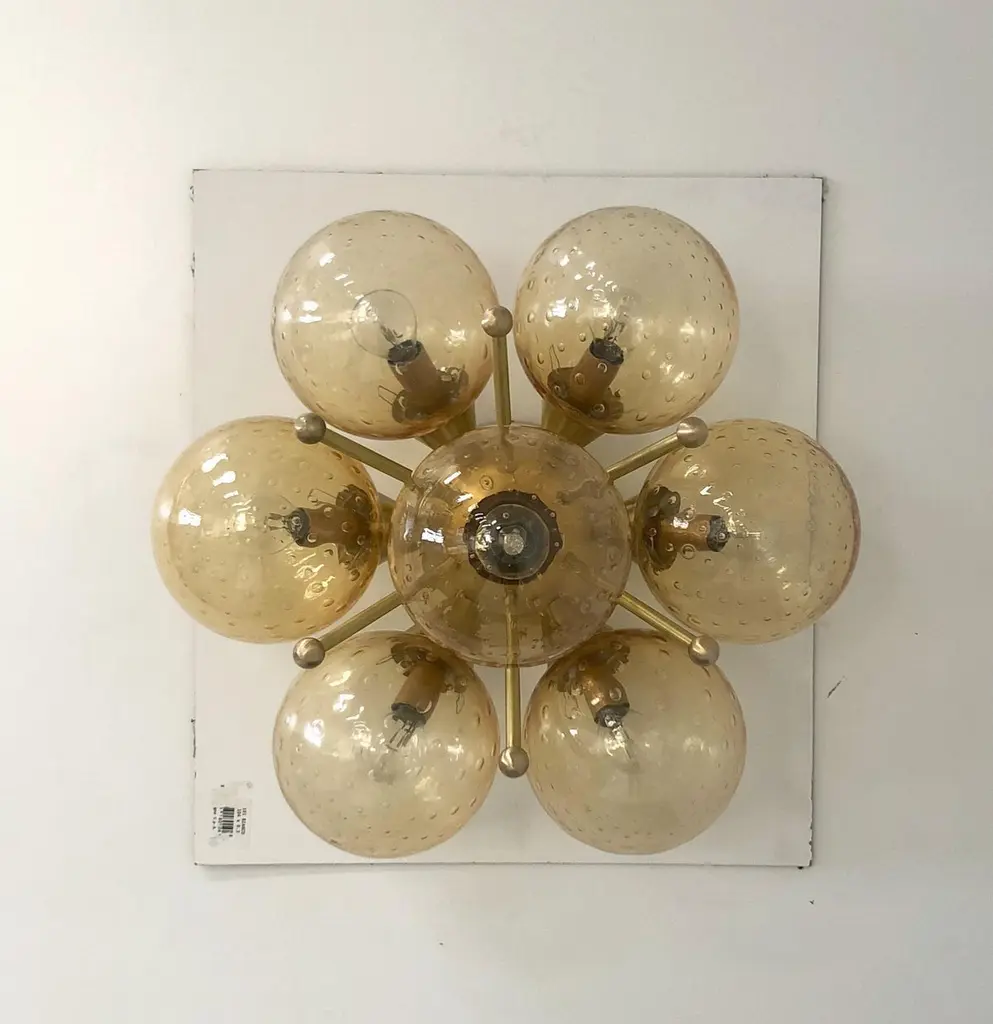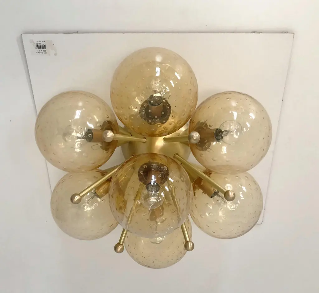 Italian flush mount with Murano glass globes mounted on solid brass frameDesigned by Fabio Bergomi / Made in Italy7 lights / E12 or E14 type / max 40W eachDiameter: 22 inches / Height: 11 inchesOrder only / This item ships from ItalyOrder Reference #: FABIOLTD SAKURAThe listed price applies to all Brass finishes : Unlacquered Natural Brass, Unlacquered Polished Brass, Lacquered Polished Brass, Lacquered Satin BrassOther finishes available with upcharge of $200: Bronzed, Polished Chrome, Satin Chrome, Polished Nickel, Satin Nickel, Polished Black Nickel, Satin Black Nickel, Polished Copper, Satin Copper.