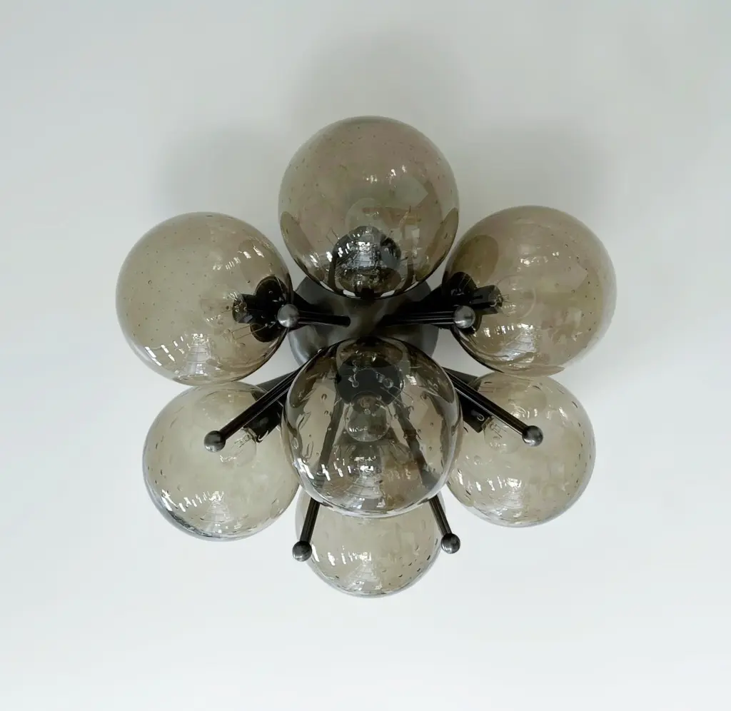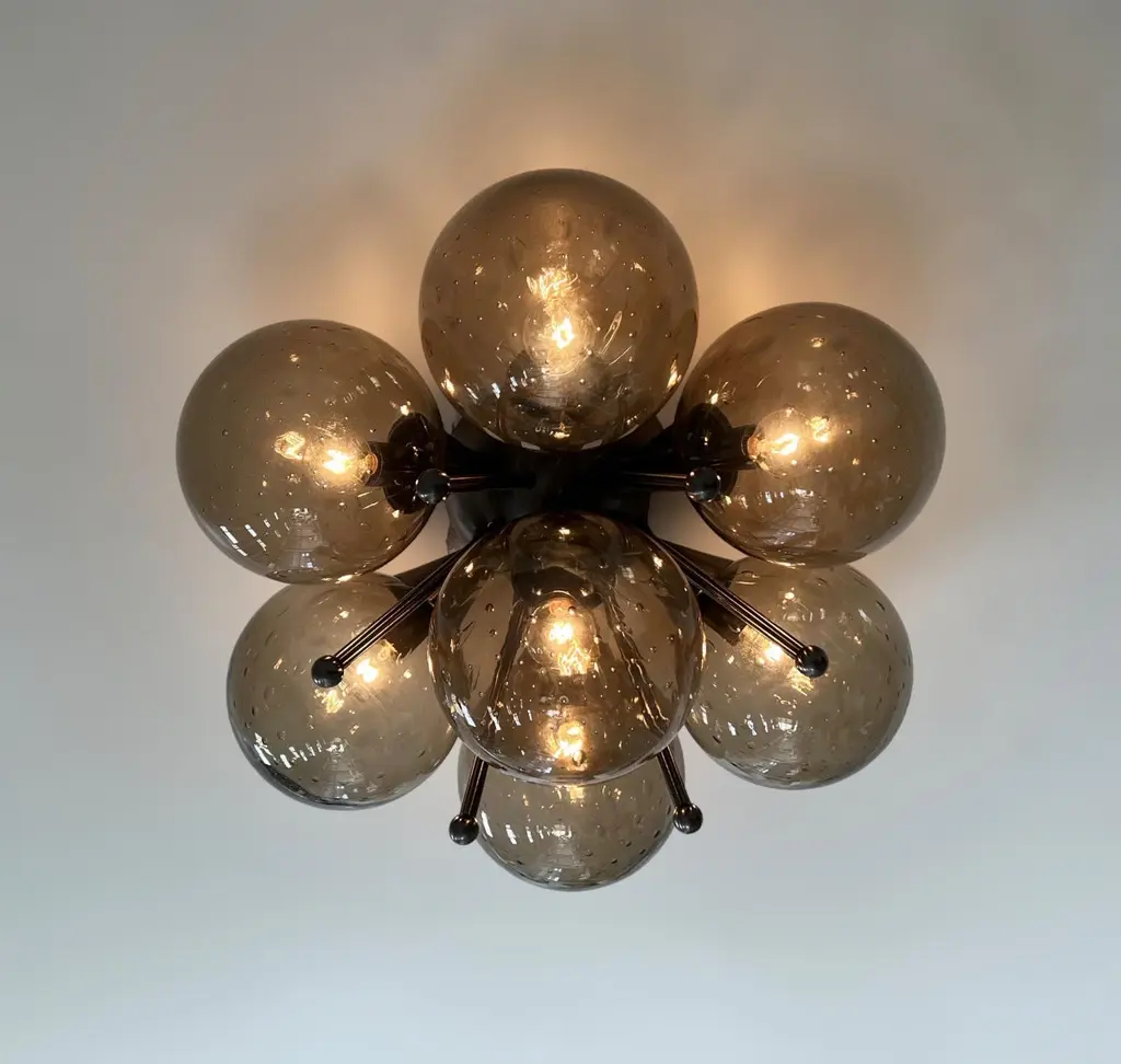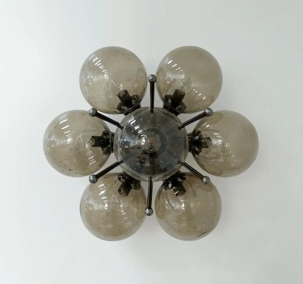 Italian flush mount with Murano glass globes mounted on solid brass frameDesigned by Fabio Bergomi / Made in Italy7 lights / E12 or E14 type / max 40W eachDiameter: 22 inches / Height: 11 inchesOrder only / This item ships from ItalyOrder Reference #: FABIOLTD SAKURAThe listed price applies to the following finishes : Bronzed, Polished Chrome, Satin Chrome, Polished Nickel, Satin Nickel, Polished Black Nickel, Satin Black Nickel, Polished Copper, Satin CopperOther finishes available : Unlacquered Natural Brass, Unlacquered Polished Brass, Lacquered Polished Brass, Lacquered Satin Brass