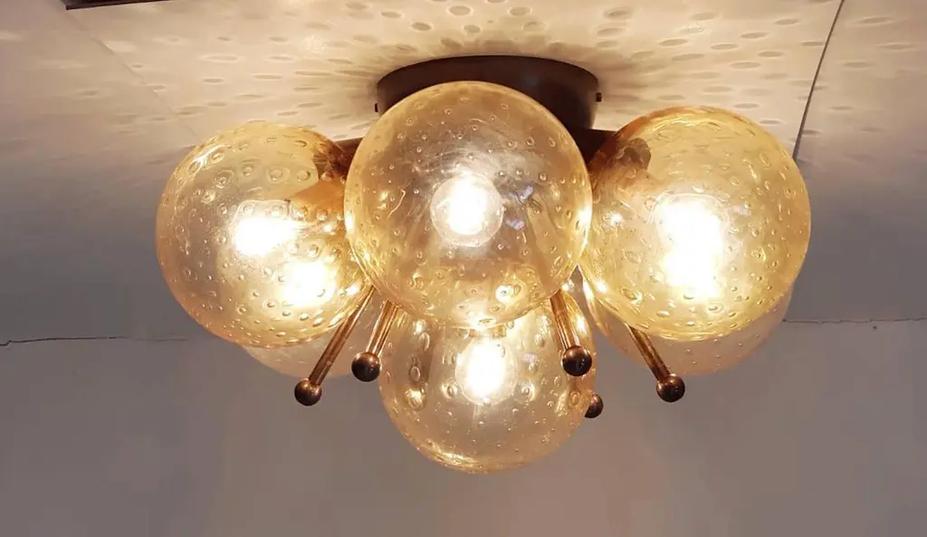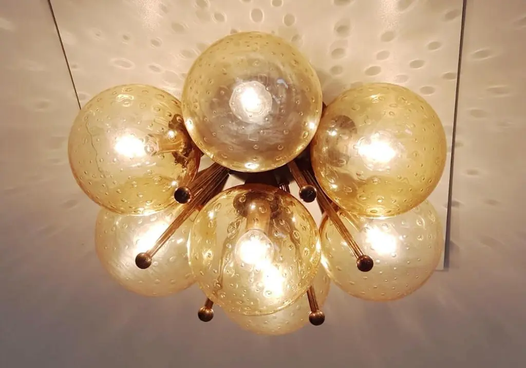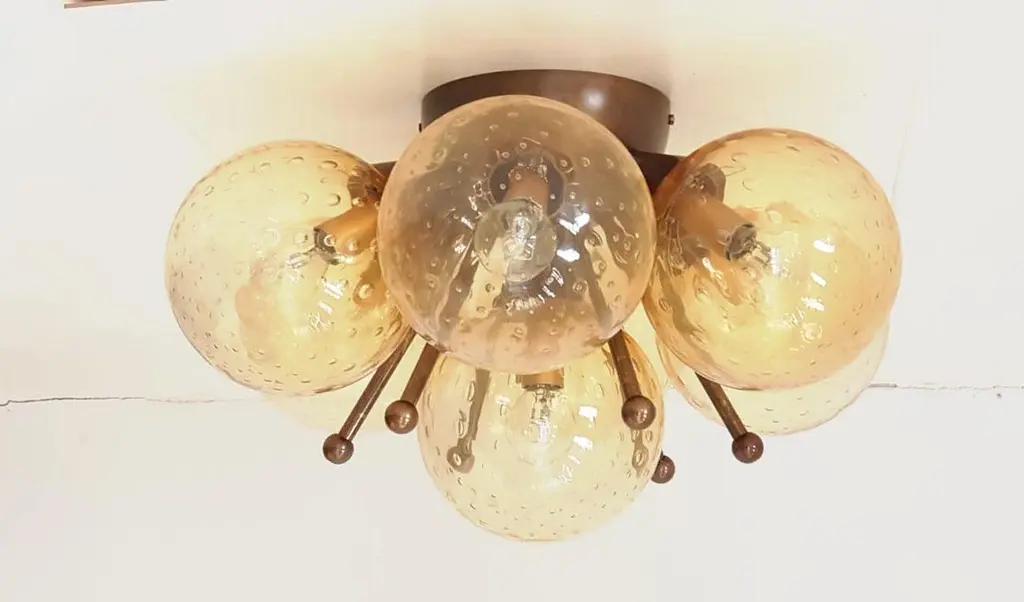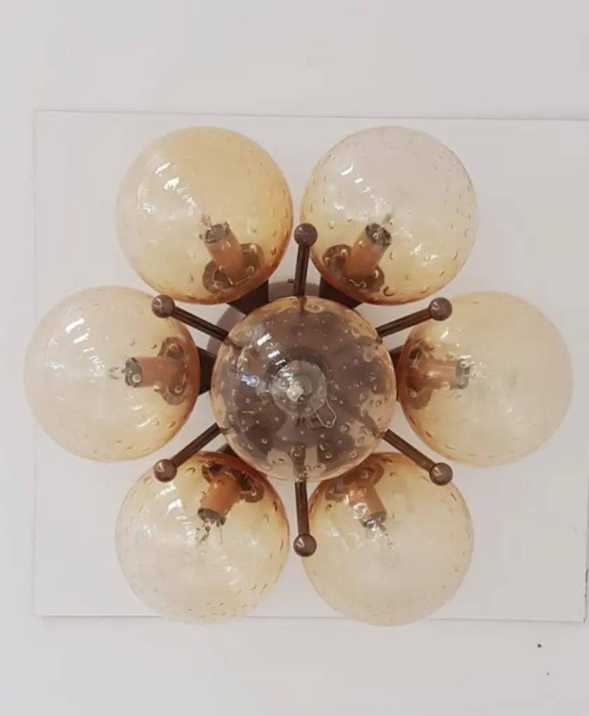 Italian flush mount with Murano glass globes mounted on solid brass frameDesigned by Fabio Bergomi / Made in Italy7 lights / E12 or E14 type / max 40W eachDiameter: 22 inches / Height: 11 inchesOrder only / This item ships from ItalyOrder Reference #: FABIOLTD SAKURAThe listed price applies to the following finishes : Bronzed, Polished Chrome, Satin Chrome, Polished Nickel, Satin Nickel, Polished Black Nickel, Satin Black Nickel, Polished Copper, Satin CopperOther finishes available : Unlacquered Natural Brass, Unlacquered Polished Brass, Lacquered Polished Brass, Lacquered Satin Brass