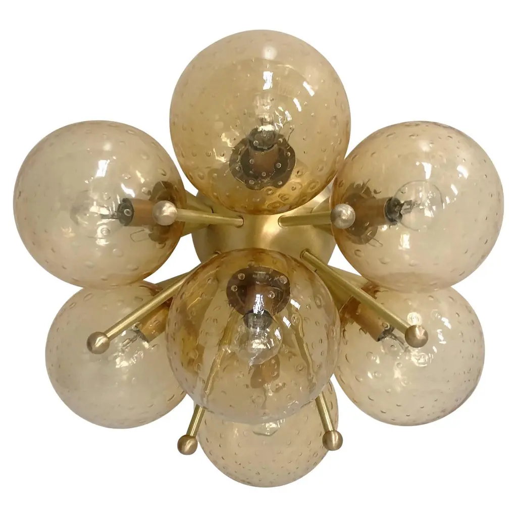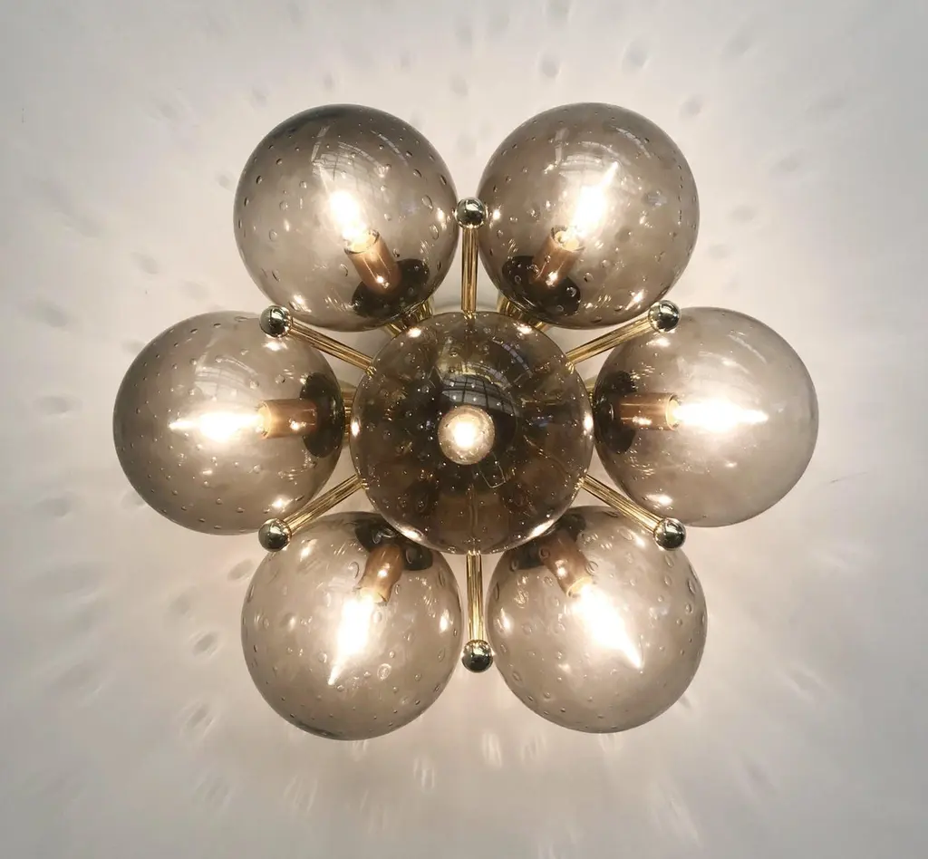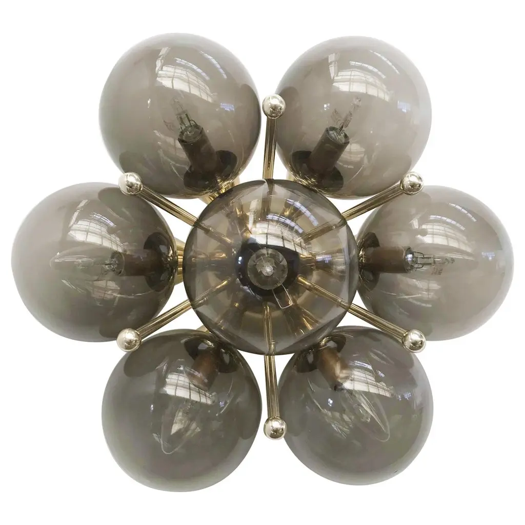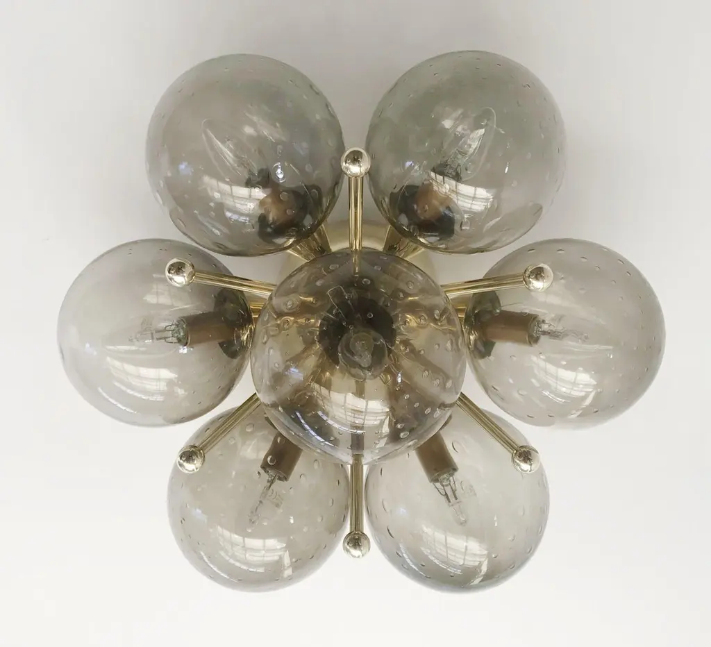 Italian flush mount with Murano glass globes mounted on solid brass frameDesigned by Fabio Bergomi / Made in Italy7 lights / E12 or E14 type / max 40W eachDiameter: 22 inches / Height: 11 inchesOrder only / This item ships from ItalyOrder Reference #: FABIOLTD SAKURAThe listed price applies to all Brass finishes : Unlacquered Natural Brass, Unlacquered Polished Brass, Lacquered Polished Brass, Lacquered Satin BrassOther finishes available with upcharge of $200 : Bronzed, Polished Chrome, Satin Chrome, Polished Nickel, Satin Nickel, Polished Black Nickel, Satin Black Nickel, Polished Copper, Satin Copper