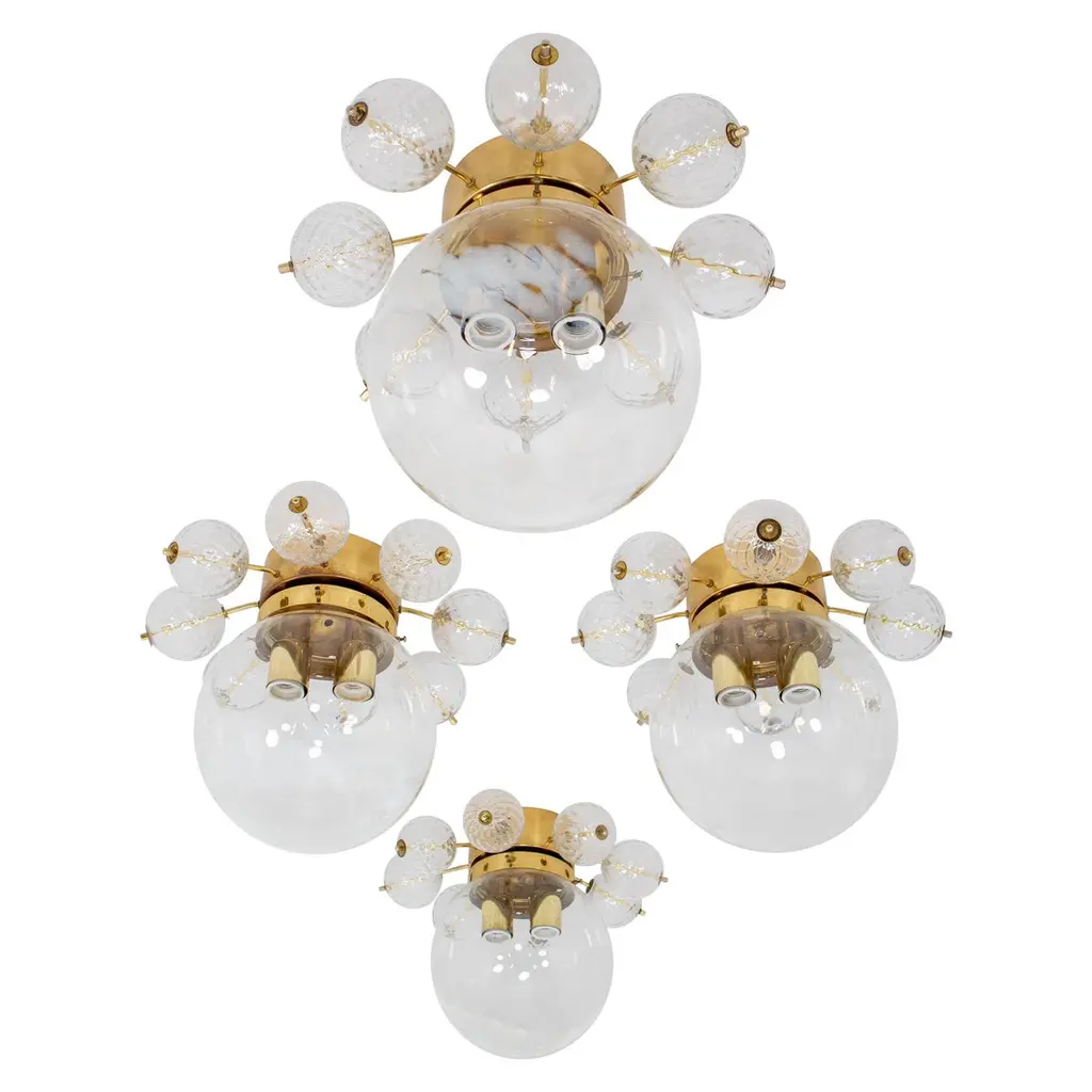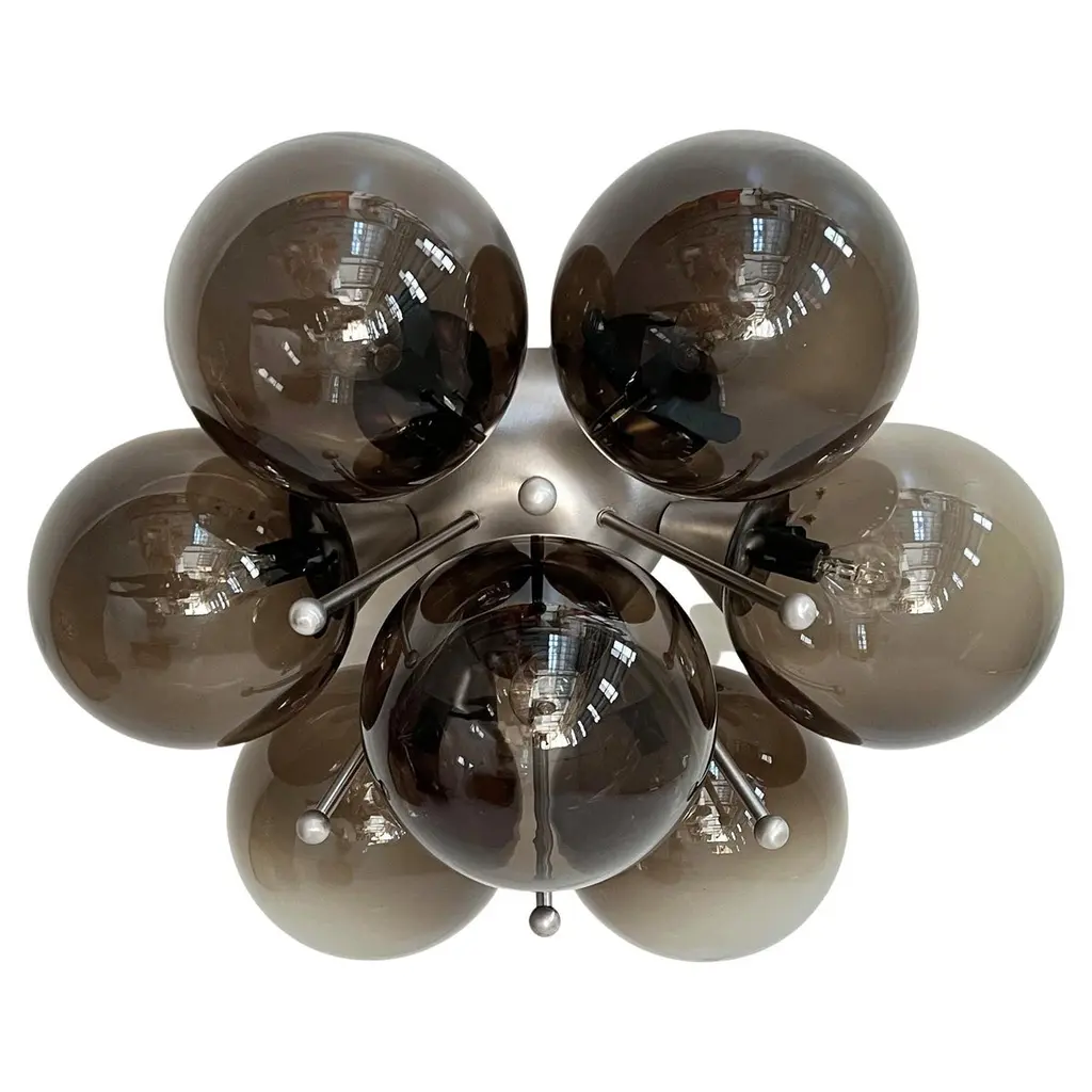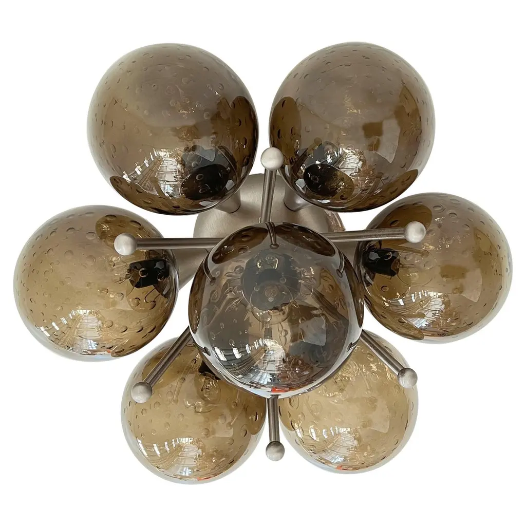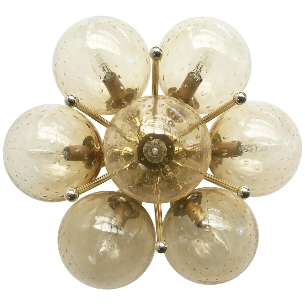 Italian flush mount with Murano glass globes mounted on solid brass frameDesigned by Fabio Bergomi / Made in Italy7 lights / E12 or E14 type / max 40W eachDiameter: 22 inches / Height: 11 inchesOrder only / This item ships from ItalyOrder Reference #: FABIOLTD SAKURAThe listed price applies to all Brass finishes : Unlacquered Natural Brass, Unlacquered Polished Brass, Lacquered Polished Brass, Lacquered Satin BrassOther finishes available with upcharge of $200 : Bronzed, Polished Chrome, Satin Chrome, Polished Nickel, Satin Nickel, Polished Black Nickel, Satin Black Nickel, Polished Copper, Satin Copper