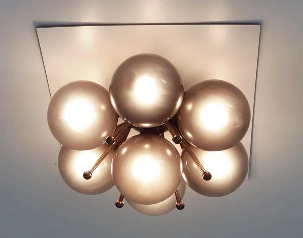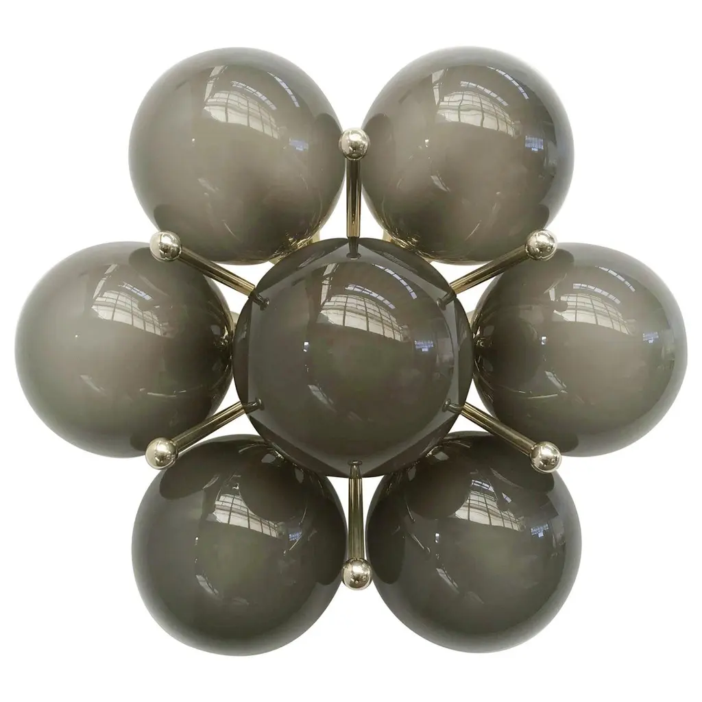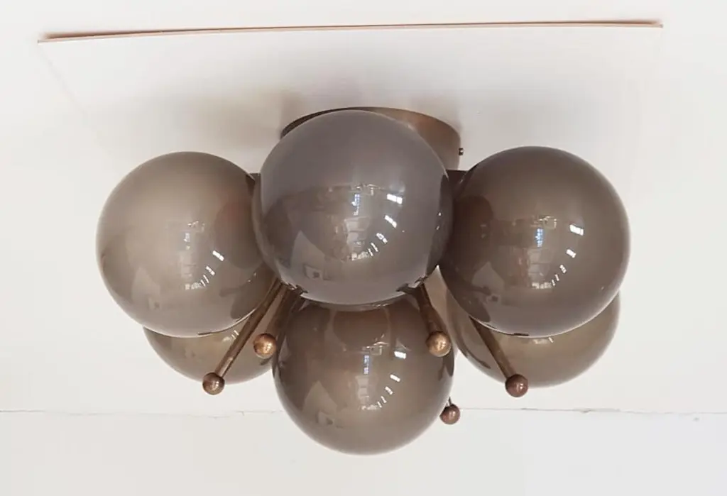 Italian flush mount with Murano glass globes mounted on solid brass frameDesigned by Fabio Bergomi / Made in Italy7 lights / E12 or E14 type / max 40W eachDiameter: 22 inches / Height: 11 inchesOrder only / This item ships from ItalyOrder Reference #: FABIOLTD SAKURAThe listed price applies to the following finishes : Bronzed, Polished Chrome, Satin Chrome, Polished Nickel, Satin Nickel, Polished Black Nickel, Satin Black Nickel, Polished Copper, Satin CopperOther finishes available : Unlacquered Natural Brass, Unlacquered Polished Brass, Lacquered Polished Brass, Lacquered Satin Brass