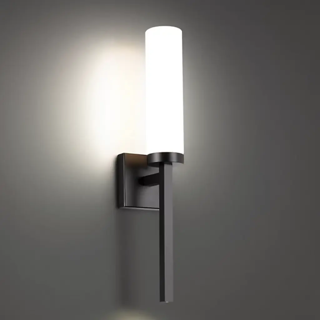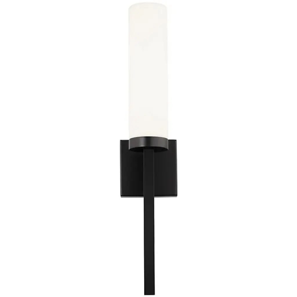 Bring even light to walls with the simple, striking lines of the Saltaire LED Wall Sconce from dweLED. A tasteful modern design in robust aluminum, it extends a short horizontal stem to an upright disc housing for damp-rated LED lamping. Counterbalanced by a slender vertical finial, a cylindrical diffuser of opal glass rises around the lamping, casting a mellow wash of light around the fixture that gleams off the smooth metal.