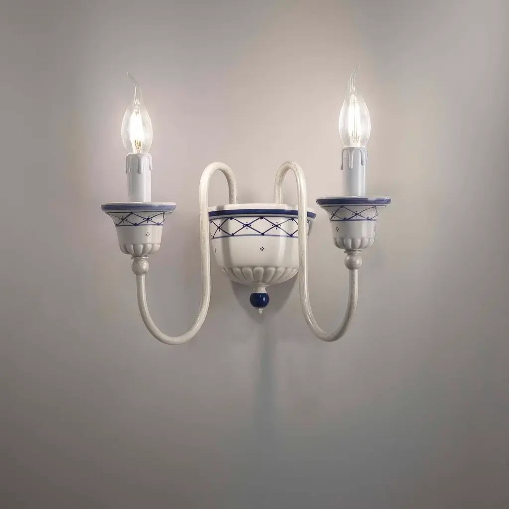 This wall lamp will make a luminous statement in any modern or traditional entryway, hallway, or living room, infusing it with a soft yet bright light. The piece is composed of two sinuous arms in white-lacquered brass ending with two candle holders handcrafted of white ceramic and painted by hand in a diamond-shaped blue pattern, on which rest two artificial candles supporting an E14 bulb each.