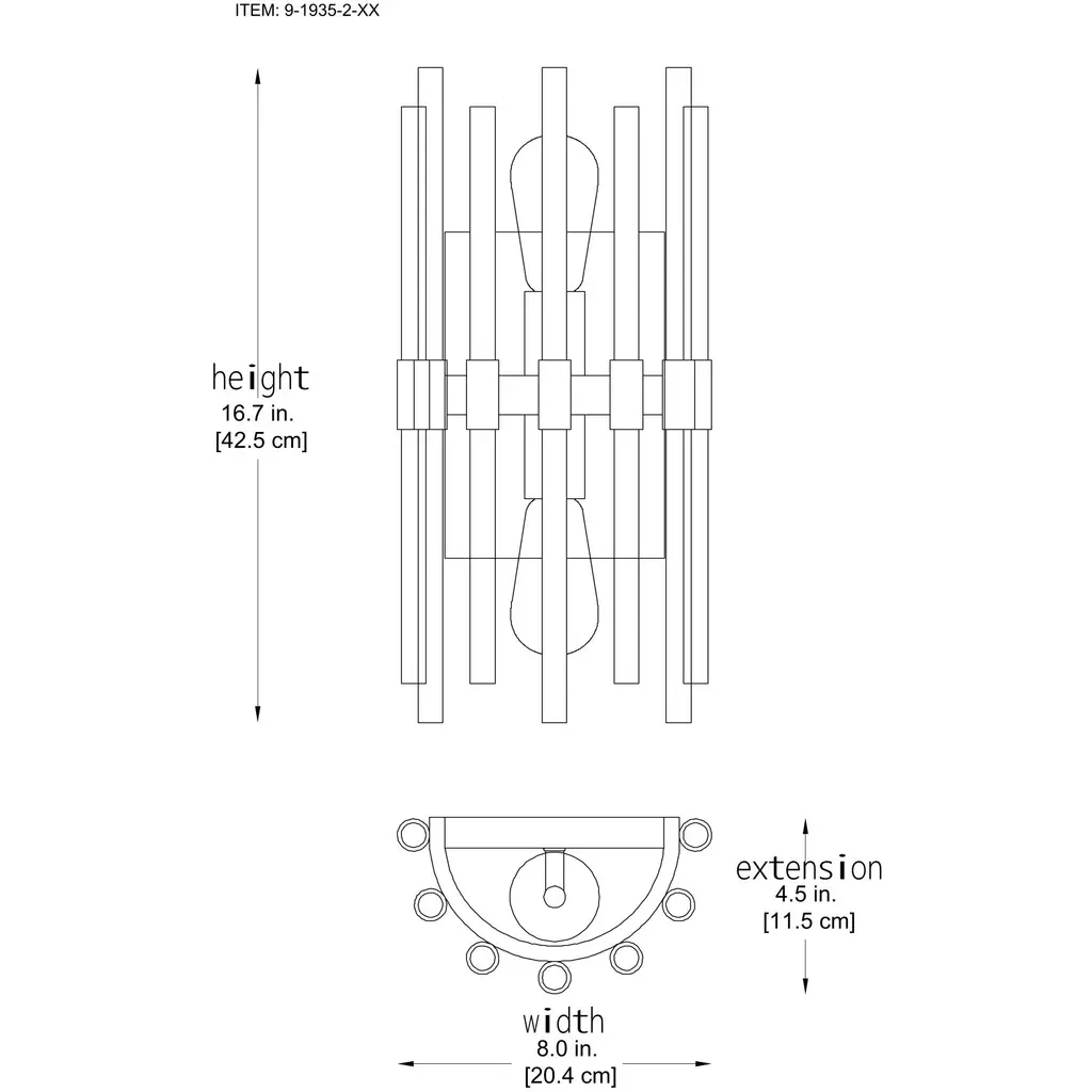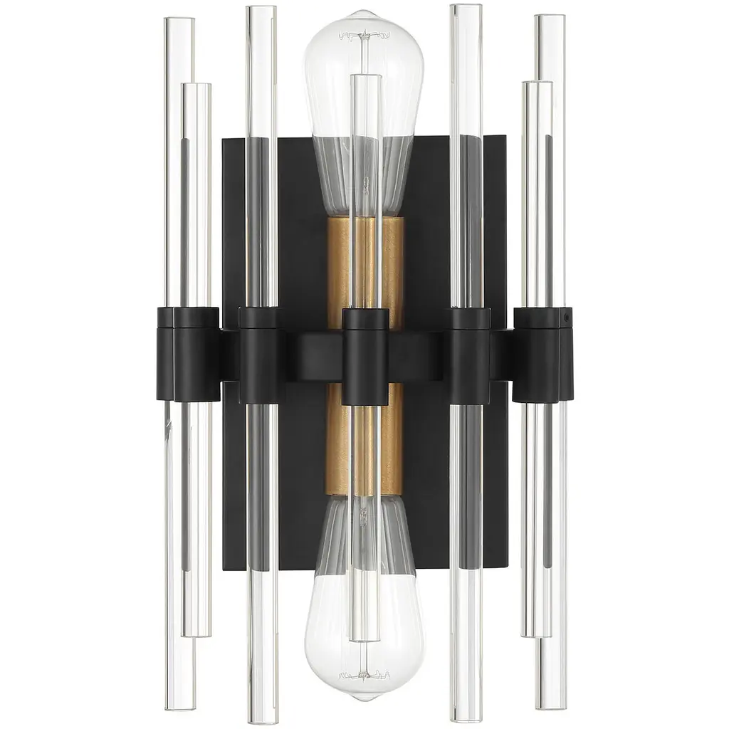 Classic, iconic Sputnik style meets chic, modern crystal details in the stylish Savoy House Santiago 2-light wall sconce. Wands of crystal create a beautiful shade that allows for bright, unobscured light. The Matte Black finish is accentuated by Warm Brass for extra boldness. Santiago is 13.25" in height, 8" in width and extends 4.5" from the wall. It uses two standard size bulbs of up to 60 watts per bulb. Bulbs are not included. This sconce is damp area rated.