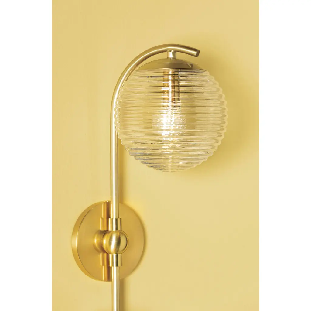Influenced by vintage Holophane style glass fixtures, Sara gives the classic look a modern update. The clear ribbed glass globes were designed for maximum light and refraction. Available as a flush mount, wall sconce or pendant light, style Sara in multiples down hallways and over kitchen islands or alone above coffee or dining tables to fill a space with bright light and sleek sophistication. The lamp's ribbed ceramic base is similarly influenced and adds texture and a pop of color to any tabletop. Part of our Home Ec. x Mitzi Tastemakers collection.