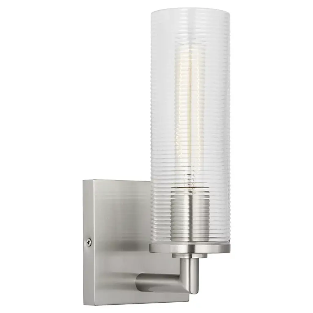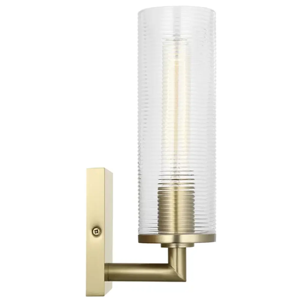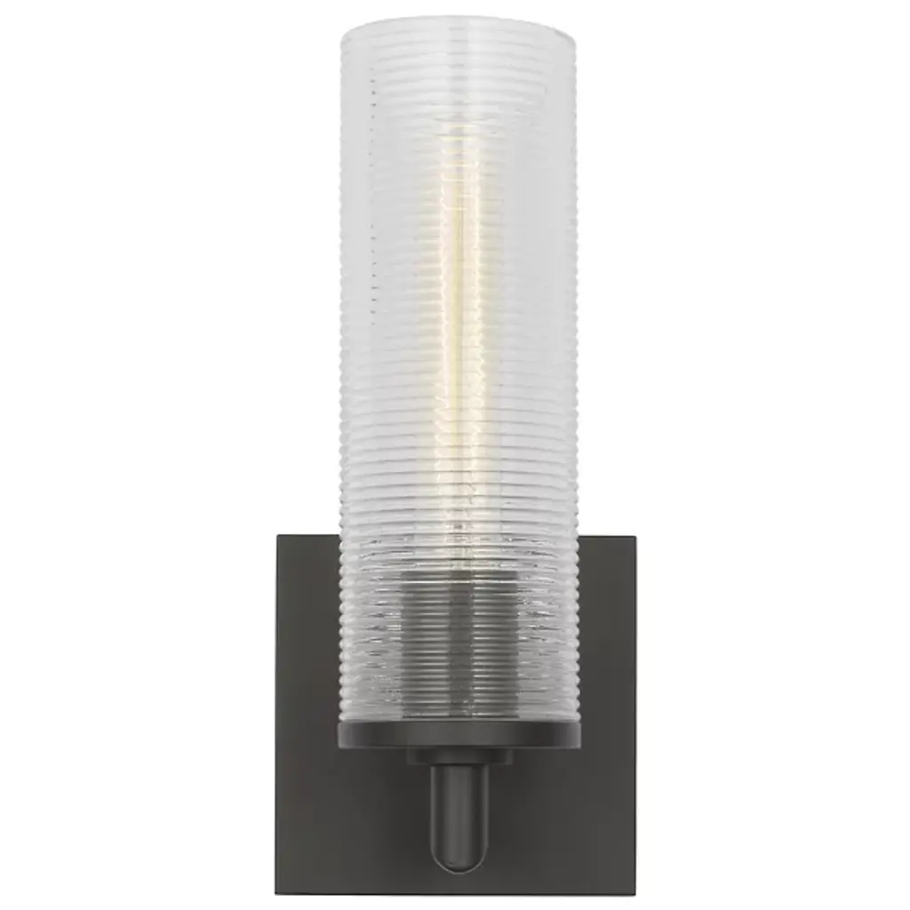 The Sarita Bath Sconce from Visual Comfort Studio combines a streamlined cylindrical shape with textural interest through its ribbed glass shade. When illuminated, the glass diffuses light evenly while maintaining clarity and brightness. Drew & Jonathan Scott created this fixture with thoughtful proportions that work especially well in bathroom settings and hallways. Its square backplate provides sturdy mounting while adding geometric contrast to the glass cylinder. This sconce offers practical lighting solutions without sacrificing style, making it particularly useful for vanity areas where clear, evenly distributed light matters.