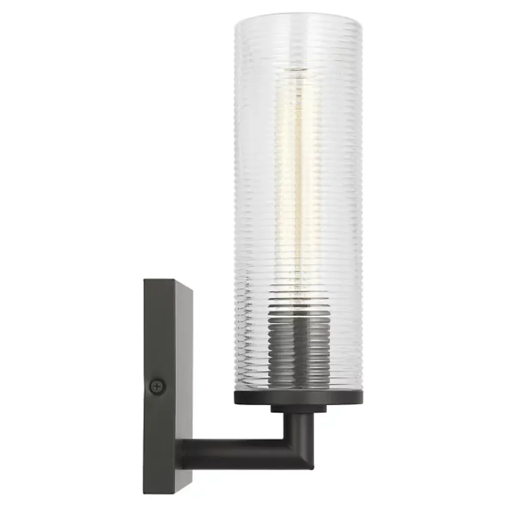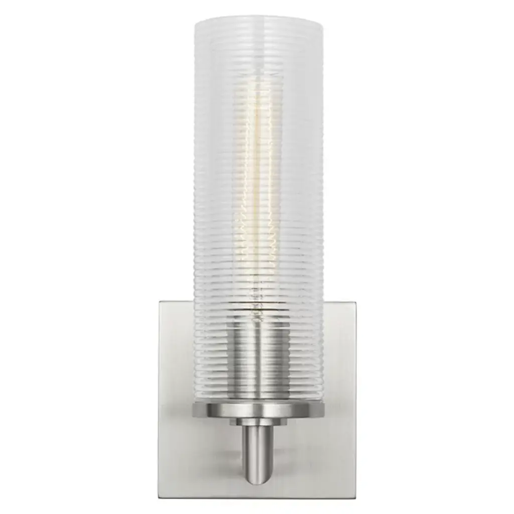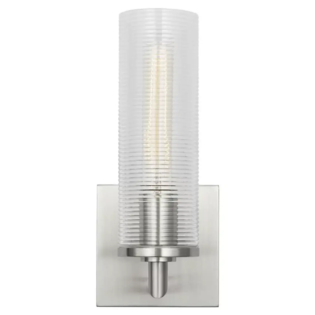 The Sarita Bath Sconce from Visual Comfort Studio combines a streamlined cylindrical shape with textural interest through its ribbed glass shade. When illuminated, the glass diffuses light evenly while maintaining clarity and brightness. Drew & Jonathan Scott created this fixture with thoughtful proportions that work especially well in bathroom settings and hallways. Its square backplate provides sturdy mounting while adding geometric contrast to the glass cylinder. This sconce offers practical lighting solutions without sacrificing style, making it particularly useful for vanity areas where clear, evenly distributed light matters.