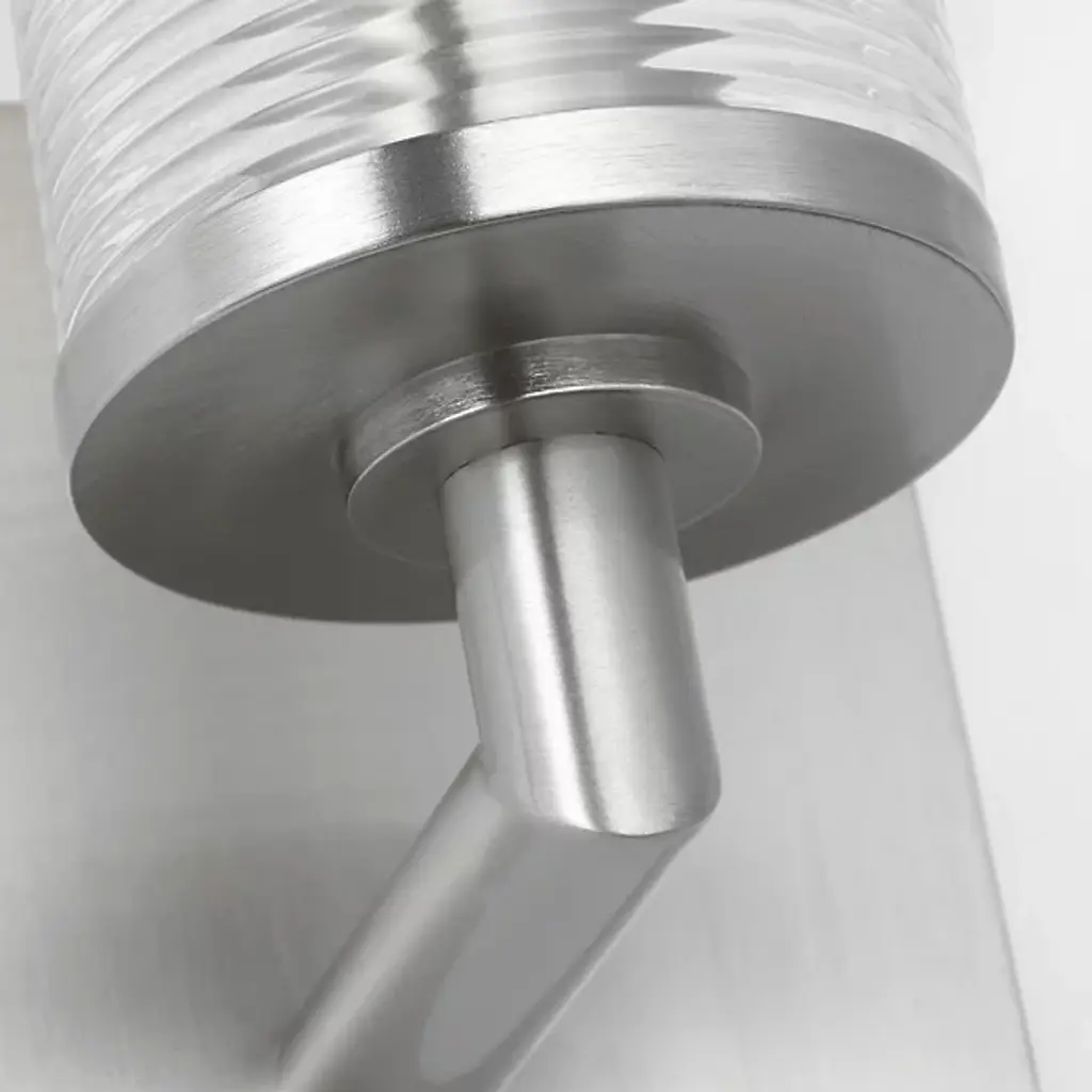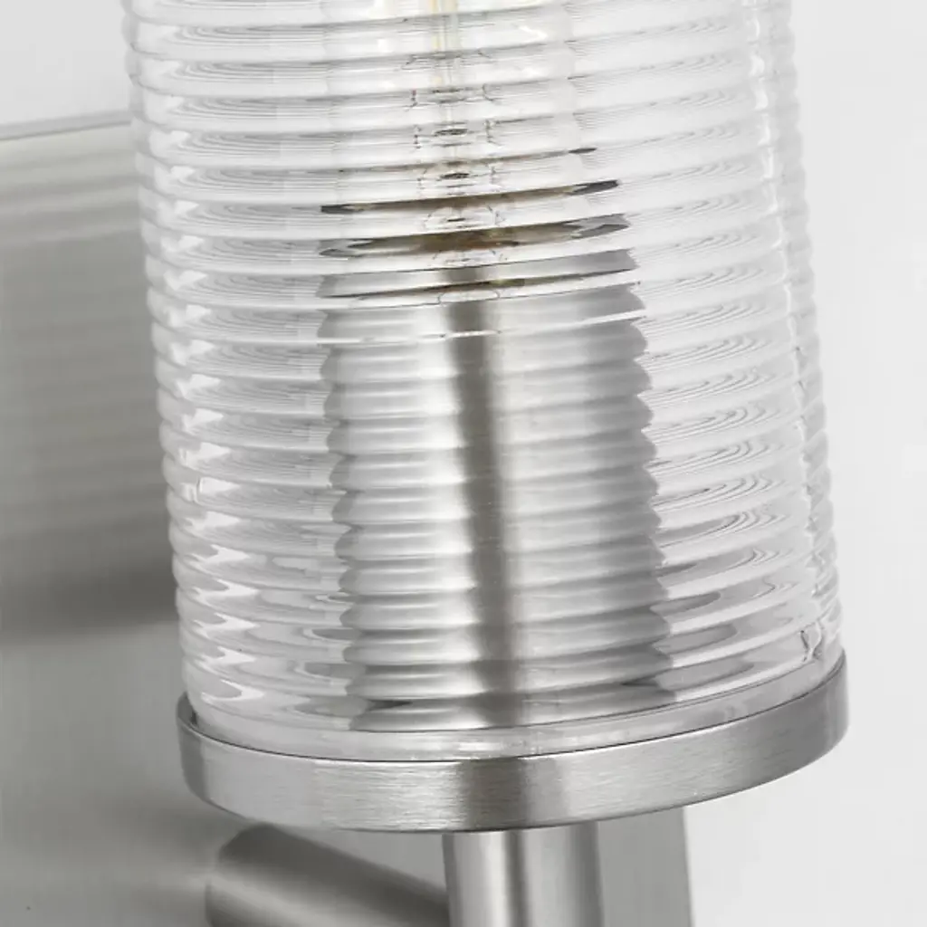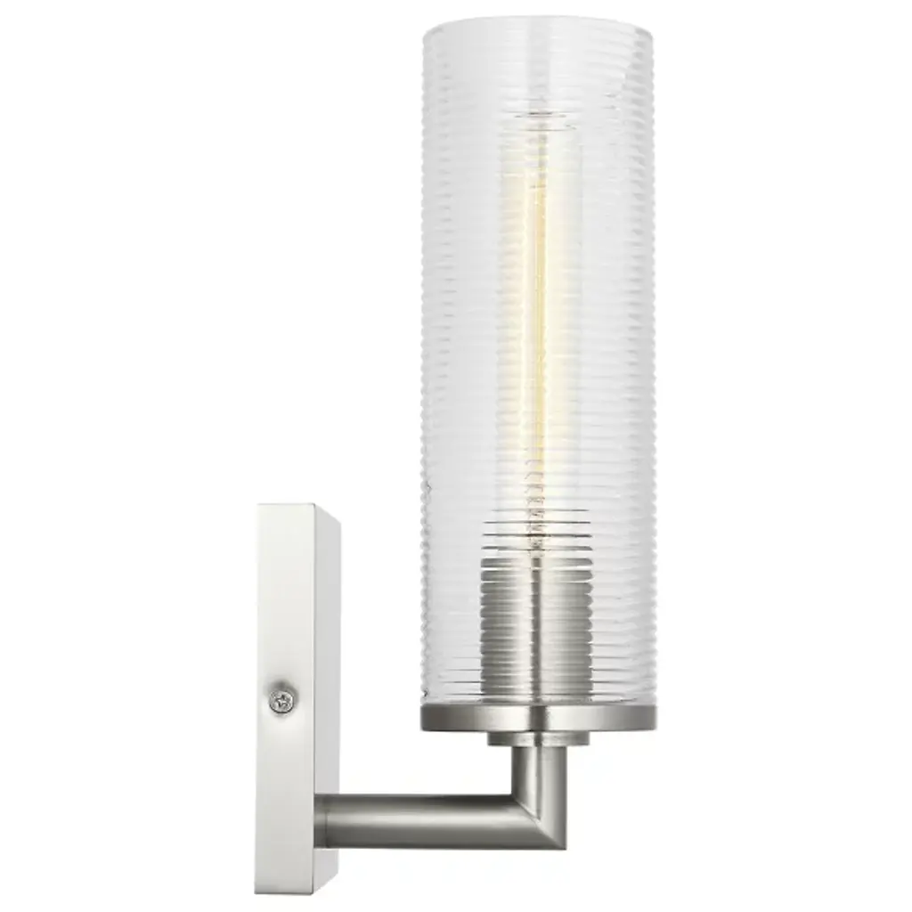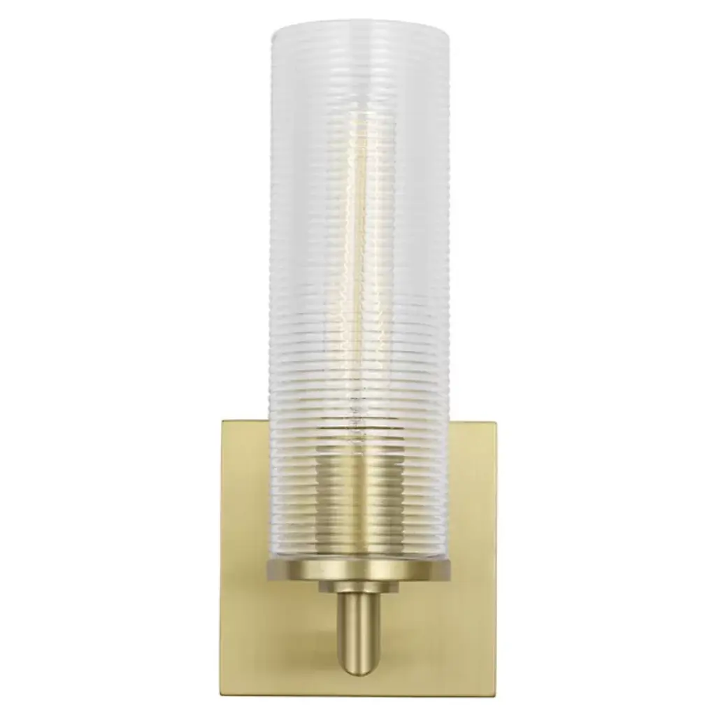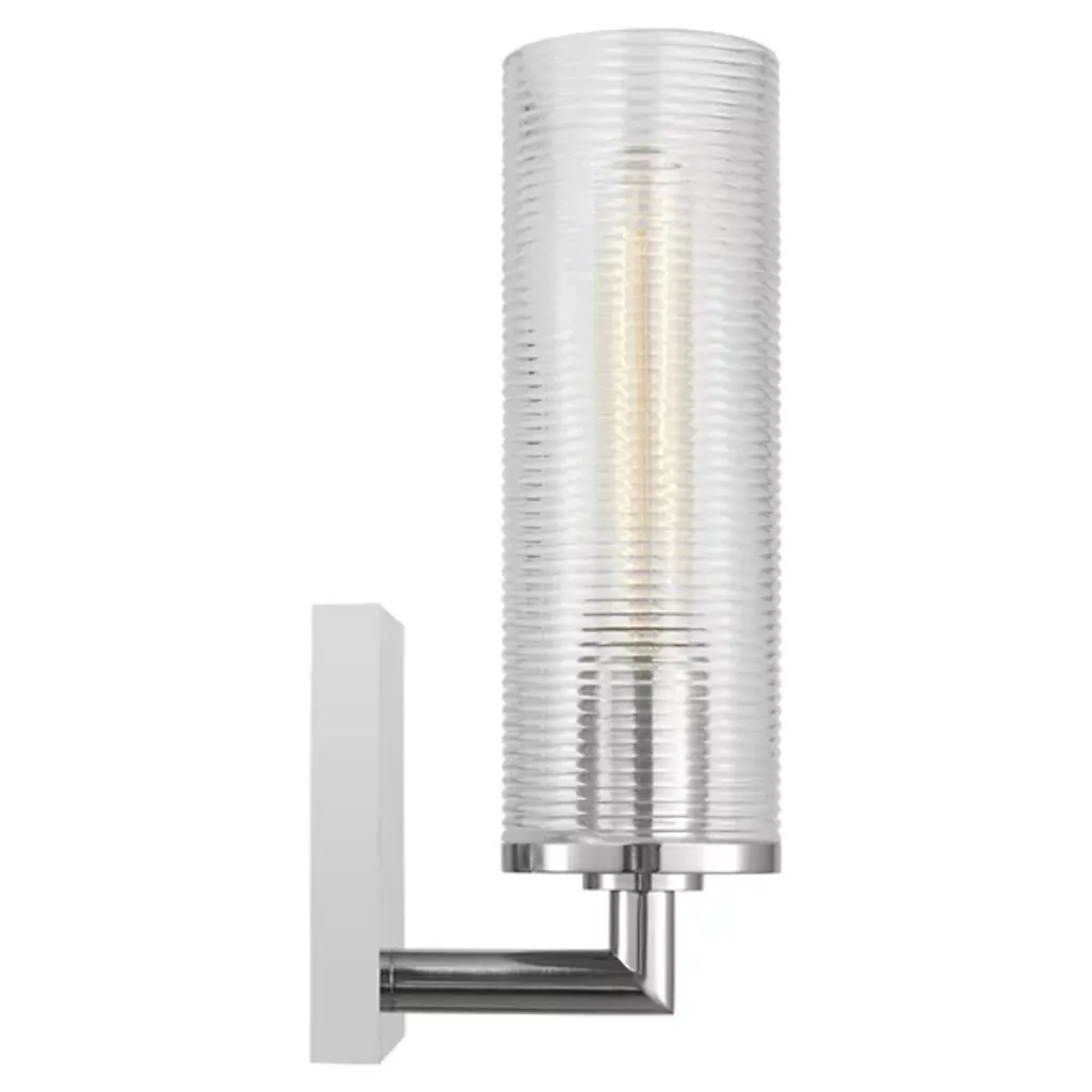 The Sarita Bath Sconce from Visual Comfort Studio combines a streamlined cylindrical shape with textural interest through its ribbed glass shade. When illuminated, the glass diffuses light evenly while maintaining clarity and brightness. Drew & Jonathan Scott created this fixture with thoughtful proportions that work especially well in bathroom settings and hallways. Its square backplate provides sturdy mounting while adding geometric contrast to the glass cylinder. This sconce offers practical lighting solutions without sacrificing style, making it particularly useful for vanity areas where clear, evenly distributed light matters.