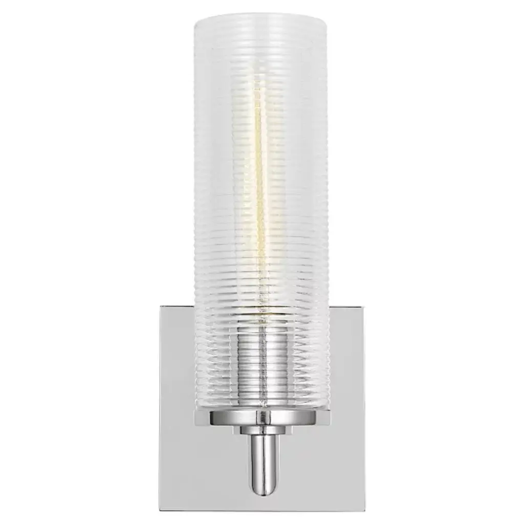 The Sarita Bath Sconce from Visual Comfort Studio combines a streamlined cylindrical shape with textural interest through its ribbed glass shade. When illuminated, the glass diffuses light evenly while maintaining clarity and brightness. Drew & Jonathan Scott created this fixture with thoughtful proportions that work especially well in bathroom settings and hallways. Its square backplate provides sturdy mounting while adding geometric contrast to the glass cylinder. This sconce offers practical lighting solutions without sacrificing style, making it particularly useful for vanity areas where clear, evenly distributed light matters.