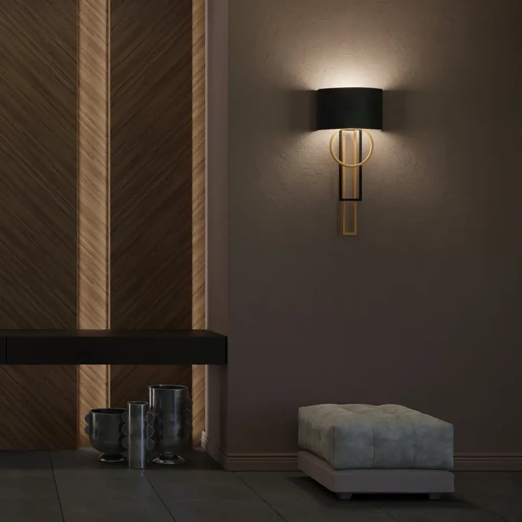 Layered geometry is complemented by rich dark topstitched leather. Illumination reflects down from the stylish mix of the aged brass and black frame while also casting light above the luxurious shade.