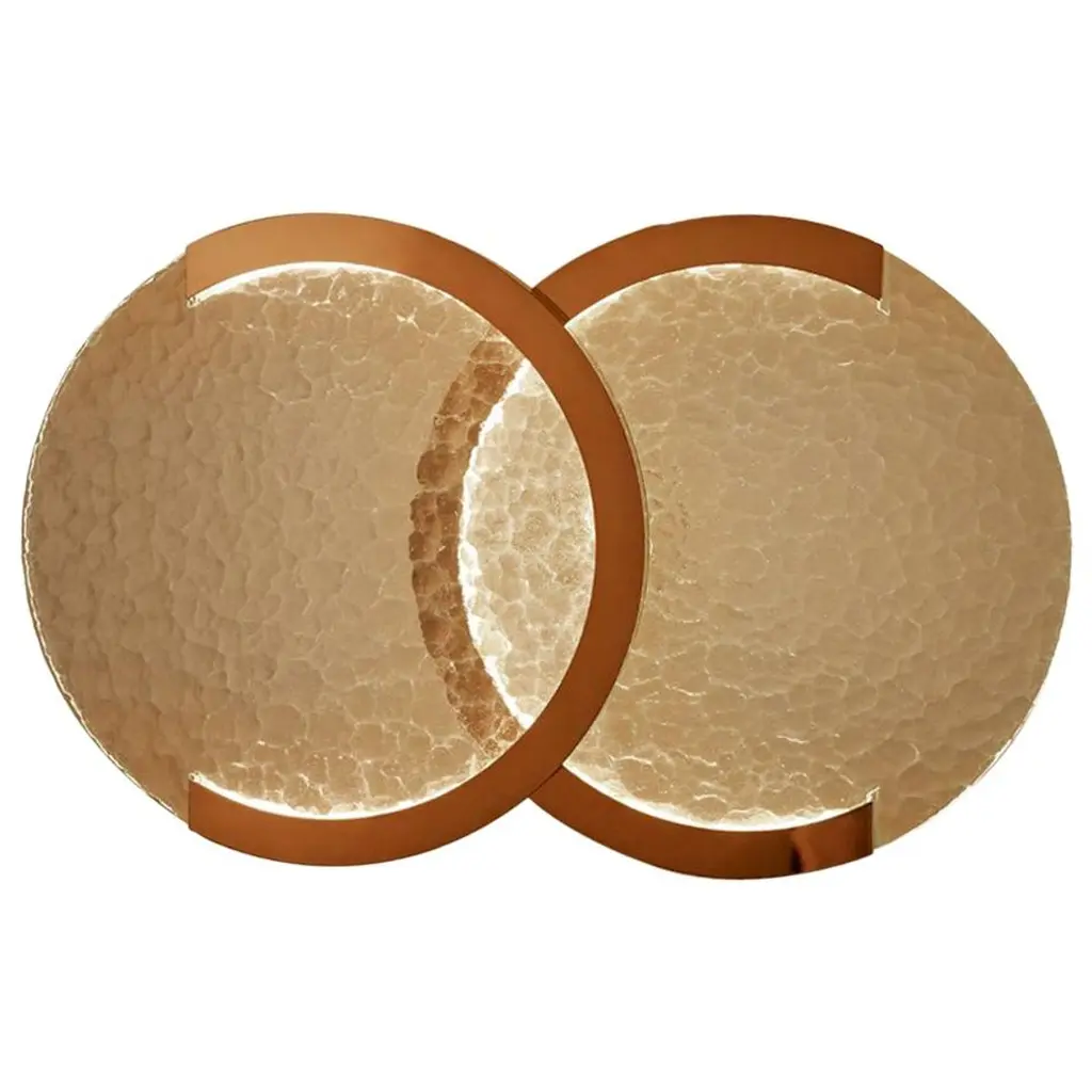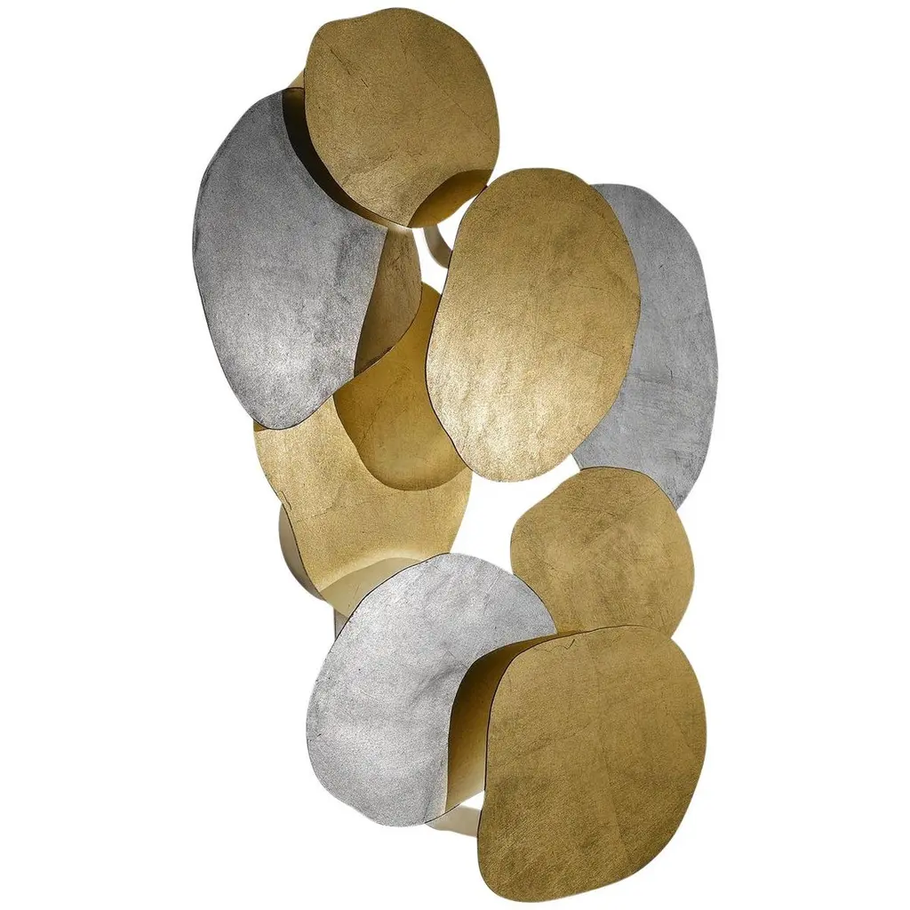 This versatile piece can be a wall lamp or a chandelier and is comprised of three hand-worked modular metal sheets arranged to create a functional sculpture. This lamp has three LED lights and a finish in gold and silver leaf.