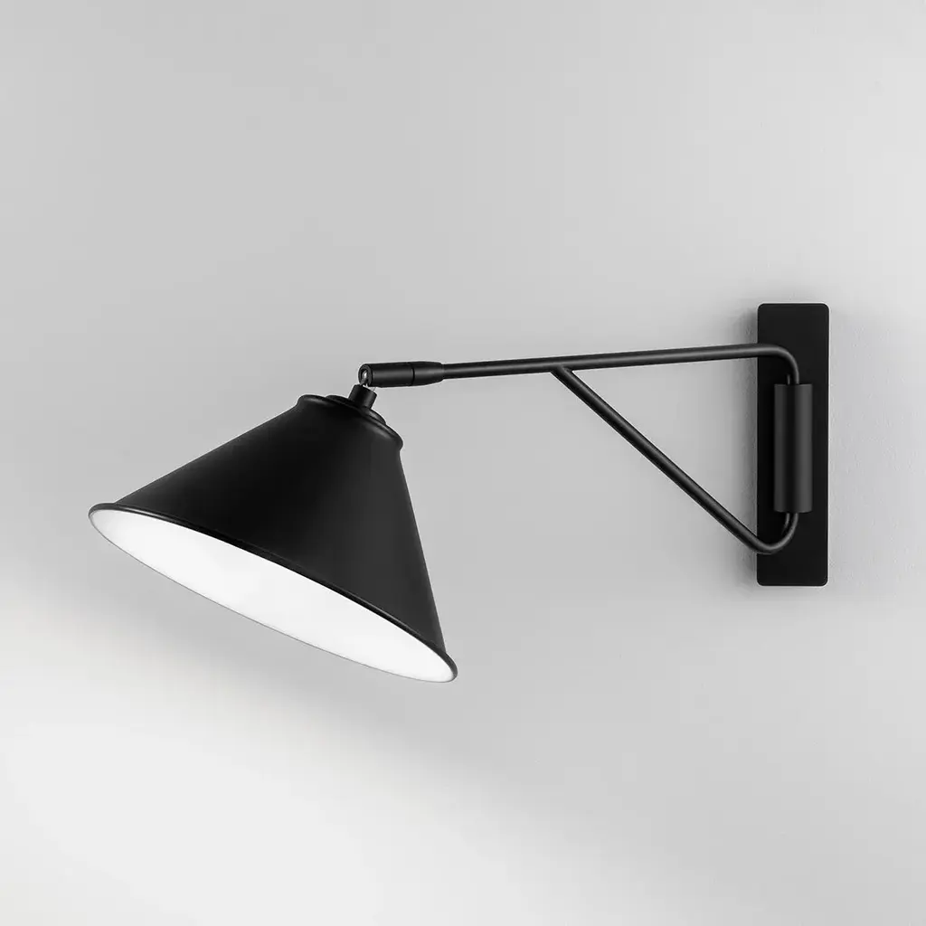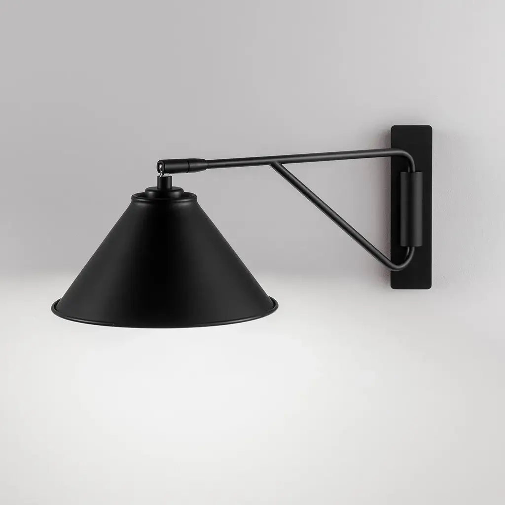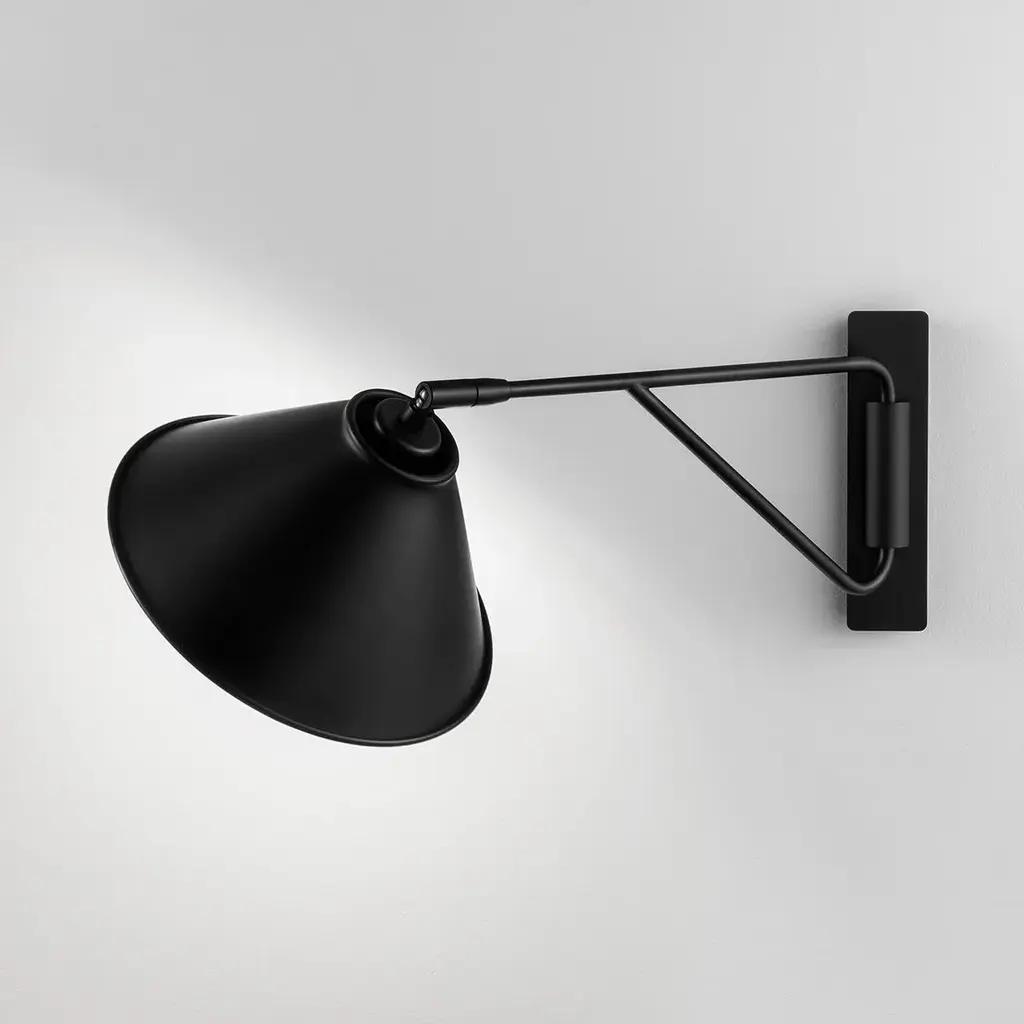 An Ideal Bedside Wall Light Featuring A Shallow Rectangular Backplate Which Has A Front Cylindrical Section Through Which The Arm Passes Allowing Full Left/right Rotation With Inbuilt Stops To Prevent The Shade Touching The Wall. The Head Swivels In Every Direction To Give Perfect Light Distribution. Satin Black Metal Shade Has Rolled Edges.