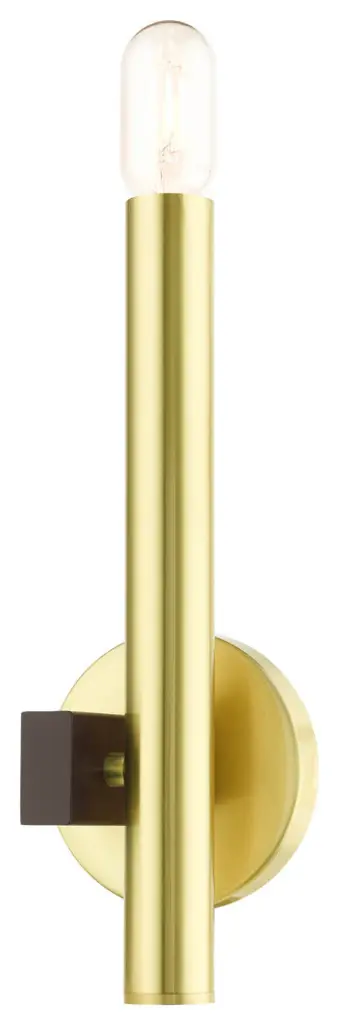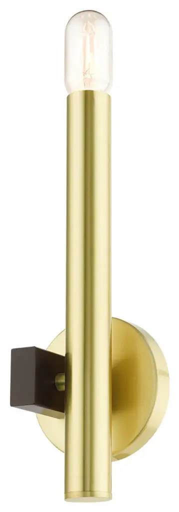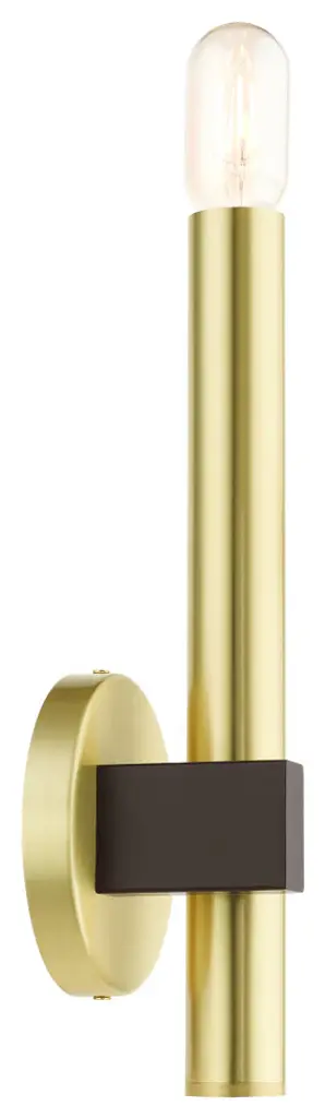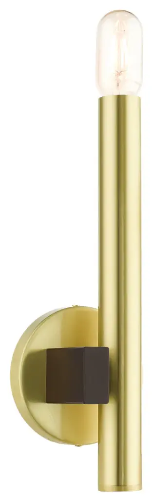 The dramatic lines of the Helsinki collection remind of early modern Scandinavian style. The massive candles rise on the contrasting bar at different heights dynamically emulating the shape of a city skyline. This single light exposed bulb sconce comes in a satin brass finish accented with a bronze finish bar. Great for any space where dramatic statement is needed such as a bathroom, hallway, dining room, living room or bedroom.Bulb Type: Medium BaseNumber of Bulbs: 1Bulbs Included?: NoUL Listed: ETLBulb Wattage: 60Hardwire or Plug: Hardwire