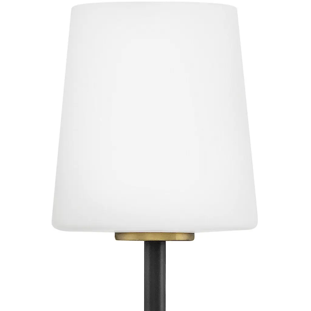 Saunders boasts a striking yet effortless appeal, blending traditional elements with captivating, mid-century modern details. A spoked silhouette and decorative stem holders are finished in Black and Lacquered Brass, paired with blown, etched opal glass shades.