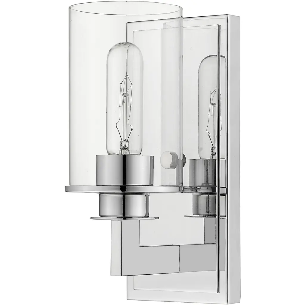 Bold contemporary style gives this mid-century modern one-light wall sconce sophisticated elegance. A chrome finish underscores the luminous brightness of the clear glass cylinder-shaped shade.