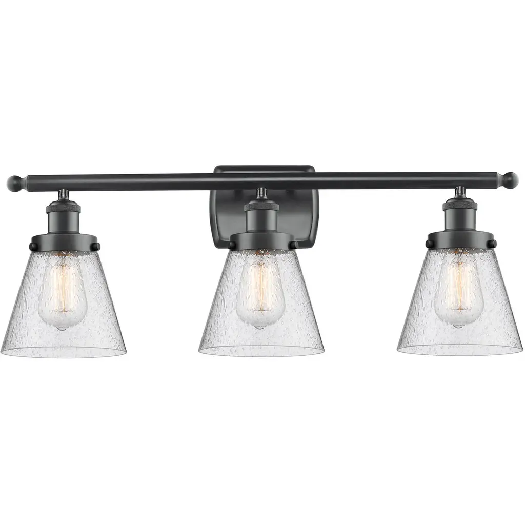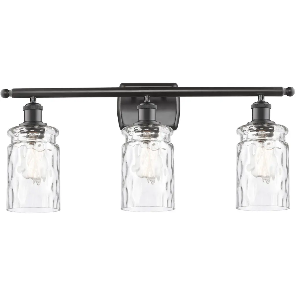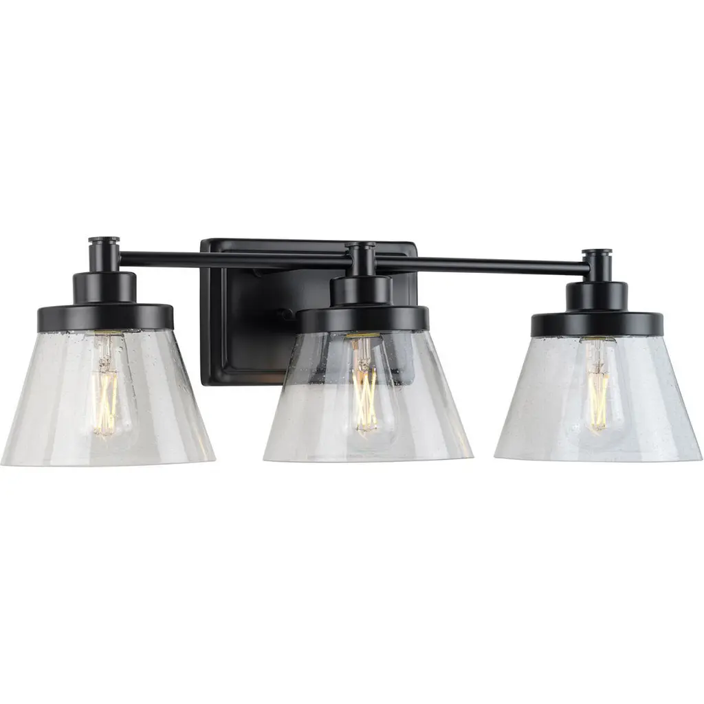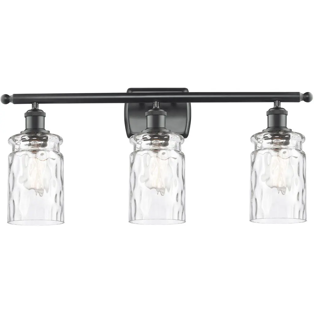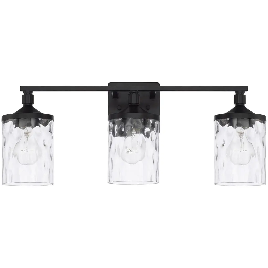 The Albany Collection's rippling water glass shades add shimmering beauty to any bath décor. Measuring 24" wide x 11 3/8" high x 6¾" extension, this three-light bath bar in a black finish provides ample illumination from three 60-watt Edison-base bulbs. Material: Glass, Finish Color: Black, Width: 24", Height: 11.38", Depth: 7.63", Backplate Width: 8", Backplate Length: 4.5", Lamping Type: Incandescent, Number Of Bulbs: 3, Wattage: 60 Watts, Dimmable: Yes, Moisture Rating: Damp Rated