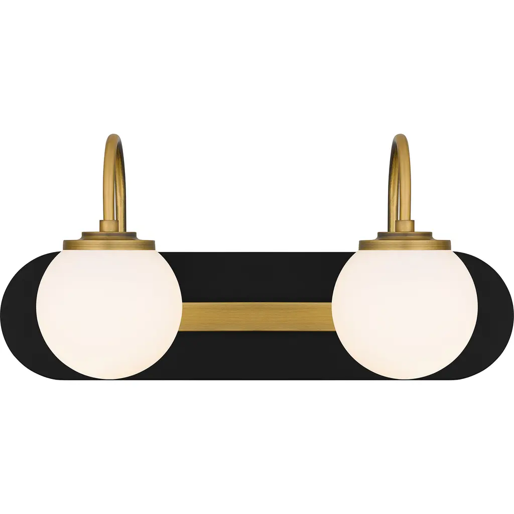 Collection: Alhambra, Material: Metal, Finish Color: Matte Black/Warm Brass, Width: 24.5", Height: 7.75", Depth: 7", Backplate Width: 12.75", Backplate Length: 4.75", Lamping Type: Incandescent, Number Of Bulbs: 3, Wattage: 60 Watts, Dimmable: Yes, Moisture Rating: Damp Rated, Desc: Art Deco style is reinvented in this chic Savoy House Alhambra 3-light bath bar. Orbs of soft frosted glass held on slender arms sit in front of a rectangular backplate accentuated by circles that frame the glass beautifully. A Matte Black and Warm Brass finish makes the perfect pairing. This bath bar is 7.75" in height, 24.5" in width and extends 7" from the wall. Uses three candelabra size bulbs of up to 60 watts per bulb. Bulbs not included. This bath light is damp area rated and must be installed as shown.,