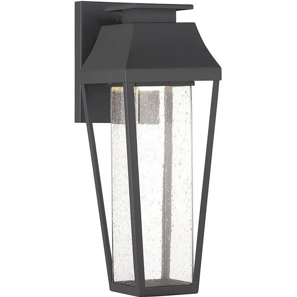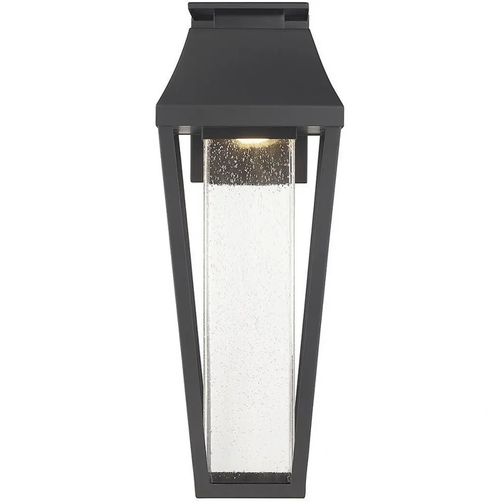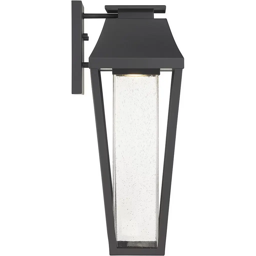 From Savoy House, the Brookline 1-light outdoor wall light showcases a more contemporary take on classic lantern-style illumination with a central column of clear seeded glass illuminated by integrated LED light. The matte black finish adds versatility. Brookline is 20" in height, 7.25" in width and extends 9" from the wall.