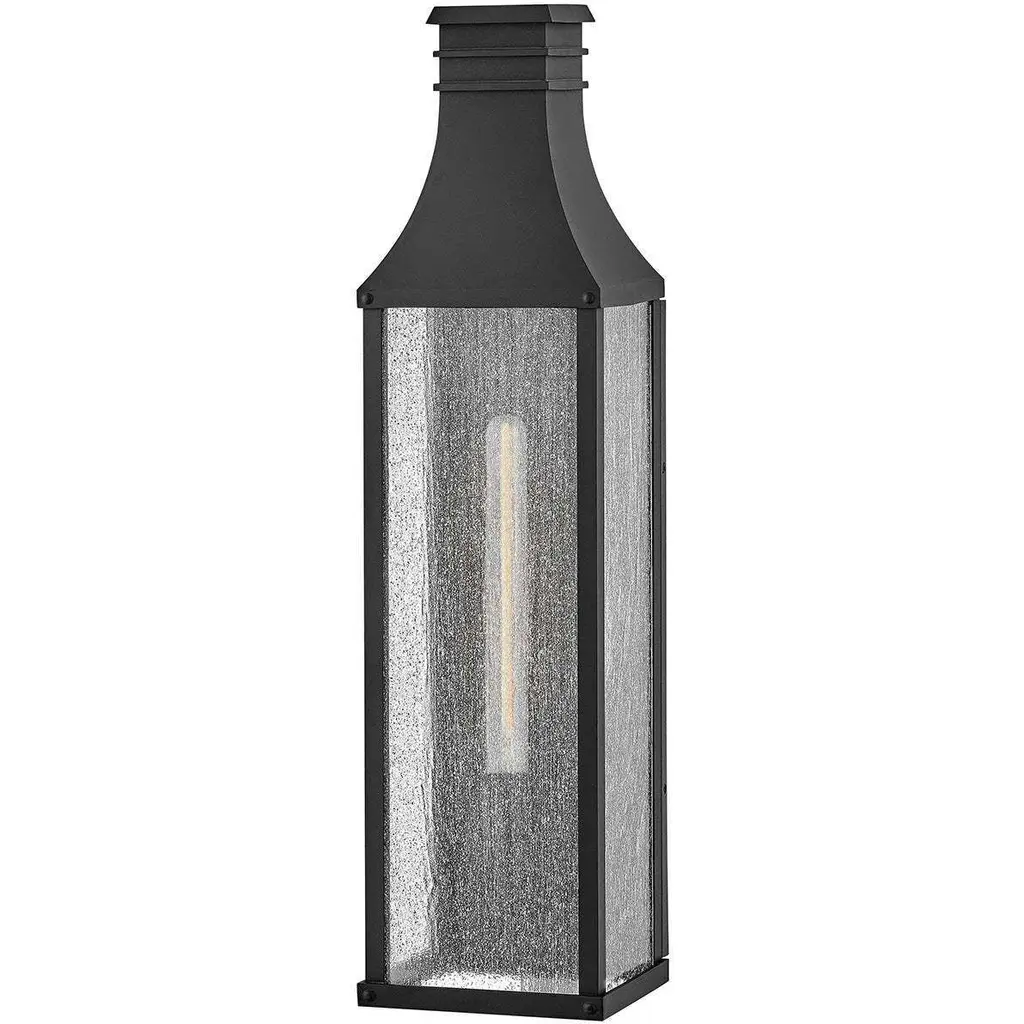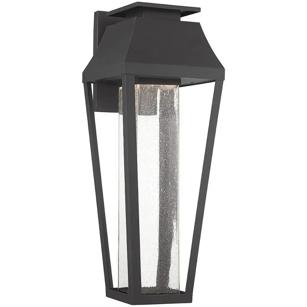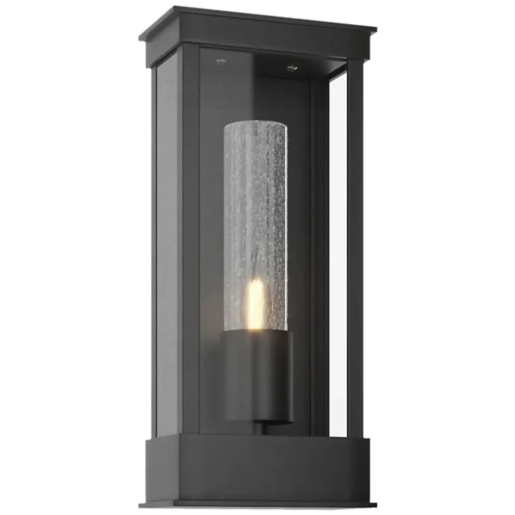 From Savoy House, the Brookline 1-light outdoor wall light showcases a more contemporary take on classic lantern-style illumination with a central column of clear seeded glass illuminated by integrated LED light. The matte black finish adds versatility. Brookline is 20" in height, 7.25" in width and extends 9" from the wall.