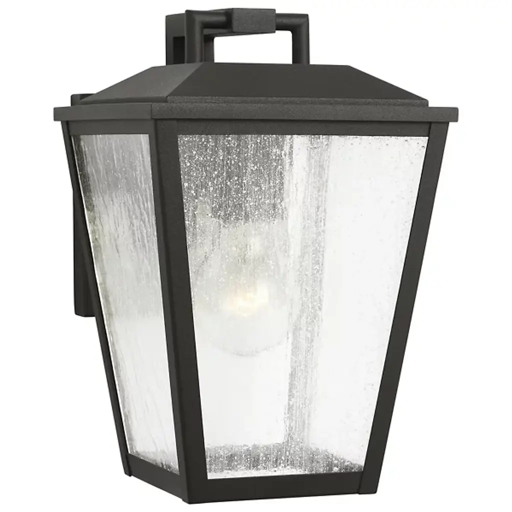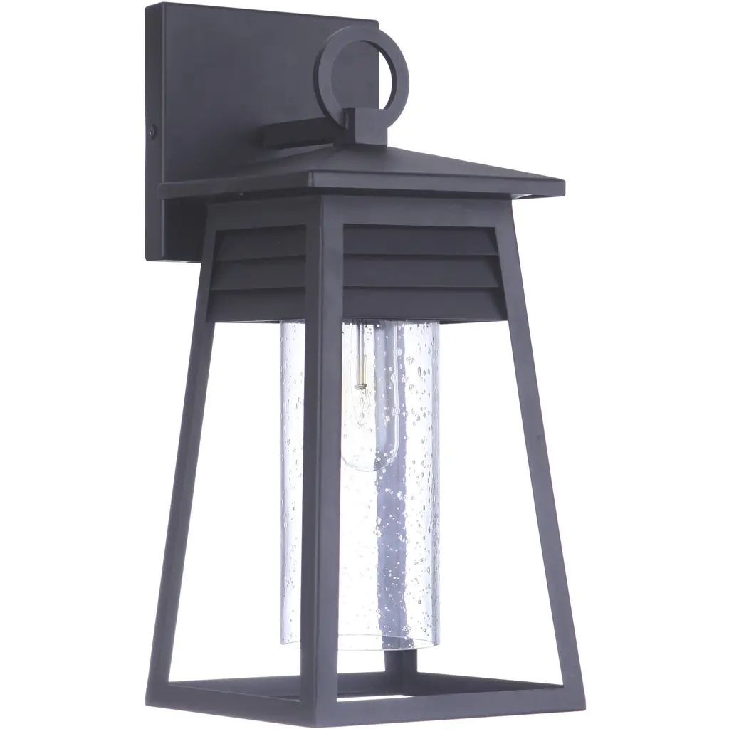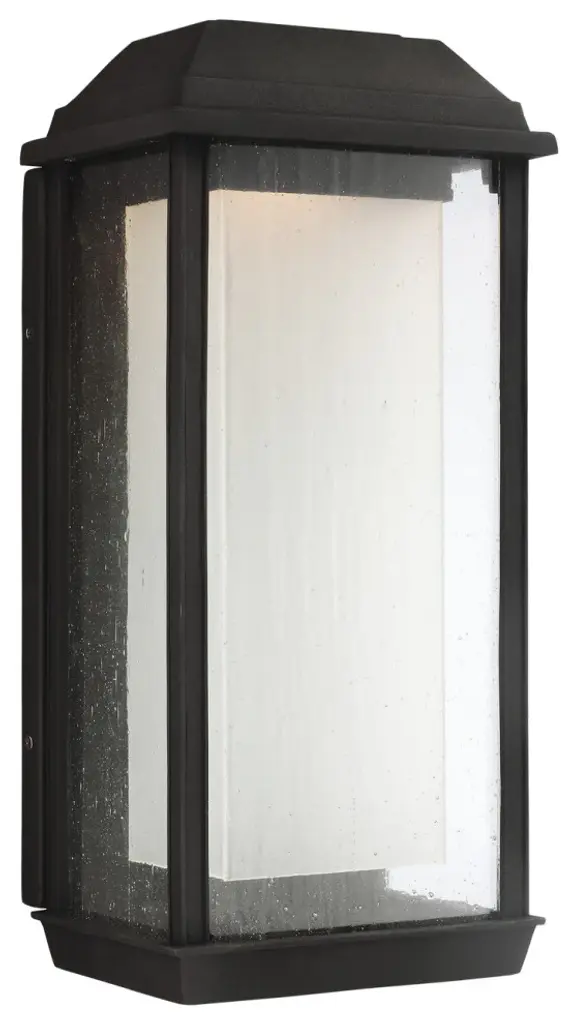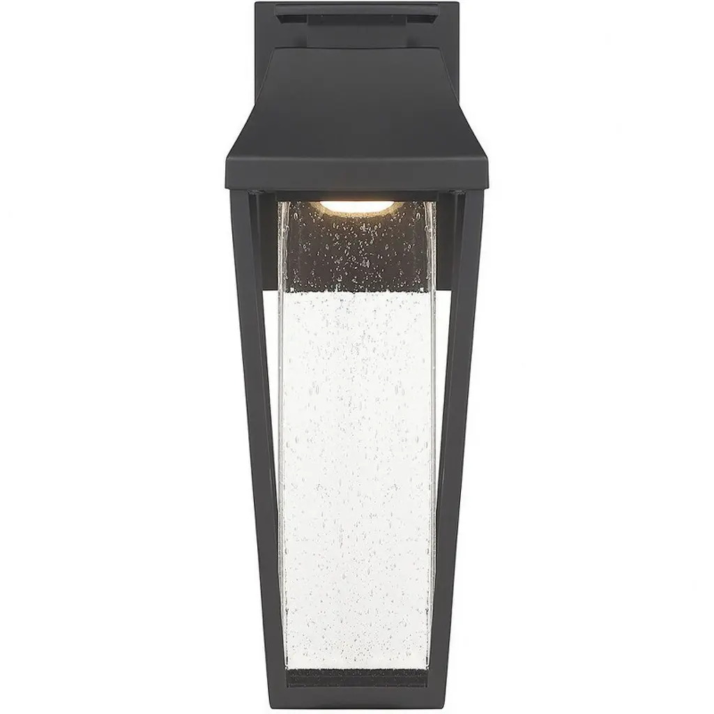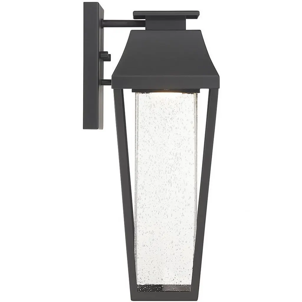 From Savoy House, the Brookline 1-light outdoor wall light showcases a more contemporary take on classic lantern-style illumination with a central column of clear seeded glass illuminated by integrated LED light. The matte black finish adds versatility. Brookline is 15" in height, 5.50" in width and extends 6.75" from the wall.
