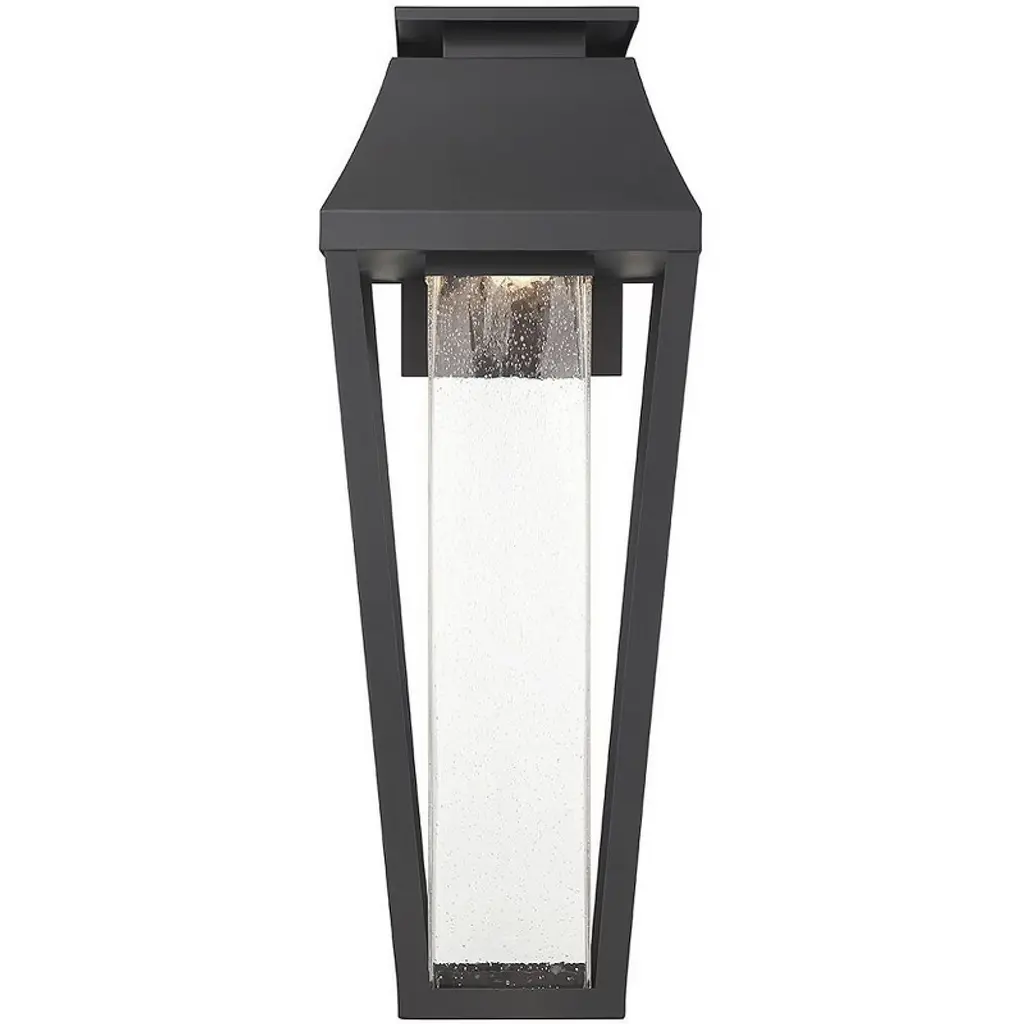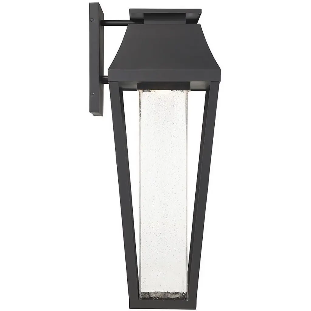 From Savoy House, the Brookline 1-light outdoor wall light showcases a more contemporary take on classic lantern-style illumination with a central column of clear seeded glass illuminated by integrated LED light. The matte black finish adds versatility. Brookline is 32.25" in height, 12" in width and extends 14" from the wall.