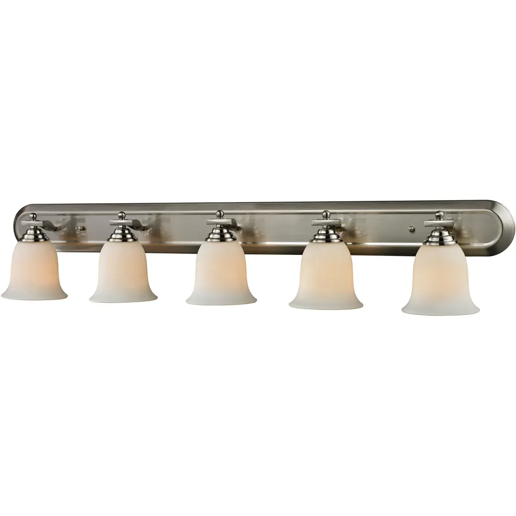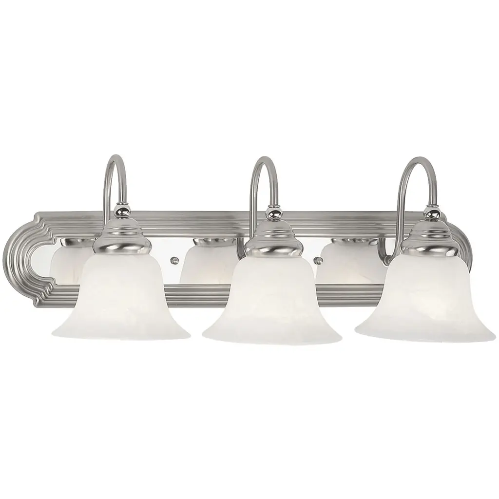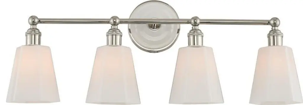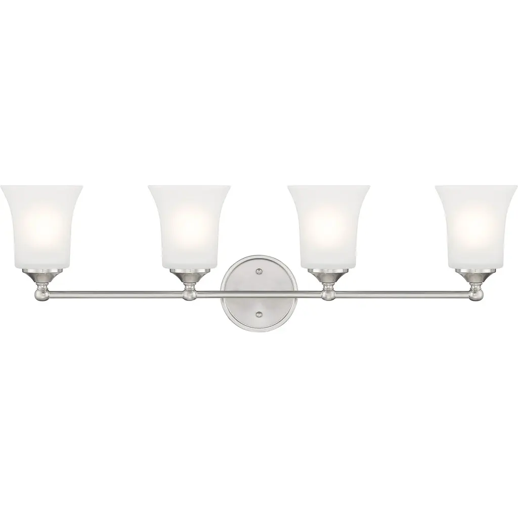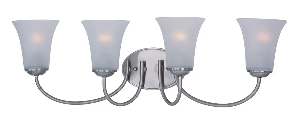 For a variety of bathroom spaces in satin nickel finish - GL764 glass sold separately. Material: Metal, Finish Color: Satin Nickel, Width: 31", Height: 9", Length: 31", Depth: 7.75", Backplate Width: 4.13", Backplate Length: 4.13", Lamping Type: Incandescent, Number Of Bulbs: 4, Wattage: 60 Watts, Dimmable: Yes, Moisture Rating: Damp Rated
