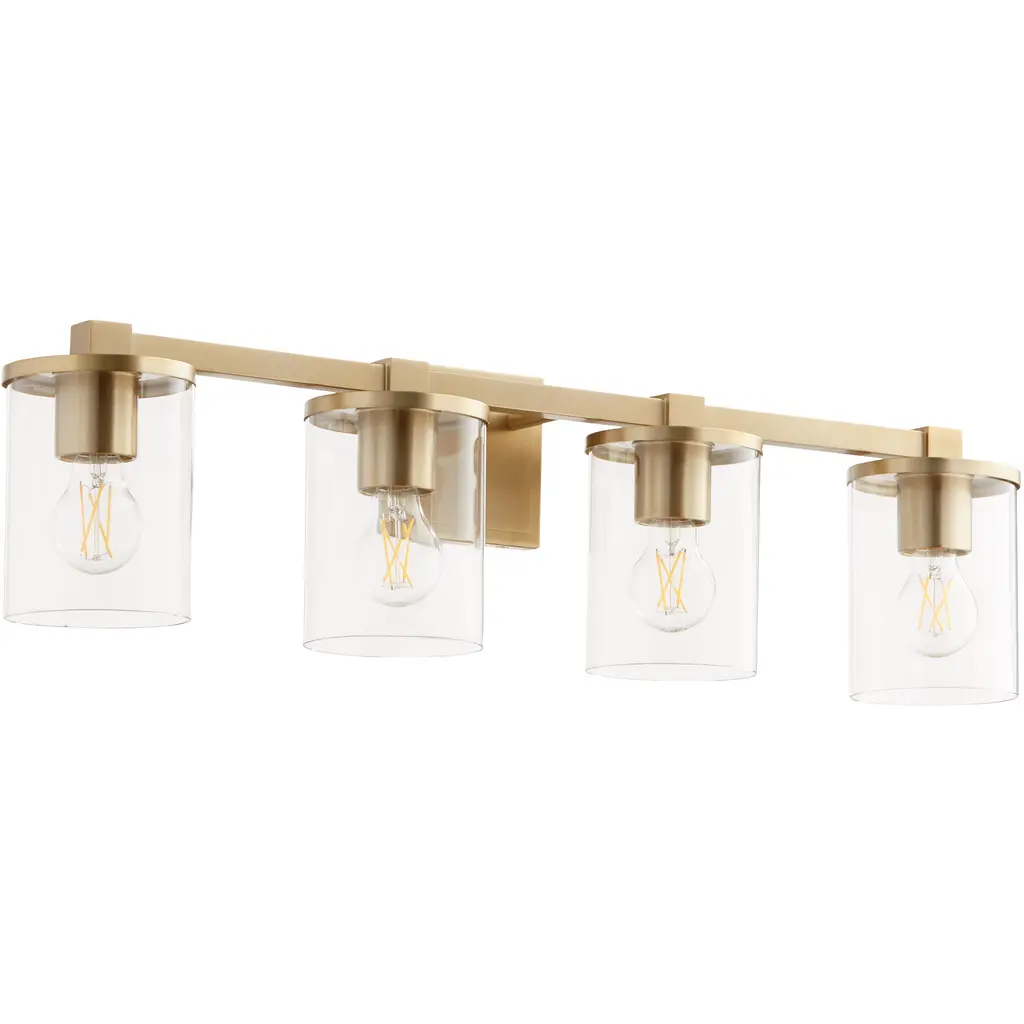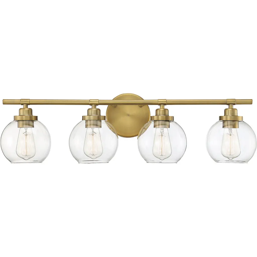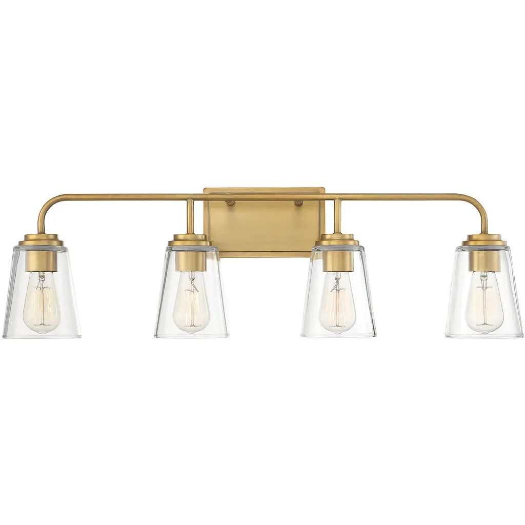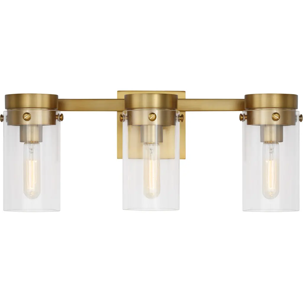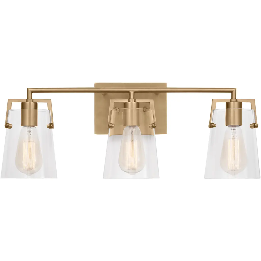 The linear lines of the Calhoun draw the eye to its symmetrical beauty with a warm brass finish and clear glass shades. Measuring 24" wide x 8 ¾" high x 6-3/8" extension, this three-light bath bar provides ample illumination from three 60-watt Edison-base bulbs. Material: Glass, Finish Color: Warm Brass, Width: 24", Height: 8.75", Depth: 6.38", Backplate Width: 0.75", Backplate Length: 4.5", Lamping Type: Incandescent, Number Of Bulbs: 3, Wattage: 60 Watts, Dimmable: Yes, Moisture Rating: Damp Rated