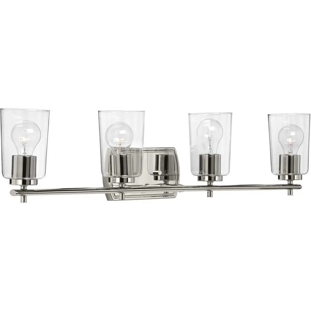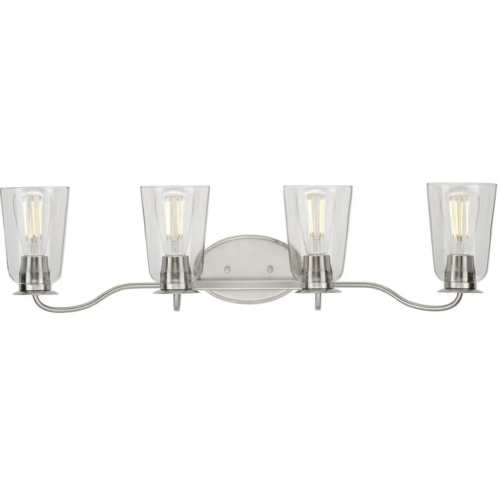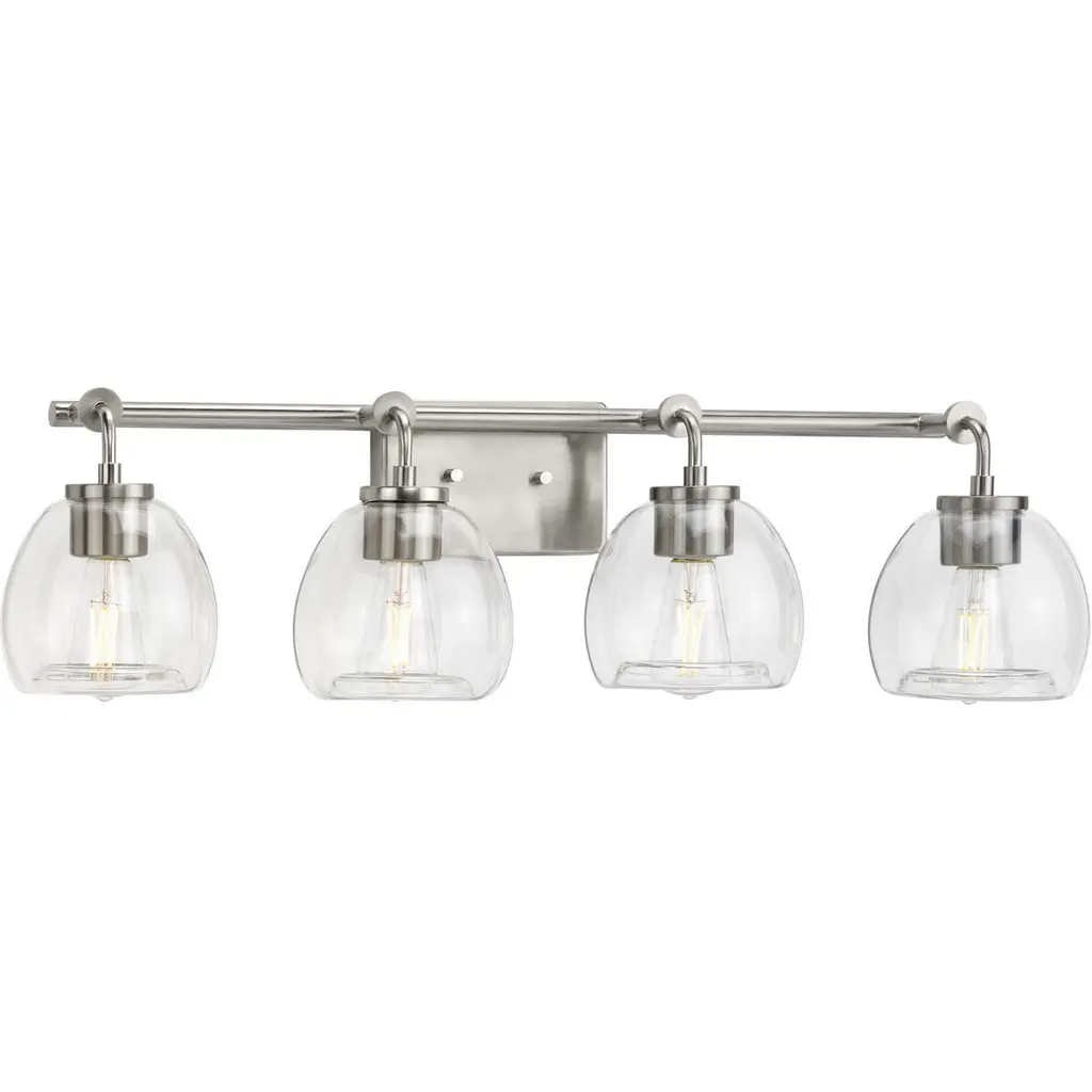 Brighten up your bath with the sleek and contemporary look of the Calhoun bath bar. The fixture’s frame has a rectangular wall plate, bold-lined light bar, and chunky, cylindrical bulb sockets —all with an elegant, brushed pewter-like, satin nickel finish. And the tapered cone shades are made of pristine, clear glass. Altogether it has a stylish, clean, and neutral appearance that blends well with other hardware in your contemporary, modern, bohemian, or transitional decor. Four 60W, E-style bulbs provide plenty of illumination above the vanity. This Calhoun bath bar is 32” wide, 9” high, and extends 6.5” from the wall. Plus, it may be mounted as either uplight or downlight: a superb and stylish choice for your bathroom or powder room.