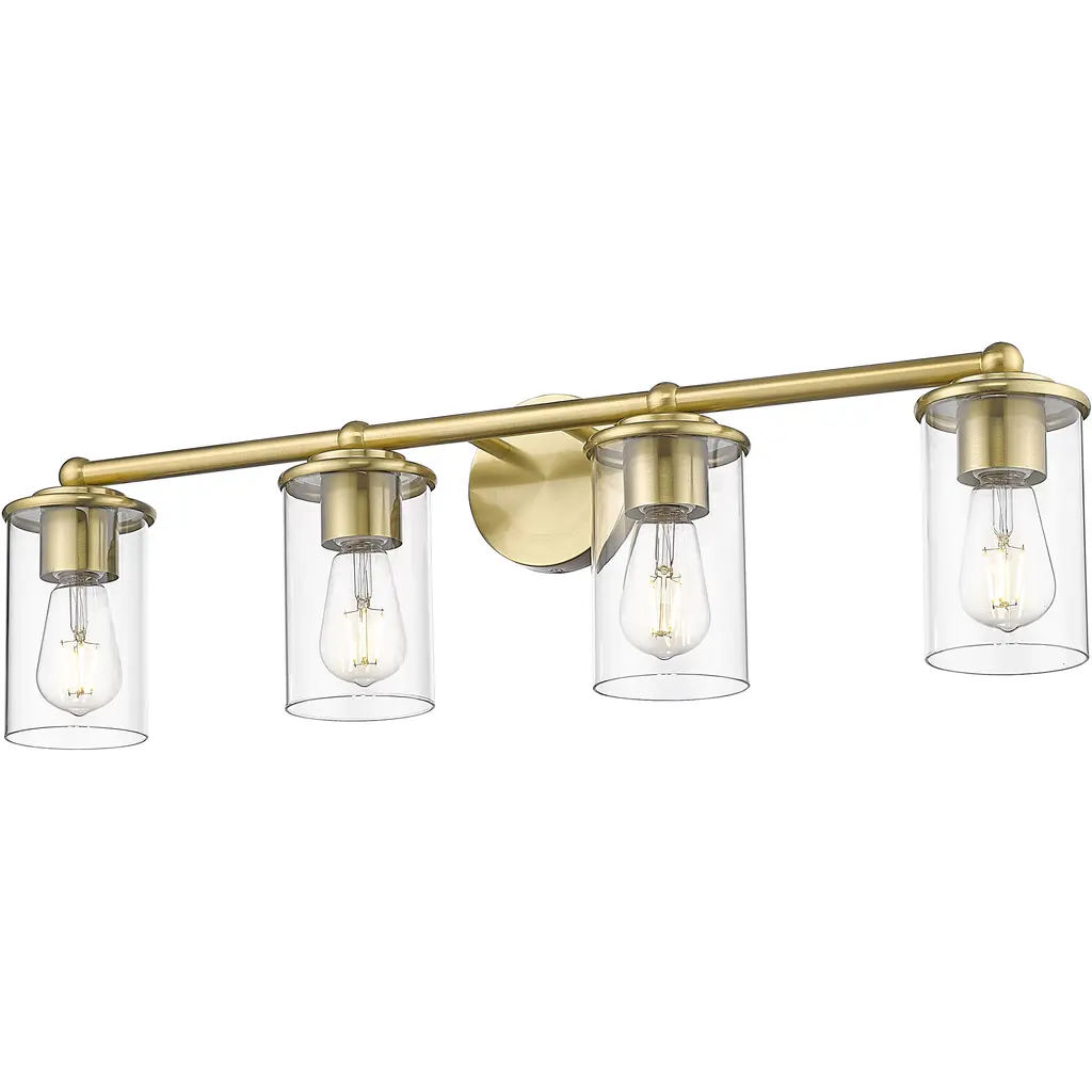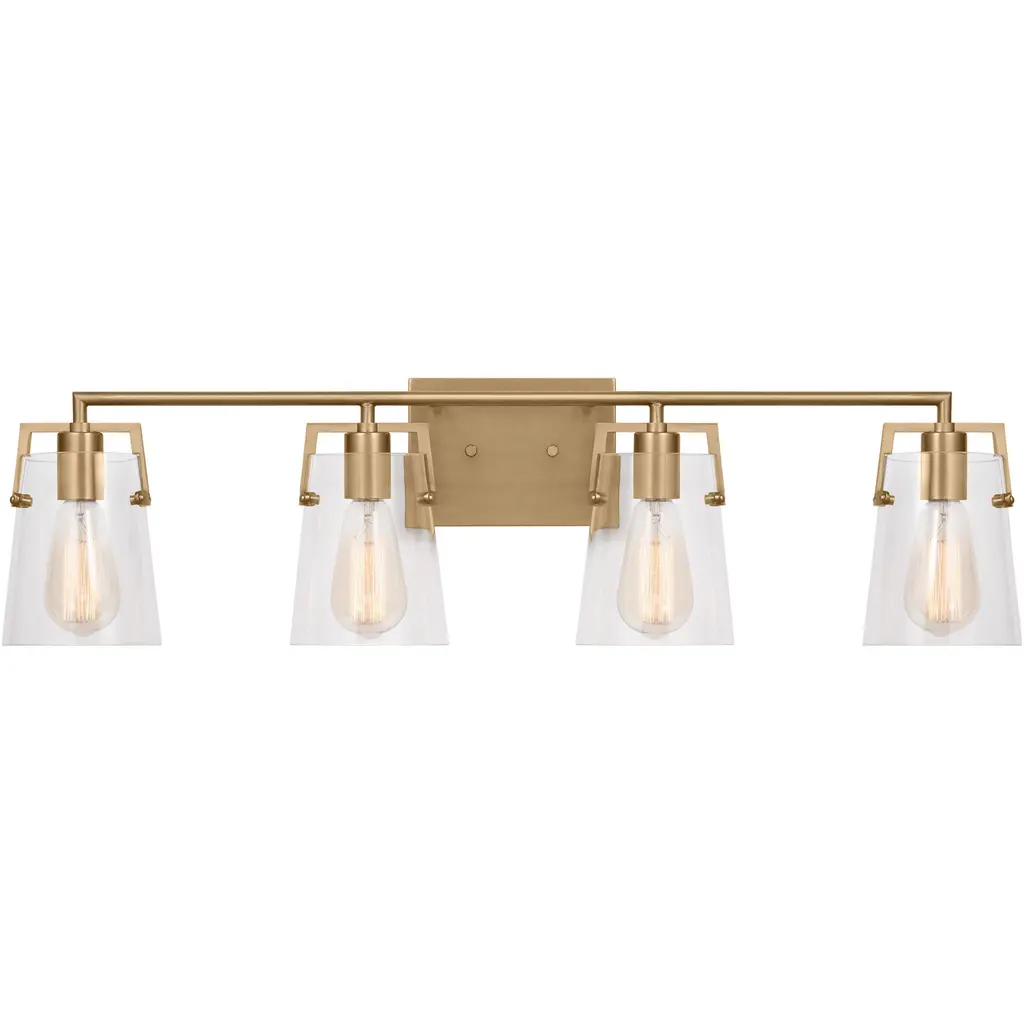 The linear lines of the Calhoun draw the eye to its symmetrical beauty with a warm brass finish and clear glass shades. Measuring 32" wide x 8 ¾" high x 6-3/8" extension, this four-light bath bar provides ample illumination from four 60-watt Edison-base bulbs. Material: Glass, Finish Color: Warm Brass, Width: 32", Height: 8.75", Depth: 6.38", Backplate Width: 0.75", Backplate Length: 4.5", Lamping Type: Incandescent, Number Of Bulbs: 4, Wattage: 60 Watts, Dimmable: Yes, Moisture Rating: Damp Rated