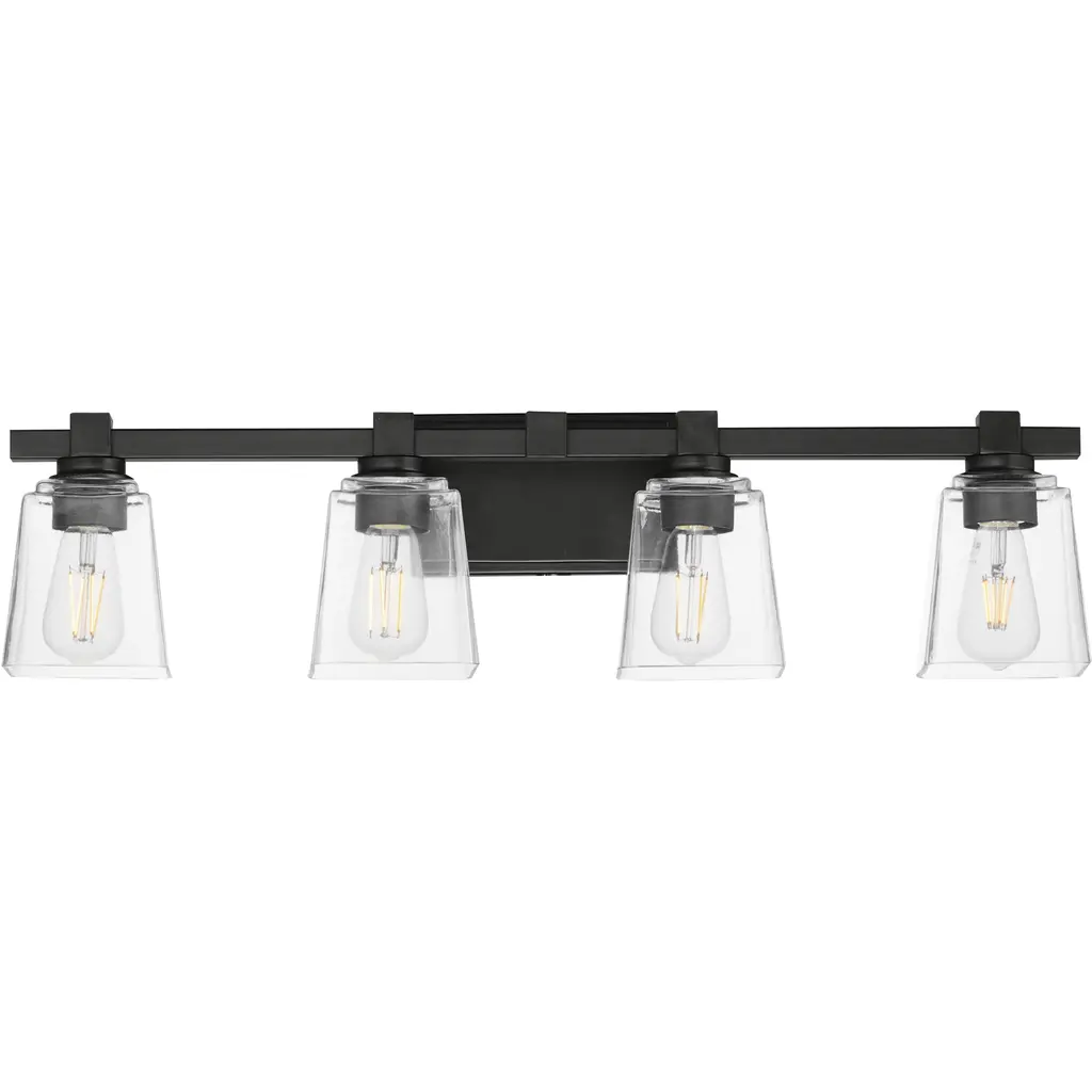 Four Light Bath Bar from Calhoun collection in Black finish. Number of Bulbs 4. Max Wattage 60.00. No bulbs included. Brighten up your bathroom vanity with the sleek look of the Calhoun 4-light bath bar. Its tapered clear glass shades and matte black finish make a perfect match. No UL Availability at this time.