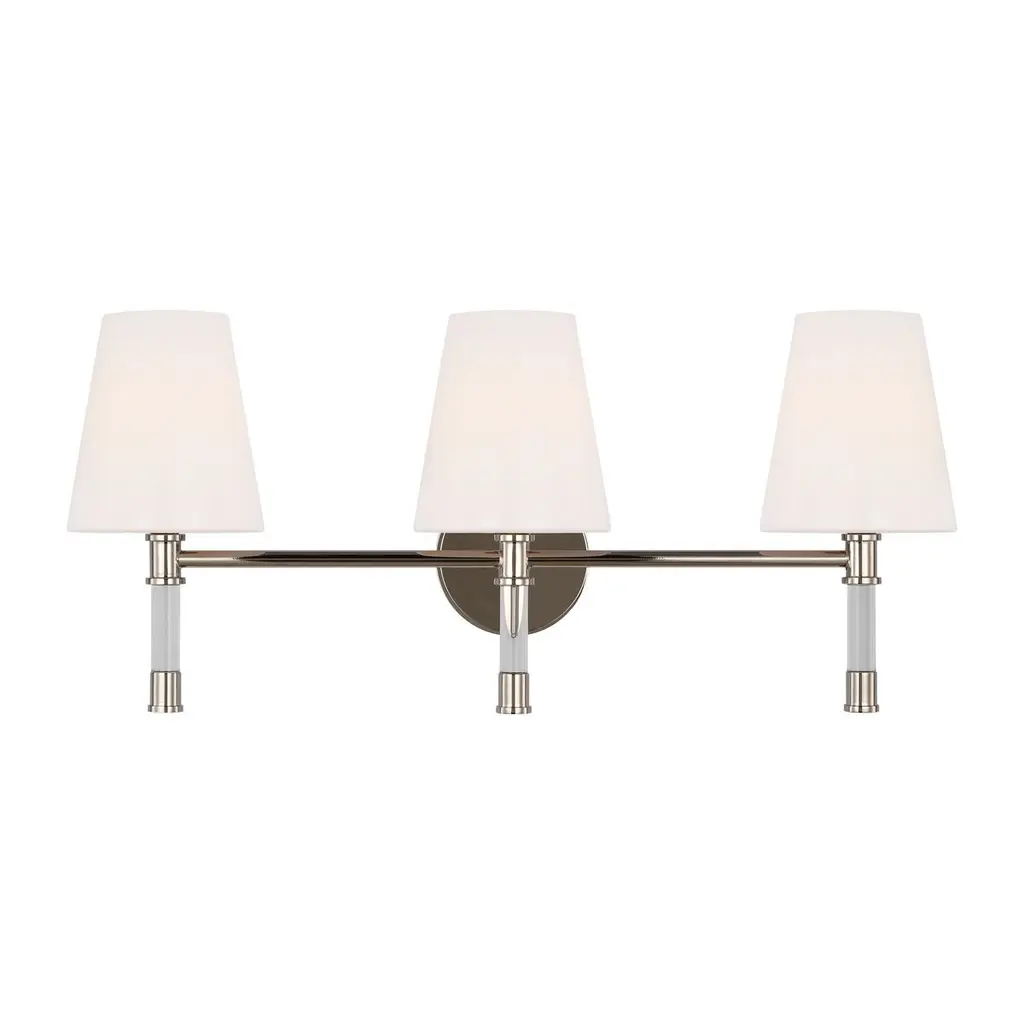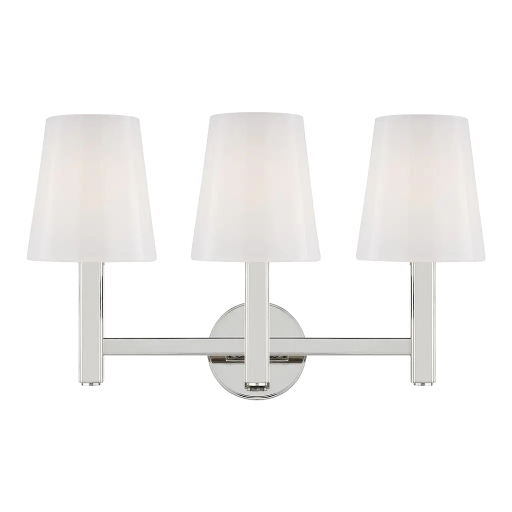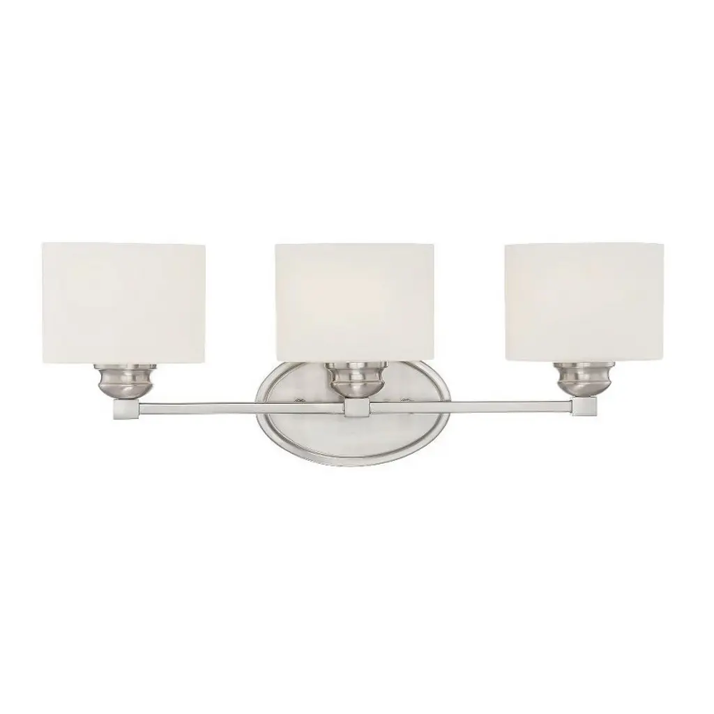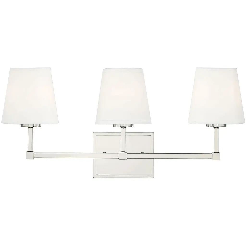 Three Light Bath Bar from Cameron collection in Polished Nickel finish. Number of Bulbs 3. Max Wattage 40.00 . No bulbs included. Bring the understated, classic beauty of the Savoy House Cameron 3-light bath bar into your home to create a thoughtful accent in any bathroom. This vanitylight features slender, dramatically-curving arms topped with tall, tapered white fabric shades, ensuring a flattering glow. The faceted backplate adds another dimension of style, too. Finished in polished nickel. This fixture is 24`` wide and 12`` tall. It extends 8`` from the wall. Uses 3 candelabra size bulbs of up to 40 watts each (not included). No UL Availability at this time.