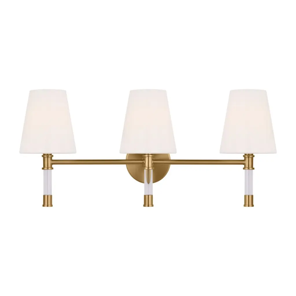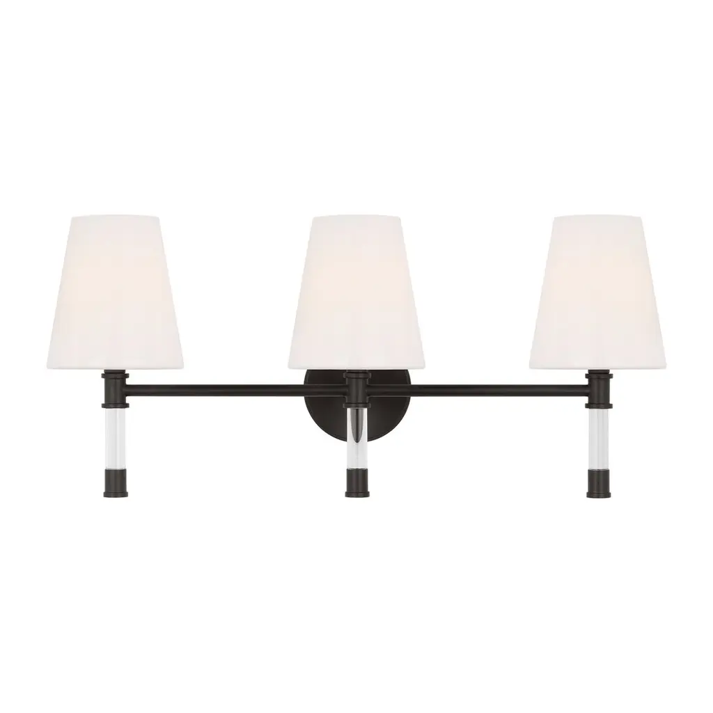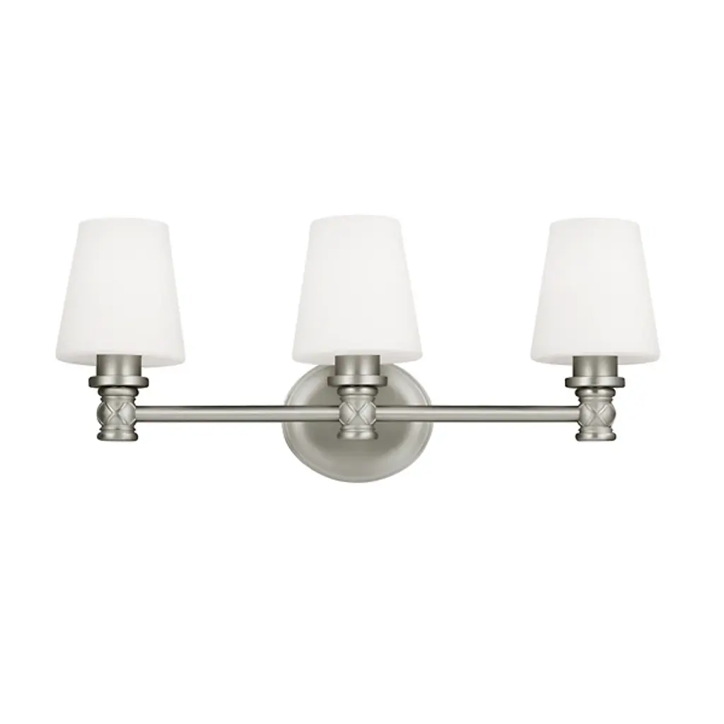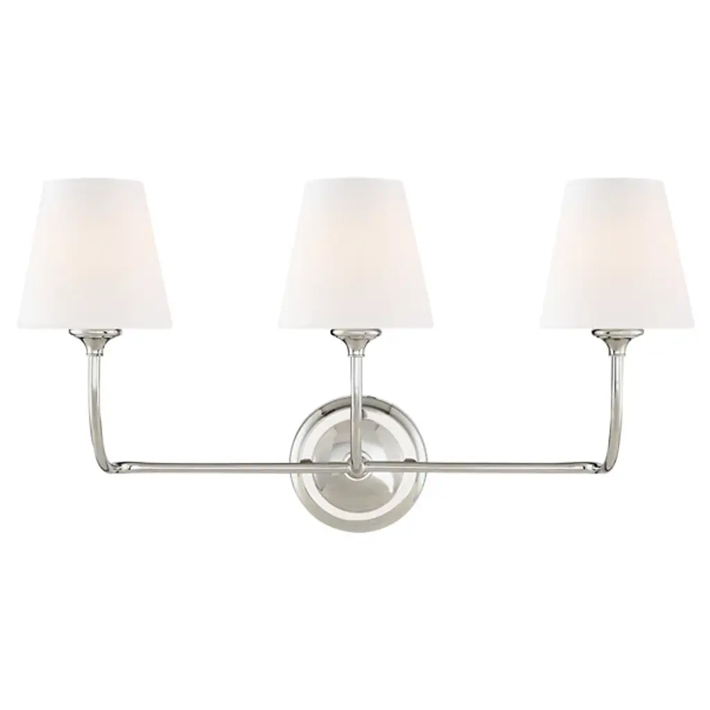 Three Light Bath Bar from Cameron collection in Polished Nickel finish. Number of Bulbs 3. Max Wattage 40.00 . No bulbs included. Bring the understated, classic beauty of the Savoy House Cameron 3-light bath bar into your home to create a thoughtful accent in any bathroom. This vanitylight features slender, dramatically-curving arms topped with tall, tapered white fabric shades, ensuring a flattering glow. The faceted backplate adds another dimension of style, too. Finished in polished nickel. This fixture is 24`` wide and 12`` tall. It extends 8`` from the wall. Uses 3 candelabra size bulbs of up to 40 watts each (not included). No UL Availability at this time.