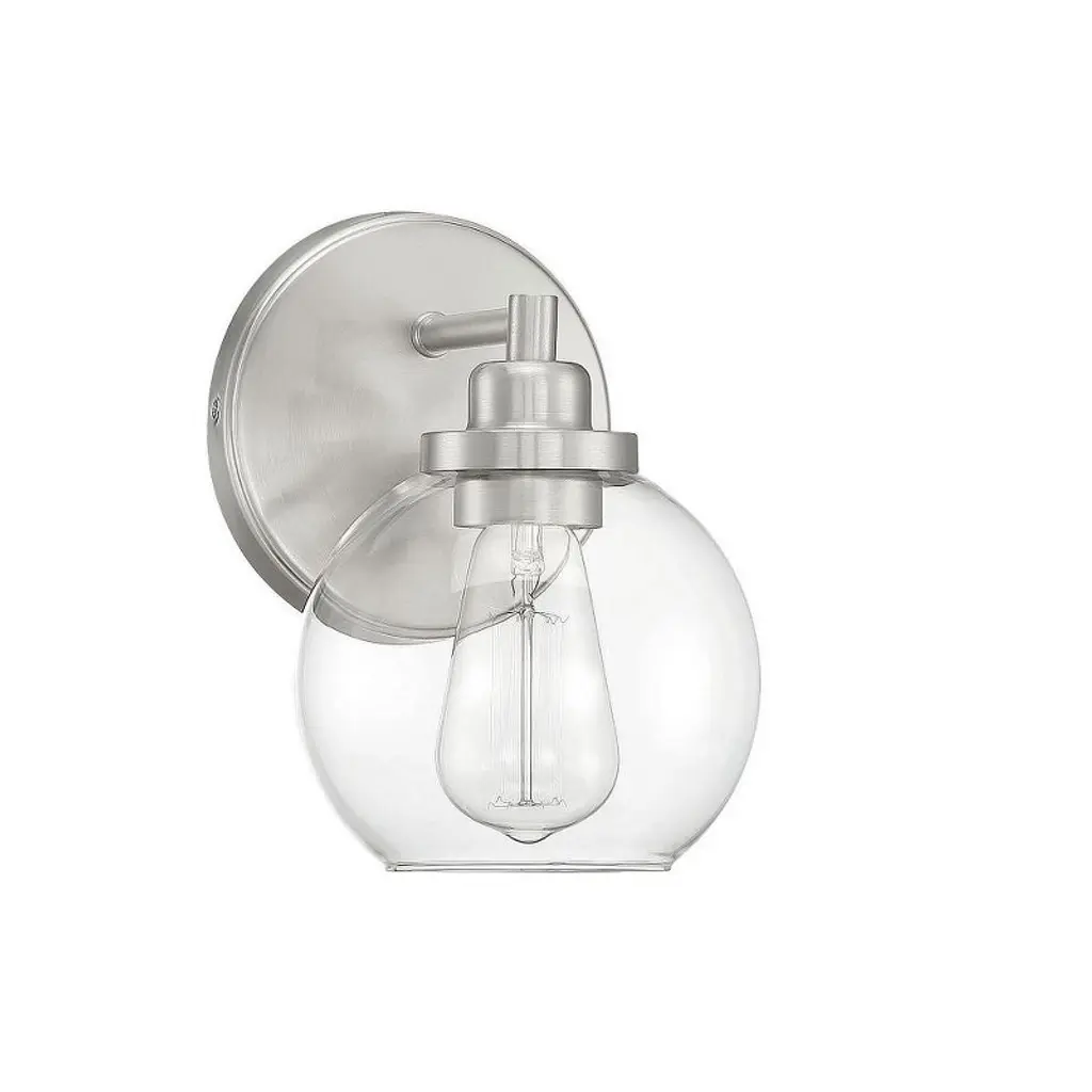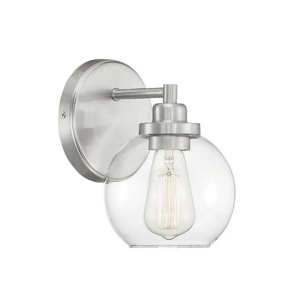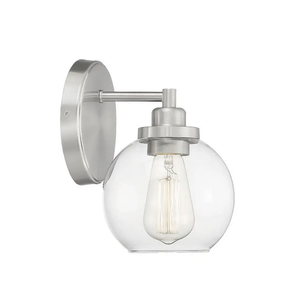 Adding the Savoy House Carson 1-light sconce easily helps you boost the illumination and the style of any room or space. Its fishbowl-style clear glass shade makes a big statement and is open at the bottom, making it easy to replace the bulb. The streamlined structure offers up subtle detailing with a mid-century modern vibe and the circular backplate echoes the shape of the glass shade. Finished in satin nickel. Carson is great for bathrooms, hallways, bedsides, stairways, kitchens and more. This fixture is 5.5" wide and 8.5" tall. It extends 7" from the wall. Uses a standard size bulb of up to 60 watts (not included).