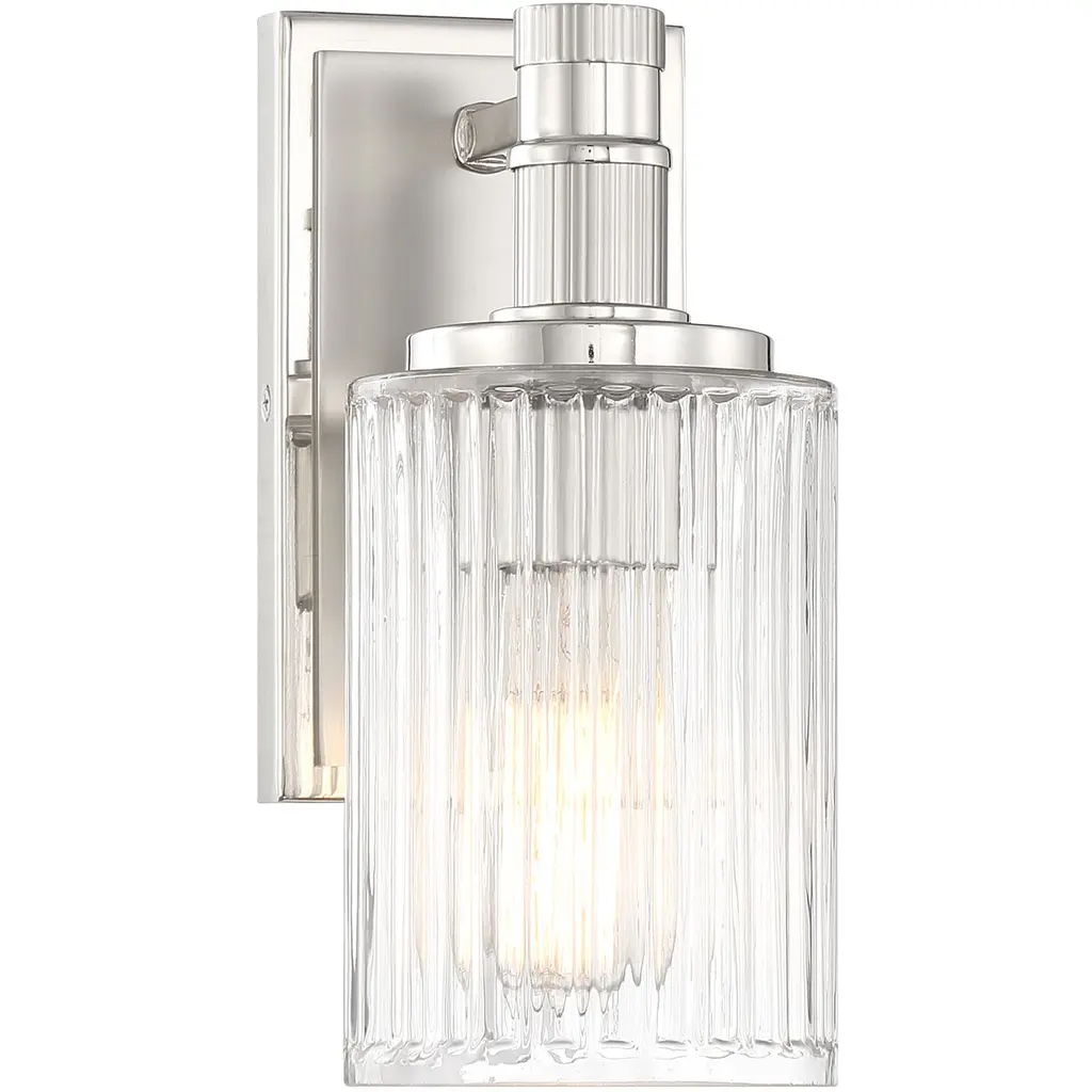 Collection: Concord, Material: Glass, Finish Color: Silver/Polished Nickel, Width: 4.5", Height: 10.5", Depth: 6.5", Backplate Width: 4.33", Backplate Length: 7.87", Lamping Type: Incandescent, Number Of Bulbs: 1, Wattage: 60 Watts, Dimmable: Yes, Moisture Rating: Damp Rated, Desc: Add a big dose of shimmer with the Concord 1-light sconce from Savoy House. Its ribbed glass shade is paired with ribbed detailing on the arm, boosting the inviting texture. The Matte Black and Warm Brass finish helps every element shine. Concord is 10.5" in height, 4.5" in width and extends 6.5" from the wall. Uses one standard size bulb of up to 60 watts. The bulb is not included. Damp area rated. Must be installed as shown.,