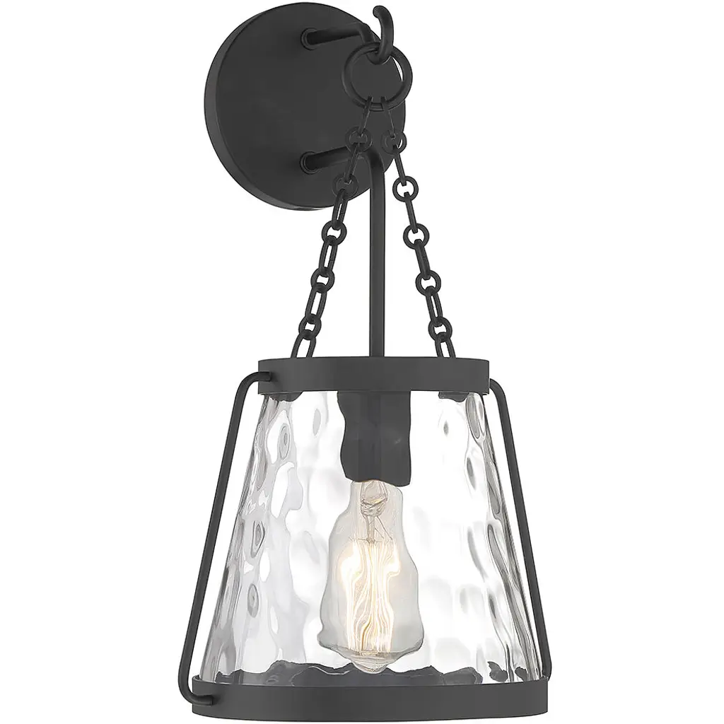 The Savoy House Crawford 1-light wall sconce proves that a classic style can be stunning! A lantern-inspired shade of clear water glass hangs down from an understated structure with industrial-inspired details. Finished in satin nickel. Crawford is 17.25" in height, 10" in width and extends 9.25" from the wall. It uses 1 standard size bulb with a max of 60 watts (bulb not included).