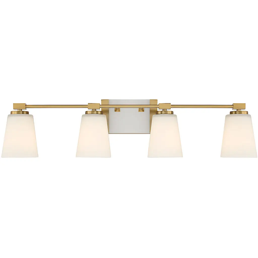 Add a relaxing spa feeling to any bathroom with the Savoy House Darby 3-light bath vanity light! White glass shades offer up a soft yet flattering glow while a matching pane of white glass creates a serene floating effect. Finished in warm brass. Darby is 8" in height, 25.25" in width and extends 7" from the wall. Uses three standard size bulbs of up to 60 watts per bulb (bulbs not included).