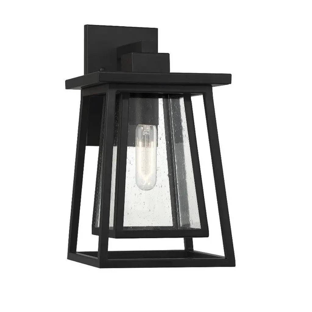 Boost your curb appeal and create a great first impression with the Craftsman-inspired style of the Savoy House Denver 1-light outdoor wall lantern. Clear seedy glass and a matte black finish make Denver a great choice for lighting up today's fashionable homes. This fixture is 18" in height, 10" in width and extends 11" from the wall. It uses one standard size bulb with a max of 60 watts. Wet area rated.