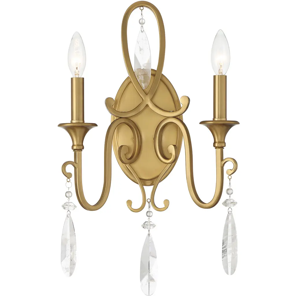 Collection: Fairchild, Material: Metal, Finish Color: Warm Brass, Width: 12", Height: 19.5", Depth: 5.25", Backplate Width: 5", Backplate Length: 8", Lamping Type: Incandescent, Number Of Bulbs: 2, Wattage: 60 Watts, Dimmable: Yes, Moisture Rating: Damp Rated, Desc: Intricate and elegant, the Savoy House Fairchild 2-light sconce adds ornate beauty to any room. The curlicue arms are decorated with crystal adornments, including large faux rock drops that bring an exciting hint of natural inspiration. Finished in Warm Brass. Fairchild is 19.5" in height, 12" in width and extends 5.25" from the wall. Uses two candelabra size bulbs of up to 60 watts per bulb. Bulbs not included. Damp area rated.,
